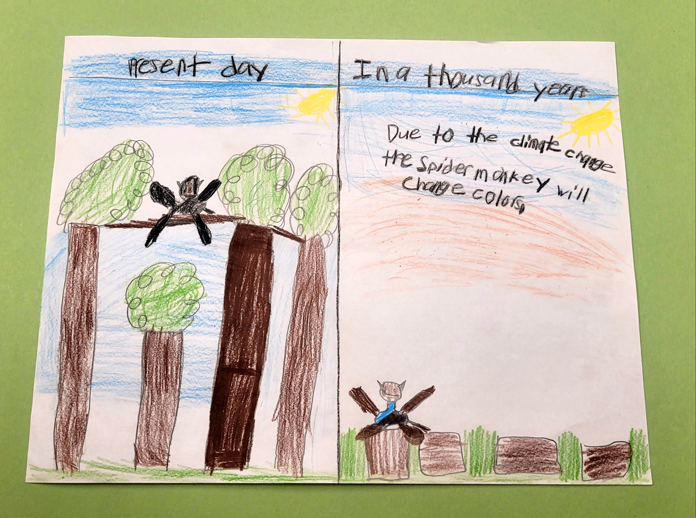 In a thousand years their habitat will change due to people cutting down trees, climate change, and habitat loss. In a thousand years they won't need flexible feet to help them grab branch to branch because there won't be a lot of trees in the wooden area. But they will still need to have webbed feet so they can swim. But they will start eating differently due to climate change and habitat loss. The things that spider monkeys eat will stop growing. It would eat only spiders, mammals, and fruit.