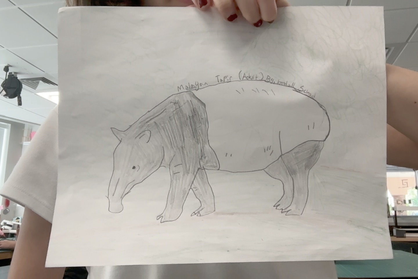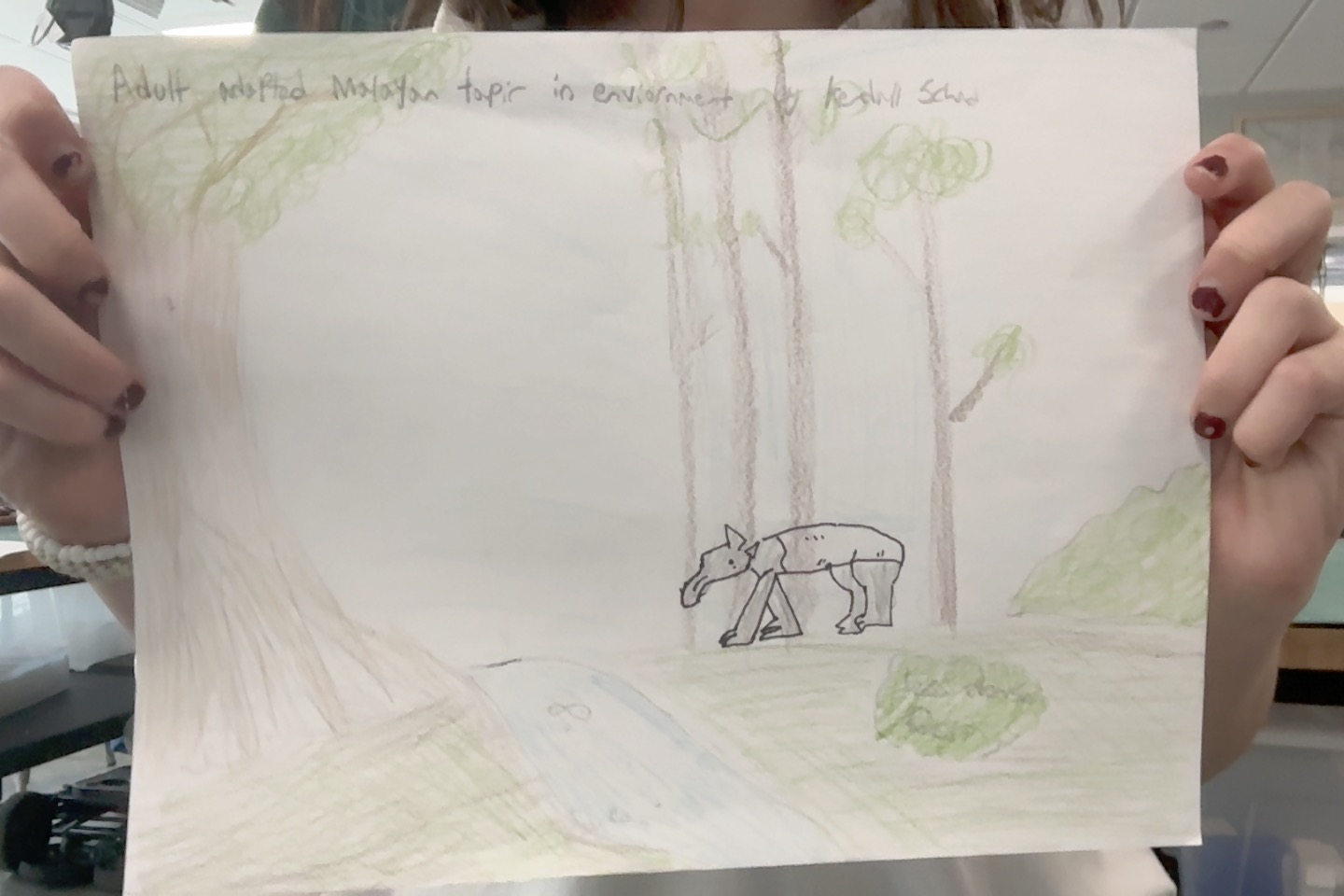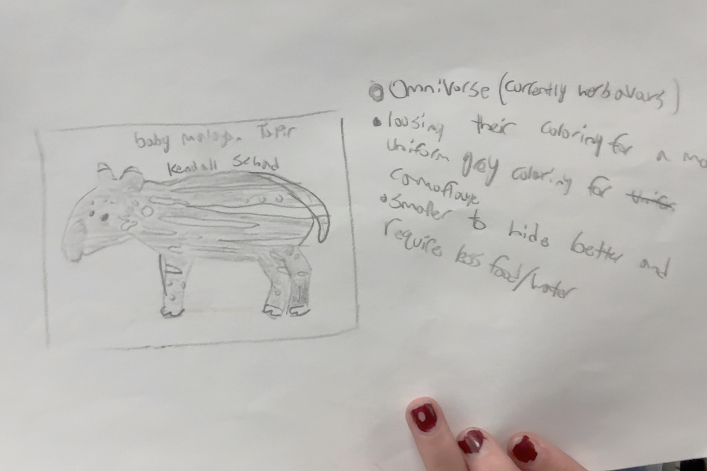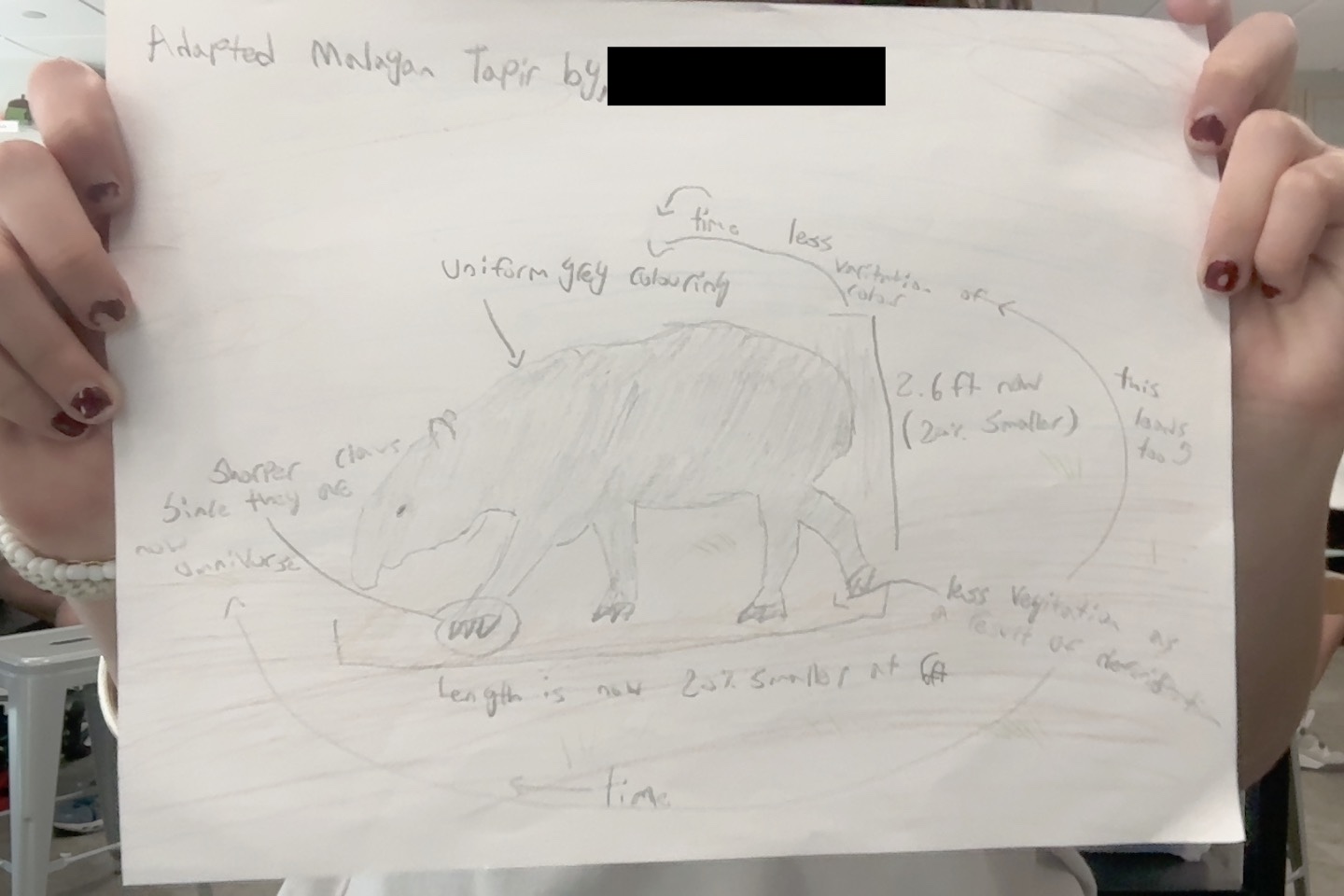 Malayan Tapirs are currently herbivorous animals that reside in Southeast Asia's dense tropical rainforests. In the future, I predict that they may become omnivorous because of climate change, in which there is less foliage for them to eat. Because of this, I believe there would be a change in their teeth in which their teeth become sharper. I also speculate that they may lose their black and white coloring for a more uniform, grey color to camouflage better because of the lack of hiding places. Lastly, Malayan tapirs may become smaller to hide better and require less food and water.