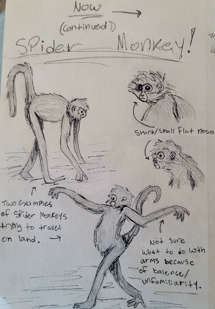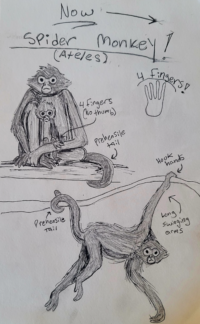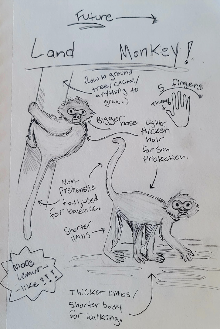 Spider monkeys (Genus Ateles) live in rainforests throughout South America. They have long arms, 25% longer than their legs, and prehensile tails that function as fifth limbs for swinging/climbing. Their arms are so long that they don’t actually know what to do with them when on the forest floor. The absence of thumbs in this species, resulting in a four-fingered hand, helps with brachiation. If rainforests disappear in 1,000 years due to deforestation, Spider monkeys would need more terrestrial/semi-terrestrial adaptations. Their arms would become shorter and their bodies would adjust for walking. Social group size, currently reaching up to 100, may decrease to reduce predation risk in more open habitats. As climates grow hotter and drier, lighter fur could help reflect heat and larger noses would aid in cooling and moisture regulation. Dietary patterns would likely change from predominantly fruit to more opportunistic feeding.