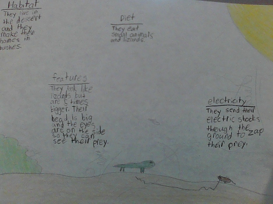 Future- The Electric Eel in the future lives in the desert and makes their home in bushes or a hole. They also have legs to help them dig and run. The electric shock they send travels through the ground to zap prey and predators. The shock can also reach up to twenty feet away from the Eel. The Electric Eel eats lizards and other small animals. Camels and fennec foxes eat the Electric Eels.