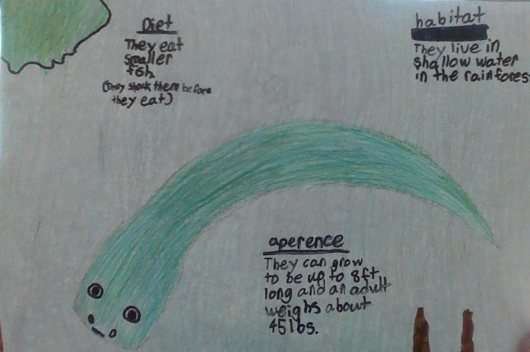Present- Electric Eels live in shallow water in the rainforest. They can grow to be eight feet long and adults weigh about forty five pounds. They usually eat smaller fish and their predators are Amazon river dolphins, large wading birds, and caimans. And they can live for ten to twenty years. Electric Eels organs are called Electric Organs. They also are nocturnal animals.