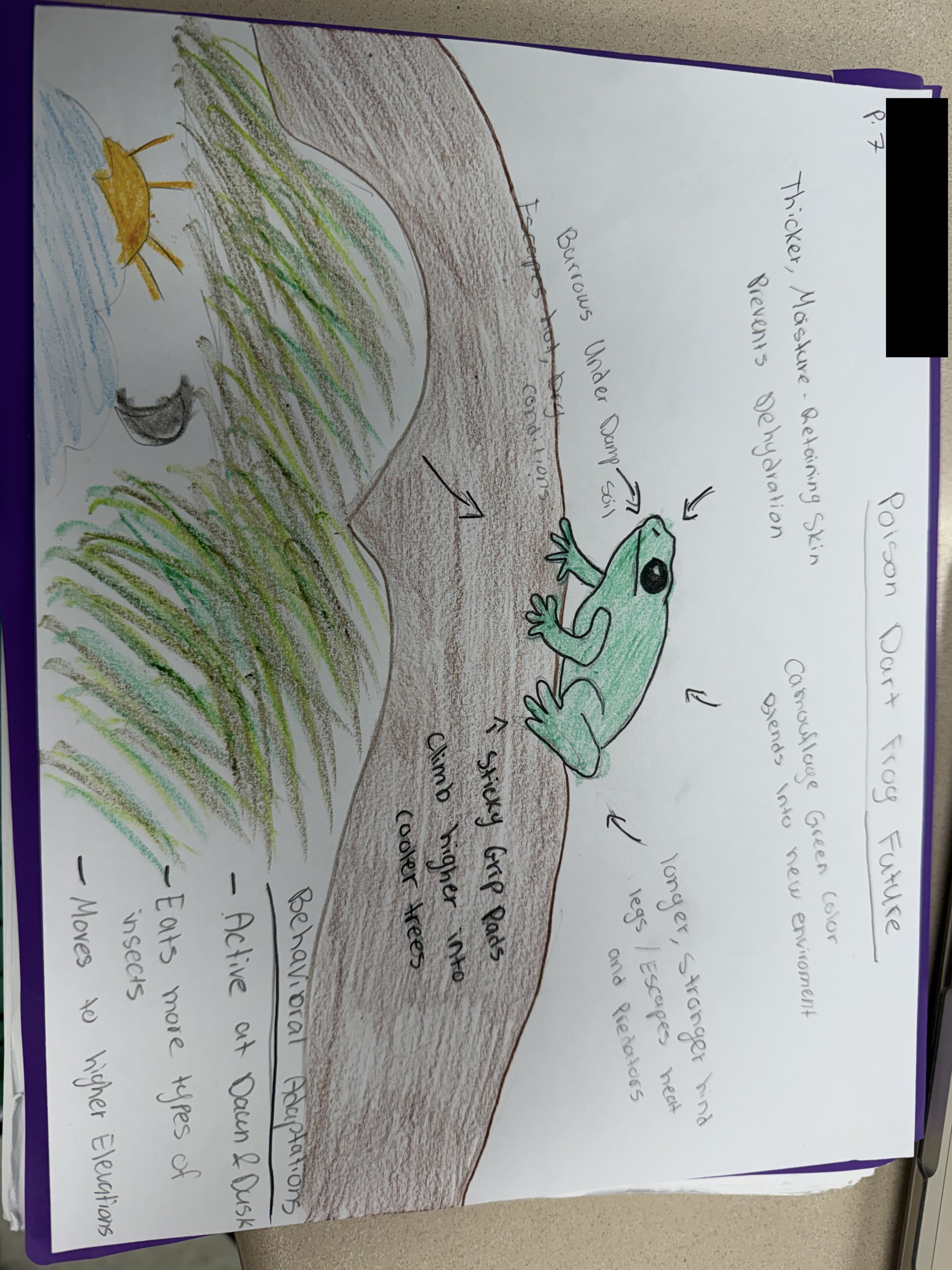 In my picture, I drew a future version of a poison dart frog that has adapted to survive climate change. The frog has thicker, moisture retaining skin to help prevent dehydration as temperatures rise and rainfall decreases. It should be dark green so it has better camouflage and can blend into leaves and trees instead of standing out with bright warning colors. I also gave it longer, stronger hind legs so it can jump farther and escape predators more easily. Its sticky grip pads are larger so it can climb higher into cooler trees. I showed it burrowing under damp soil to stay cool during extreme heat. I also listed behavioral adaptations like being active at dawn and dusk, eating more types of insects, and moving to higher elevations. All of these adaptations help the frog survive, find food, avoid predators, and adjust to its changing rainforest habitat.