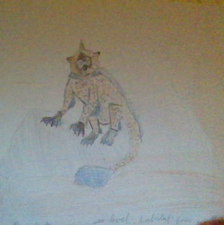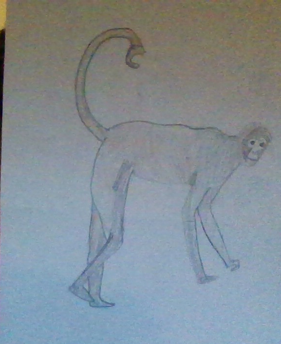 Due to the rising sea level, habitat loss, pollution, and food competition , a spider monkey has developed things like webbed feet, back fins, arm fins, leg fins, back fins, tail fin, and thin leopard print fur. The monkey's fins help it navigate through the newfound flooded swamp-like terrain, its new fur helps with temperature regulation, while also helping with camouflage to collect prey easier and for hiding from other predators. Its tail helps it swim through swampy waters, while also letting it hang on trees.