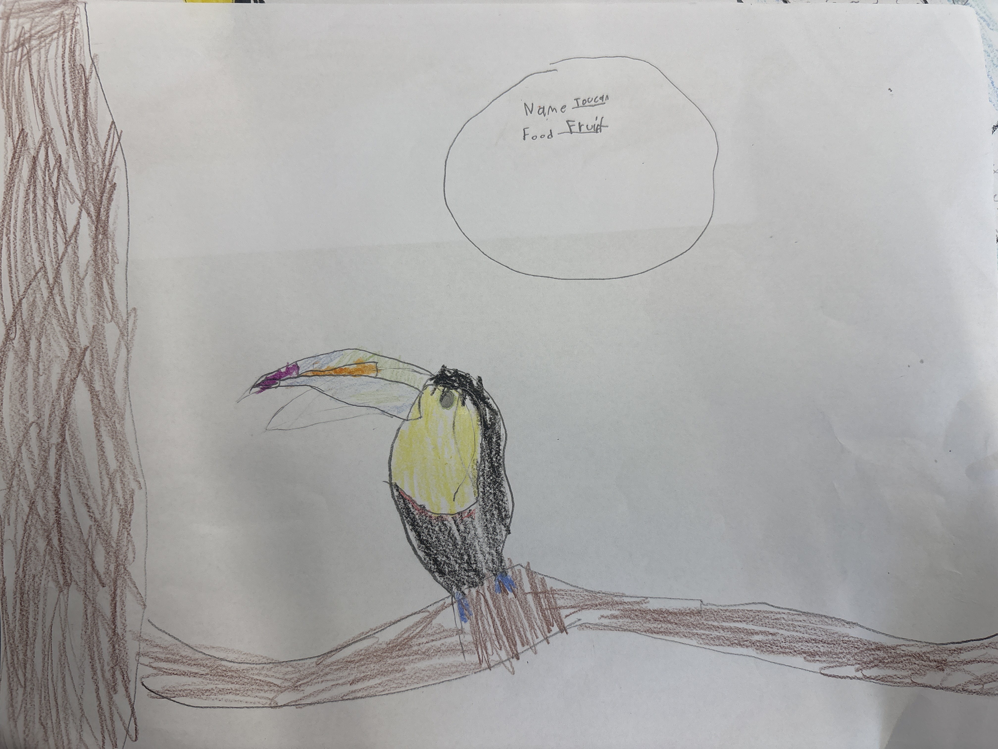 Toucans have blue feet a long beak a colorful body they catch food with the tip of their beaks, they frogs , insects fruits and flowers. In the future they will get a green beak because of bacteria.