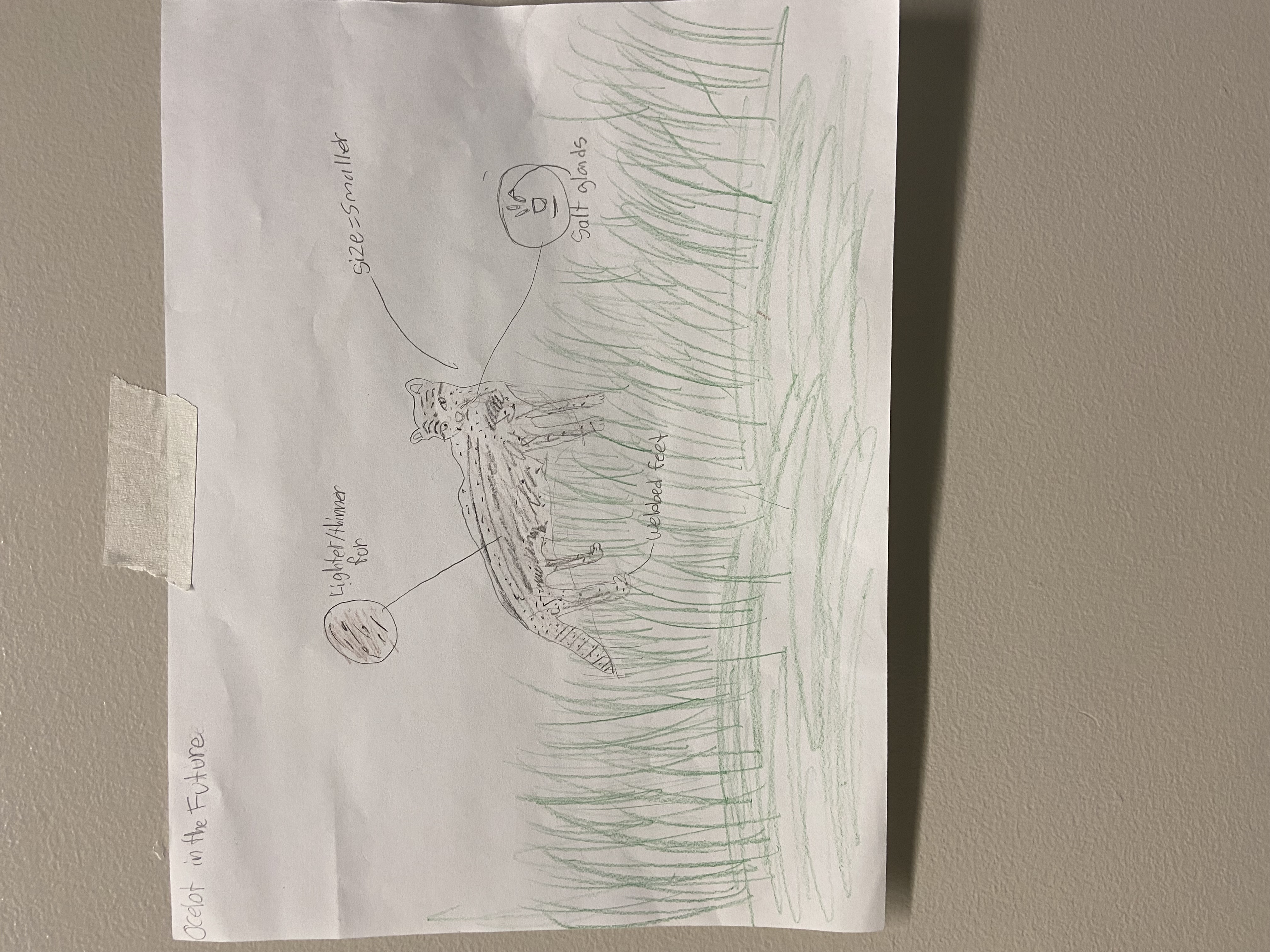 An ocelot in the present has thick fur with unique patterns and they are small but they are still a big cat. Ocelots hunt their prey using the scent of their prey to track them down. They live in dense tropical amazon rainforests but if deforestation and climate change continues they will have to adapt to their new environment. Ocelots will adapt by getting thinner lighter color fur for the heat and they will get webbed feet so they can swim and hunt their prey in the water easier. Another adaptation that they will get is developed salt glands meaning that they will use these salt glands to drink the water that they will have to use. This adaptation will help them if the water floods the rainforest. These adaptations will help them survive in the future climate that is bound to happen.