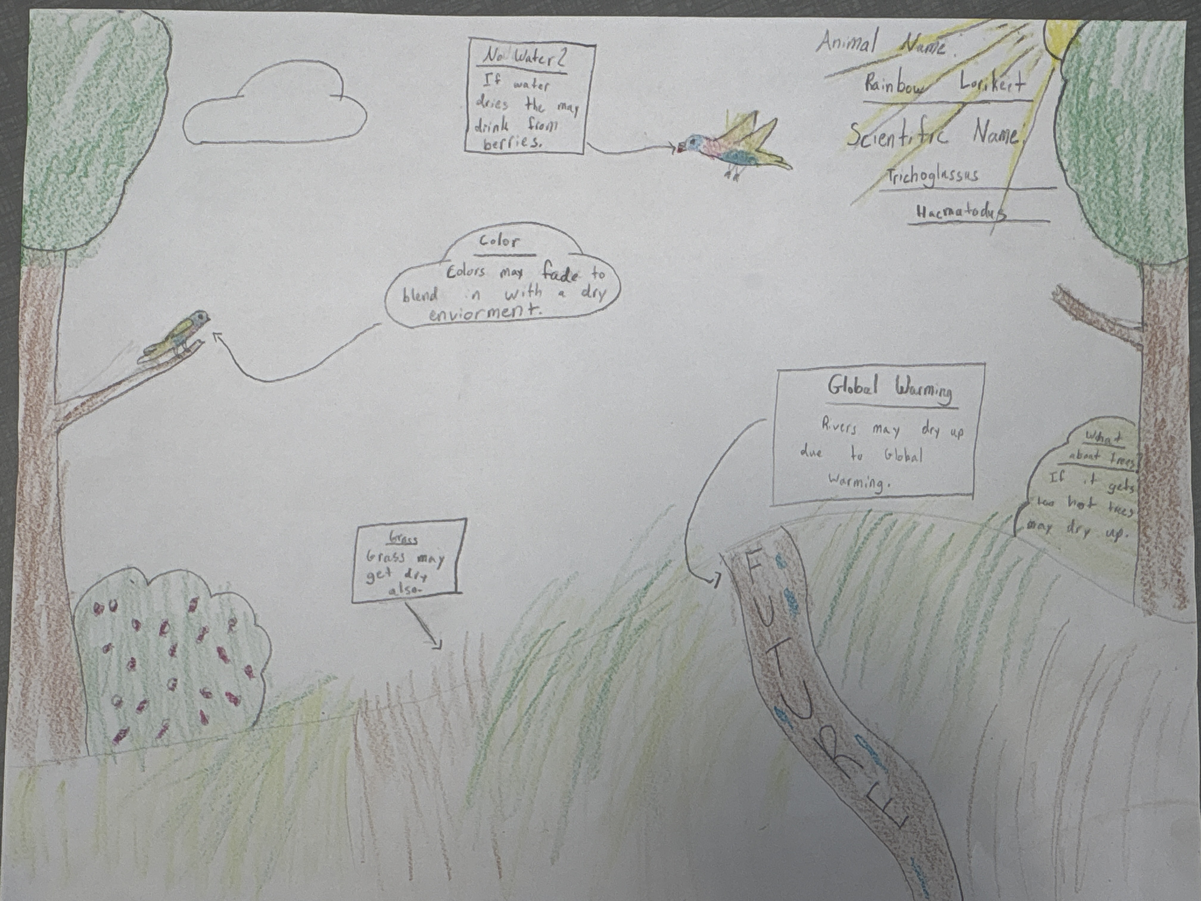 Rainbow Lorikeets have very bright colors. They have bright blue feathers on their heads and bellies, and green feathers on their necks, tails, and wings. The top of their head is called a crown, and the back of their neck is called a nape. They feed on flowering plants, crushing berries with their beaks and using their tongues to suck out nectar. They also eat seeds, fruit, and insects. Rainbow Lorikeets live on the east coast of Australia, as well as in parts of Indonesia and other islands in the South Pacific. They live in large flocks to protect themselves from predators. In the future, climate change may make the rainforest dry and dull. If plants and trees fade in color, the lorikeets’ bright feathers could make them easy for predators to spot. To survive, they might need to fade their colors to better blend in with their surroundings.