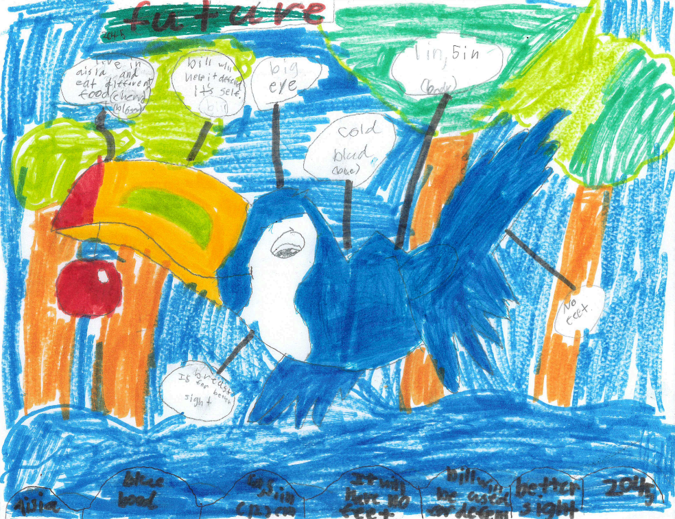 Future: Type The toucan will have the bill for defense it will live in Asia so it will eat different food.The toucan will be smaller to {1 inch} to {5 inches} for predators to not see them.It will have no feet.The toucan will have blue blood and cold blood.The toucan will be like this in 2045.