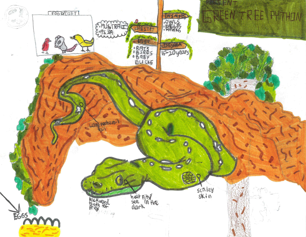 Present: The green tree python is an rainforest animal that live up mostly in the trees. The python has backward facing teeth they use for gripping prey. A second thing is they have really scaly skin for slithering. Another thing is the have heat pits to see in the dark.They also have a long prehensile tail for gripping on to trees.