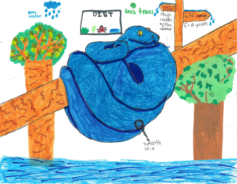 Future: In the future the green tree python is mostly in the water instead of in trees. So now they are called the blue python, they are blue so they can blend into the water, which makes up most of their environment. Another thing is they now have smooth skin instead of scaly skin for moving in the water. They also turn black in the dark to avoid predators.