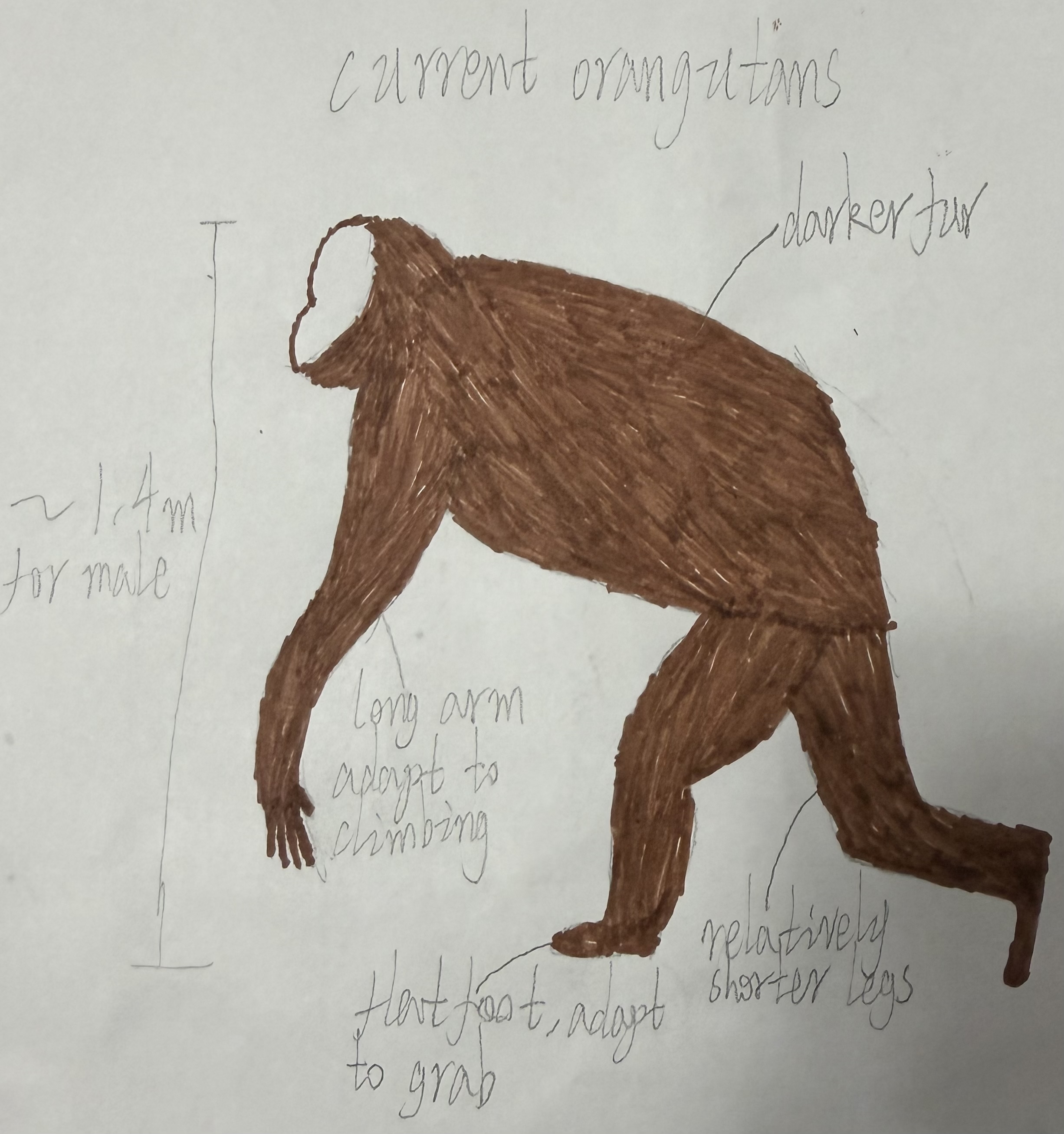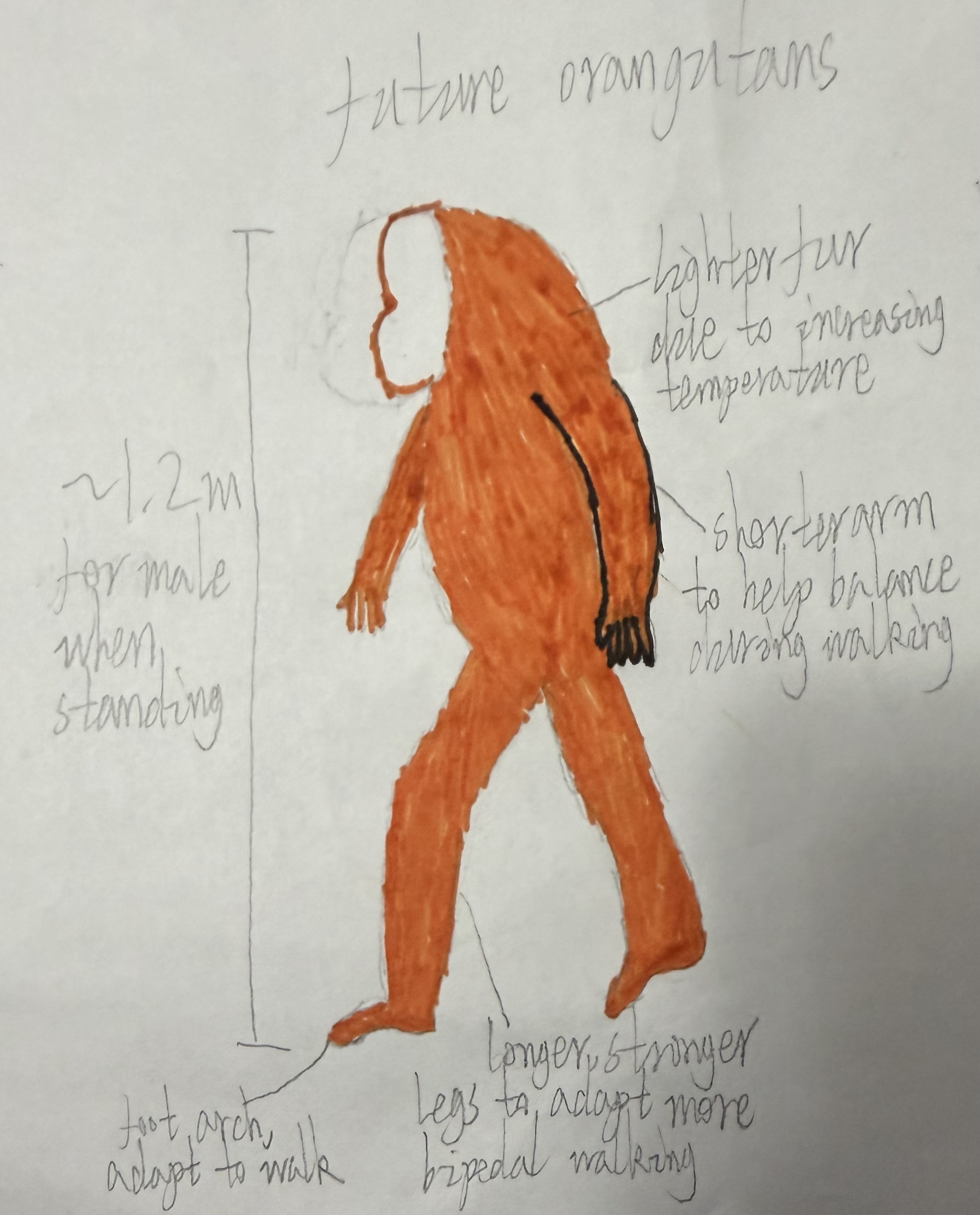 In the future, orangutans' rainforest habitat may decrease due to climate change and man-made felling. Under that situation, orangutans will have to adapt more bipedal walking, like human did, and their body size may decrease due to less food source. Additionally, their fur may become lighter and sparser due to increasing temperature