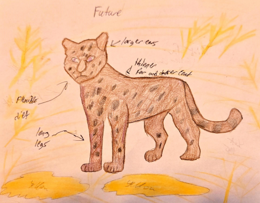 The jaguar is living in the Amazon Rainforest of South America, where it hunts in the forests near rivers and wetlands. It is an aggressive mammal with really good traits such as strong muscles, powerful jaw, sharp claws and golden fur covered in black spots for camouflage. The climate change might make the rainforest hotter and drier, causing a loss of habitat and prey animals. In response the jaguar may develop thinner fur to release heat. Another adaptation includes the change of larger ears for better cooling the body. If the forests get more spread out, it might get them to develop longer legs to make long distance more manageable. They might also develop a flexible diet since because of the dry weather many preys are dying. This adaptation will make sure that the new environment is comfortable for the jaguar to live and reproduce.