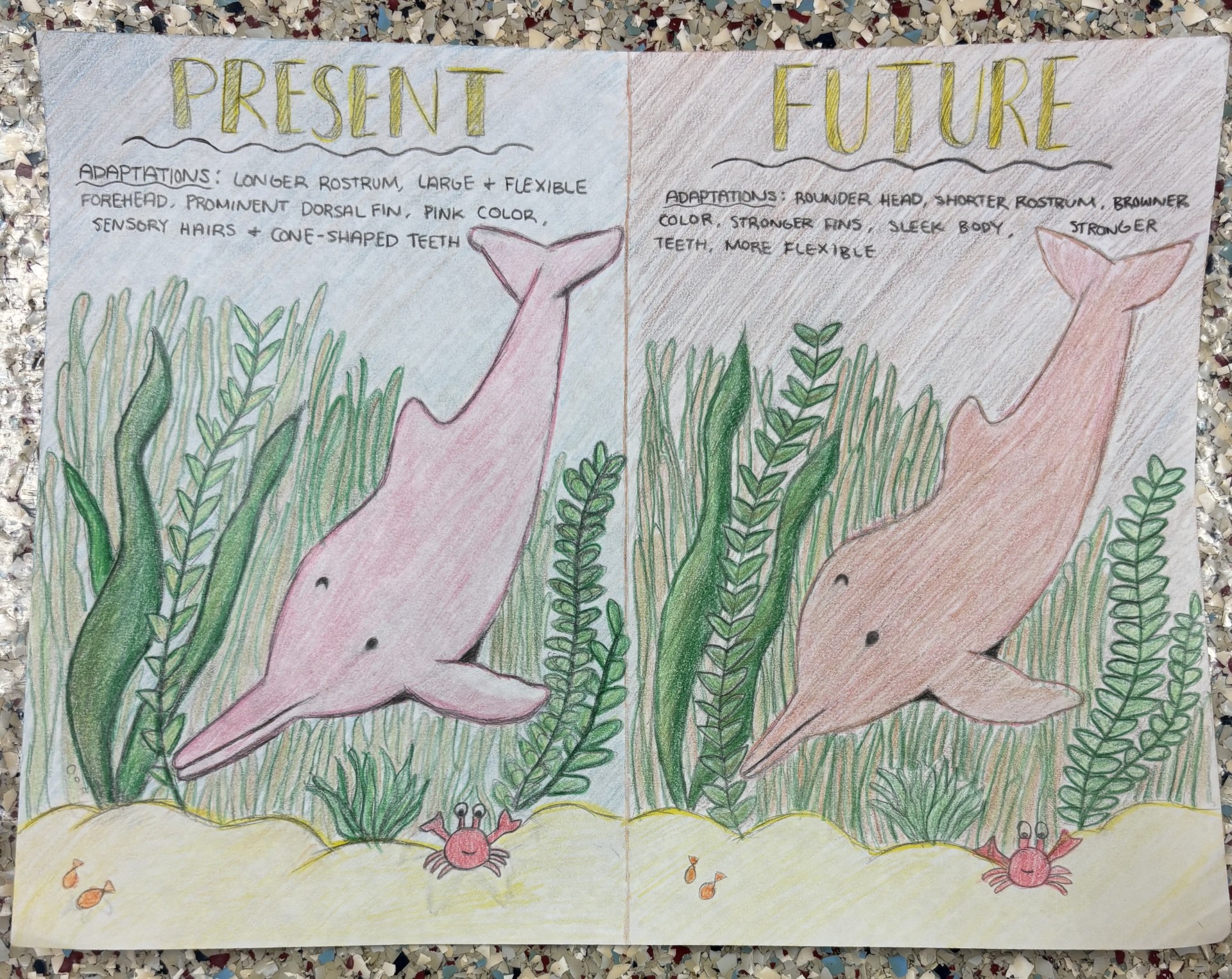 Current adaptations are an unfused neck vertebrae which helps them turn their neck 90 degrees to maneuver through the branches underwater. They have a longer snout with cone-shaped teeth that help with holding/crushing their prey (crabs, fish, etc). Their prominent head helps with echolocation through the murky water. They have fins that are flexible and help with navigating through complex and tight spaces. And lastly they have a pink color which darkens as they age. For future adaptations, I think they will have an even rounder head which will improve their echolocation in even murkier, polluted waters. Their pink color will change into a brownish pink to help with better camouflage. A smaller body shape for better navigation as their environment could start to shrink. Stronger cone-shaped teeth because their diet of fishes could change due to overfishing.