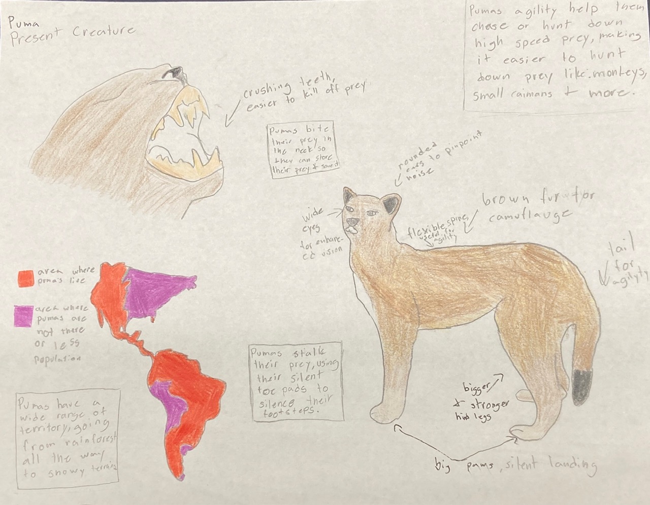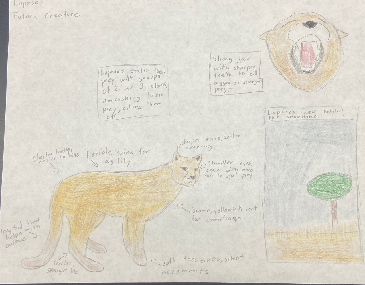 My creature is a Puma, and in the future it evolves into a Lupase. Compared to pumas, lupases are much smaller and more agile. Since their environment has changed to a savannah, they have become pack animals since there are more predators in the savannah for lupases. Lupases hunt in packs, since it makes it easier to hunt their prey and ambush them. Their legs and height do decrease, but they still have the same amount of agility and speed. They use the benefit of being smaller to hide or stalk their prey easier, so the prey does not see them coming. Many Lupases hide their prey in shrubs, fallen tree branches or tall grass to avoid it getting stolen or eaten by other animals. Lupases often mark their territory by leaving marks or their own prey there. They use their eyes to spot predators and prey from a distance.