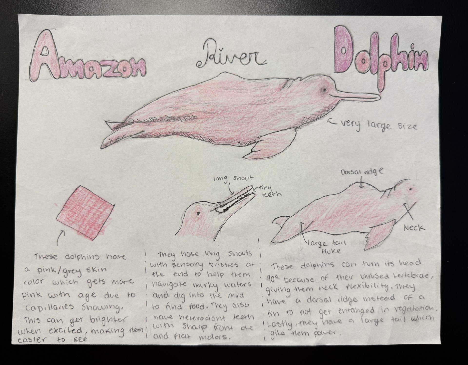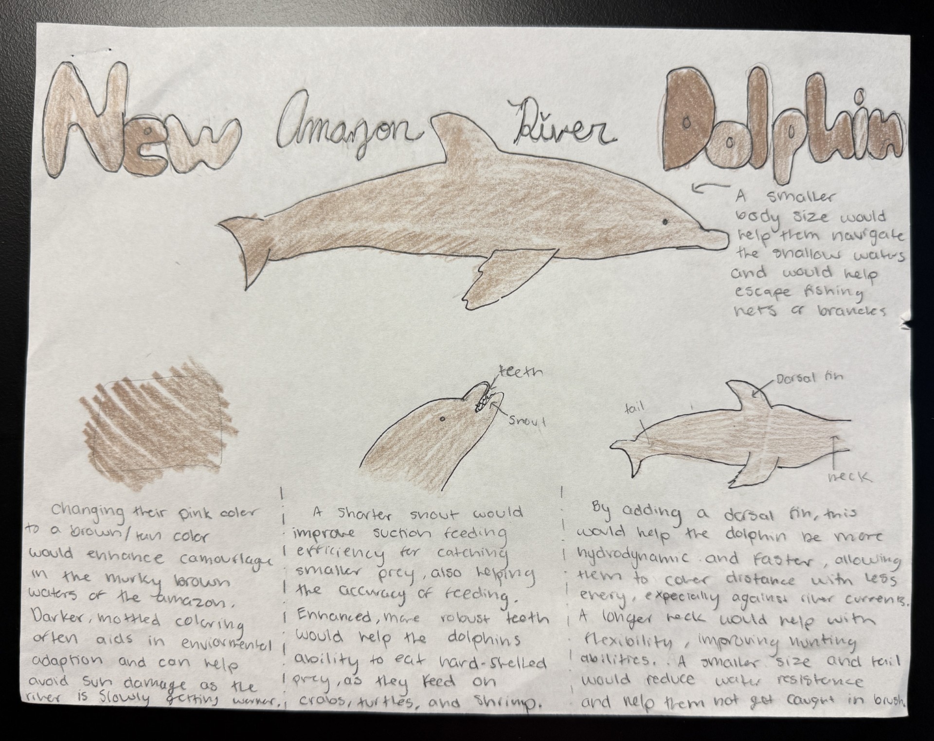 The Amazon River Dolphin lives in the Amazon River which is slowly changing due to climate change and human activity. The unstable farming, mining, and deforestation cause the water to become murky. River Dolphins may change from their bright, vibrant pink color, to a neutral tan, helping them camouflage. The Amazon River is also changing in temperature because of climate change, causing reduced water depth during droughts. The dolphins' large size makes it hard to maneuver through shallow waters but if they were smaller they could survive in the shallow waters. Not only is climate change increasing the temperatures of their environment but it is also increasing tidal amplitude. When this happens, the tides would get stronger so the pink dolphin would need to adapt with things like a dorsal fin, longer neck, and stronger tail which would allow them to swim faster and easier through these changing tides.