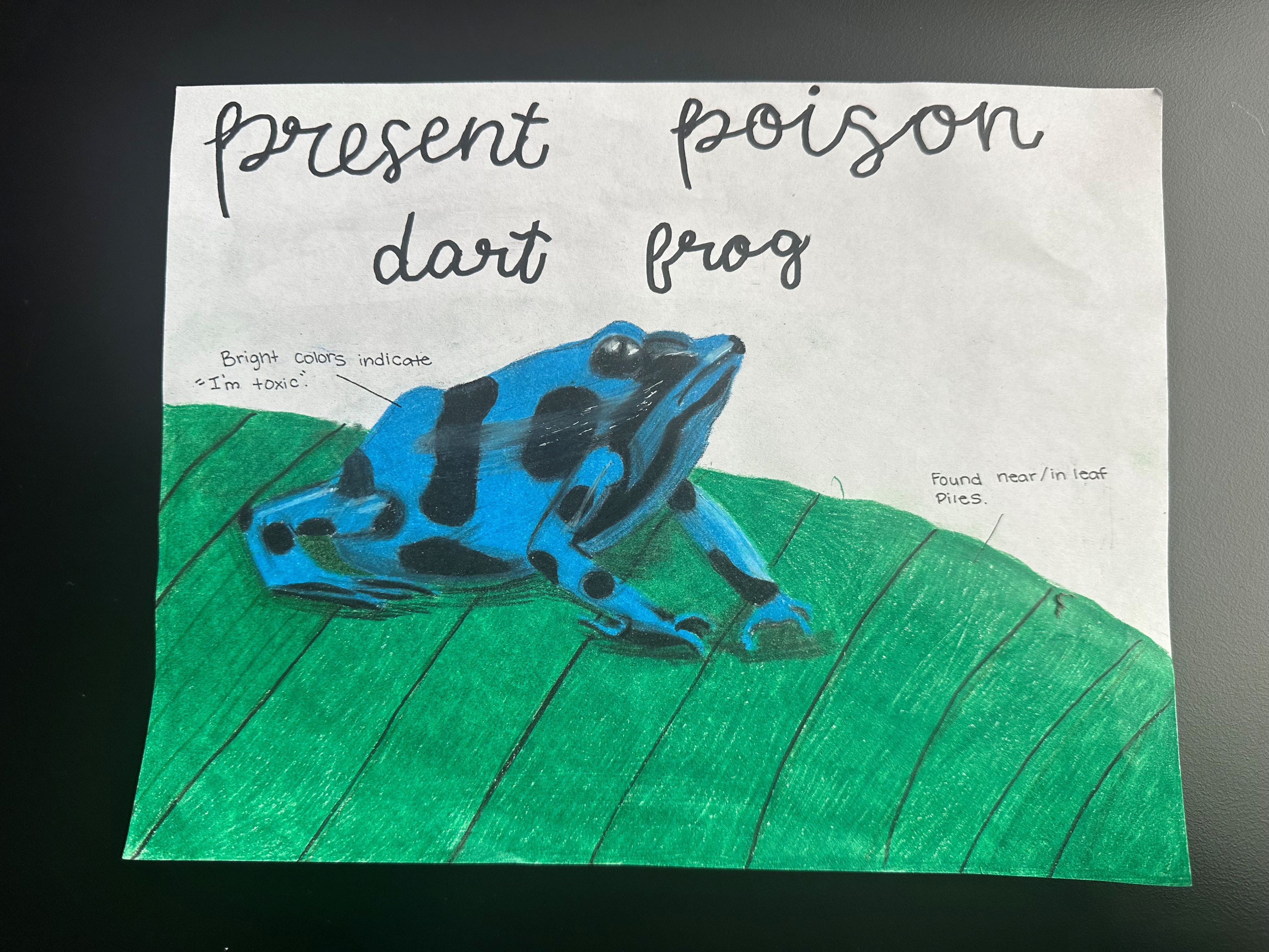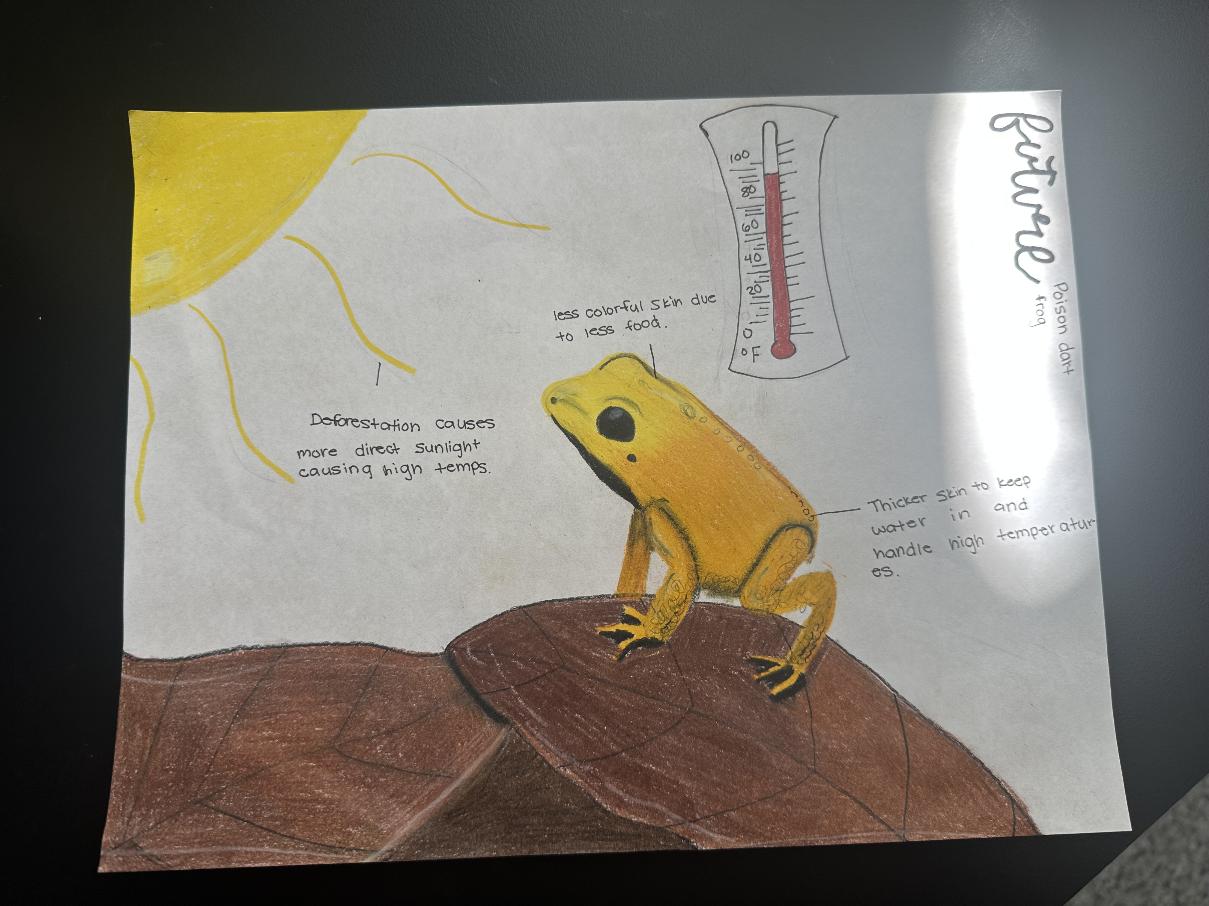 The present Poison Dart Frog (PDT) is a common frog in the rainforest and easily identified through their vibrant skin color which is mainly from their diet, and shows how they are poisonous, but also allows them to thrive and allows them to protect themselves from predators. Future PDT’s will not be able to do this because of deforestation which is causing higher temps