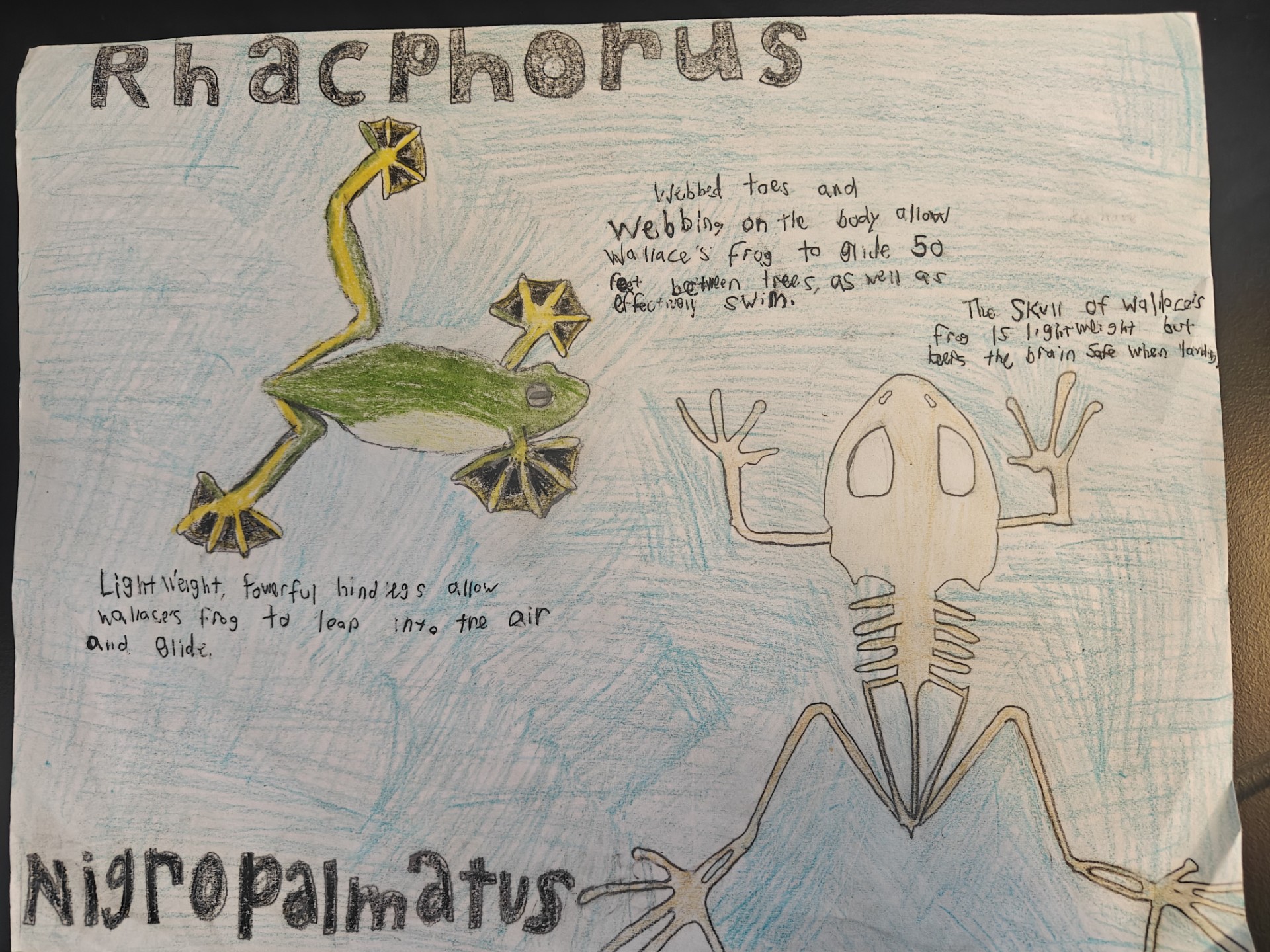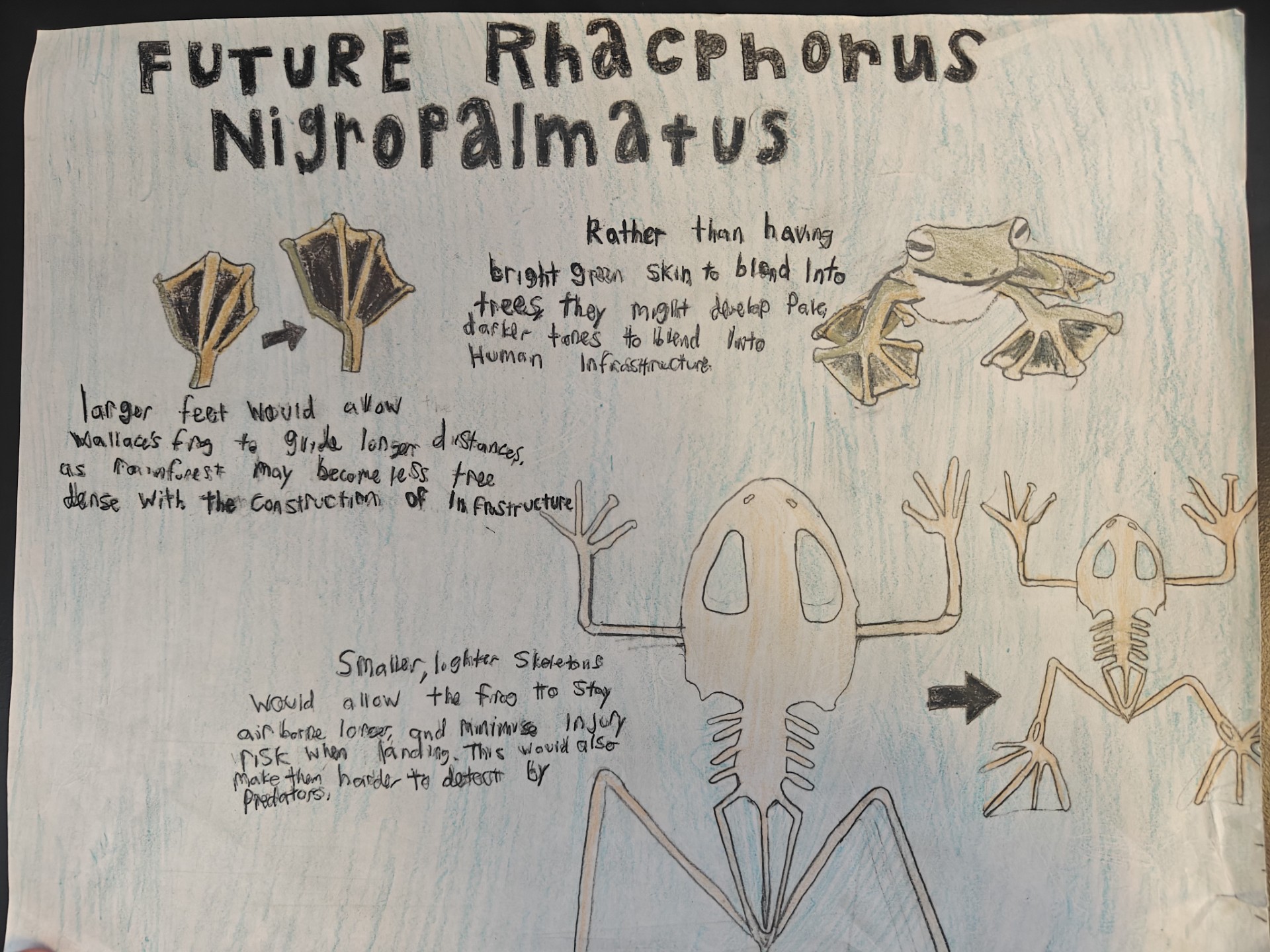 Wallace's frog (Rhacophorus Nigropalmatus) is a large frog that is capable of gliding up to 50 feet. Although 1000 years is a very short time in terms of evolution, I still predict that this frog will adapt to its natural environment as it changes due to humans. For example, as humans start to chop down trees that Wallace’s frog uses, rainforests where the frogs live will become more fragmented, and frogs that cannot glide between the larger distance created by this fragmentation will be eaten by predators. This means that frogs who have the ability to fly the furthest, will survive. This will change the appearance of the frogs, meaning frogs who fly the furthest probably have the largest feet and a lighter, smaller body for more efficient gliding. Wallace’s will also become more pale to blend into buildings, rather than the bright green they use to hide in trees.
