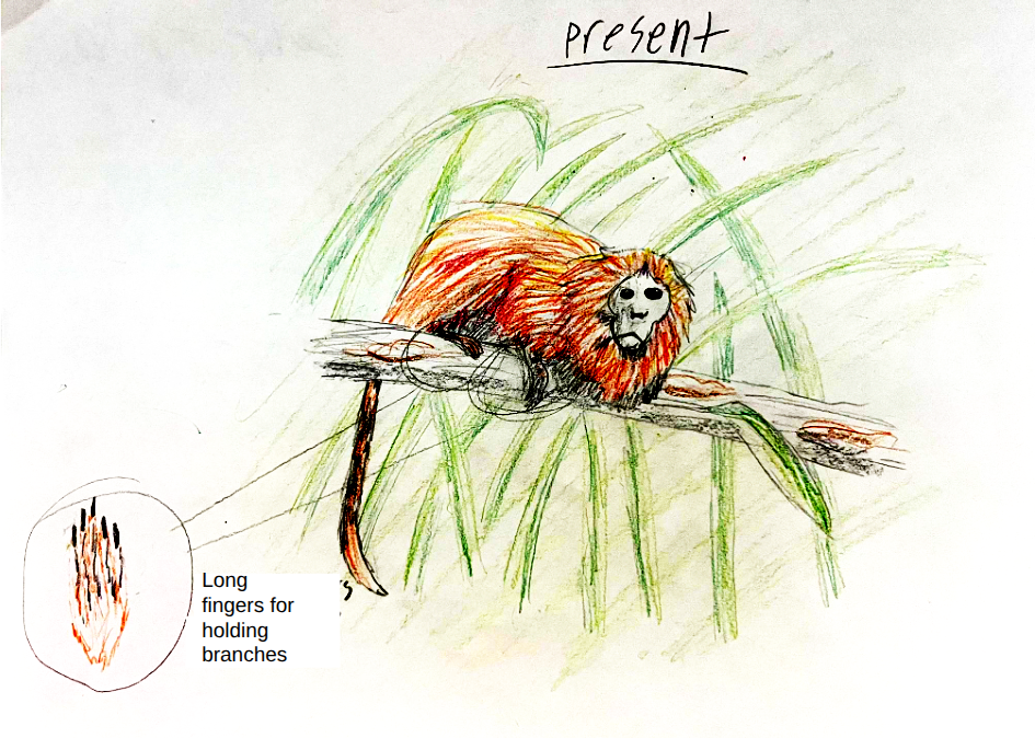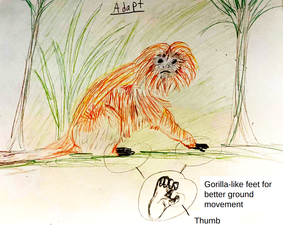 The adaptation of the Golden Maned Monkey is to help it survive in the future so that there are less trees in its habitat. Its current habitat is at the top of trees, but as many forests are being chopped down, their habitat will soon change. They have long fingers now to hold on to tree branches but they will need to adapt to live better on the floor. They will adapt to have feet similar to gorillas. This will help them in the future when their habitat is moved to the ground.
