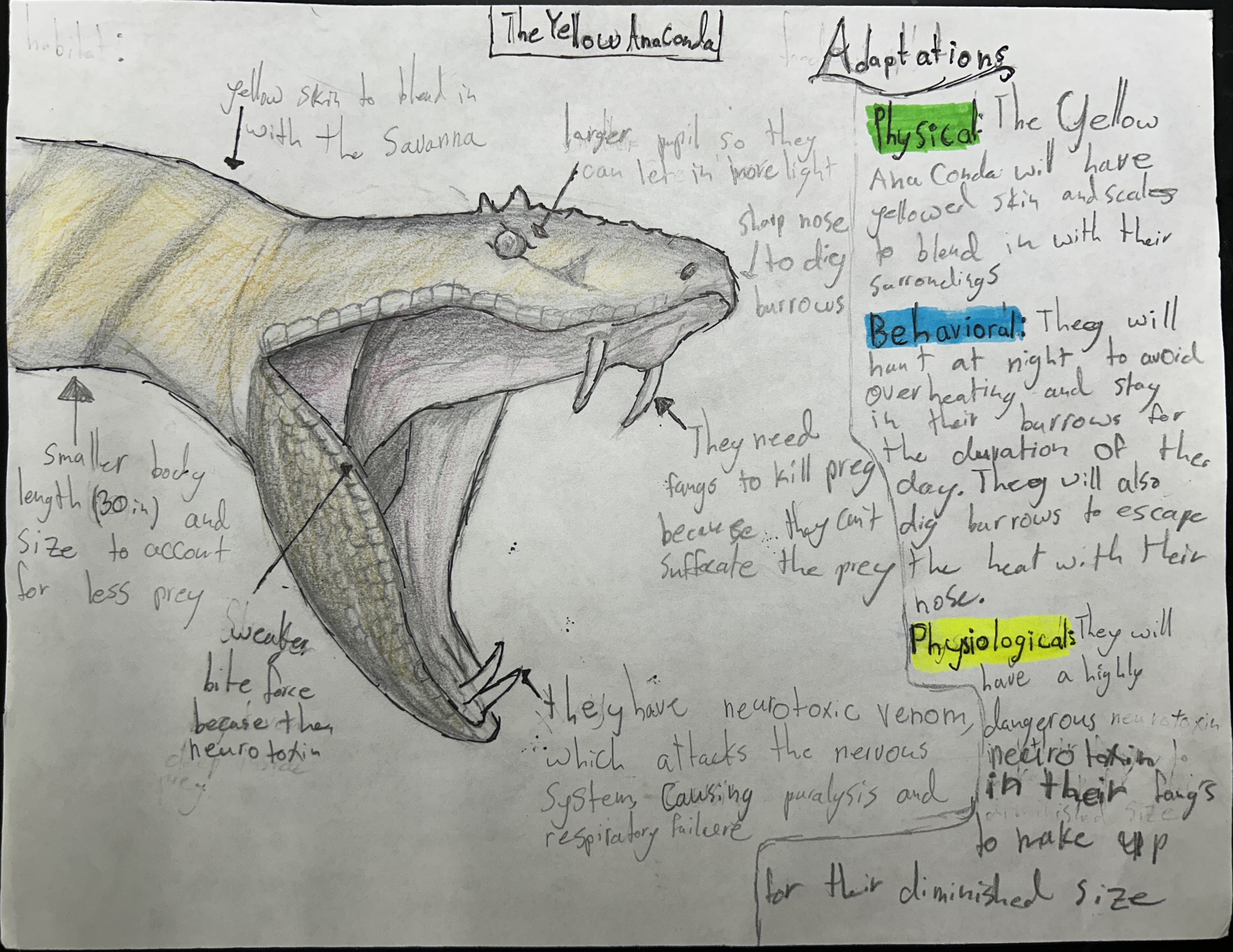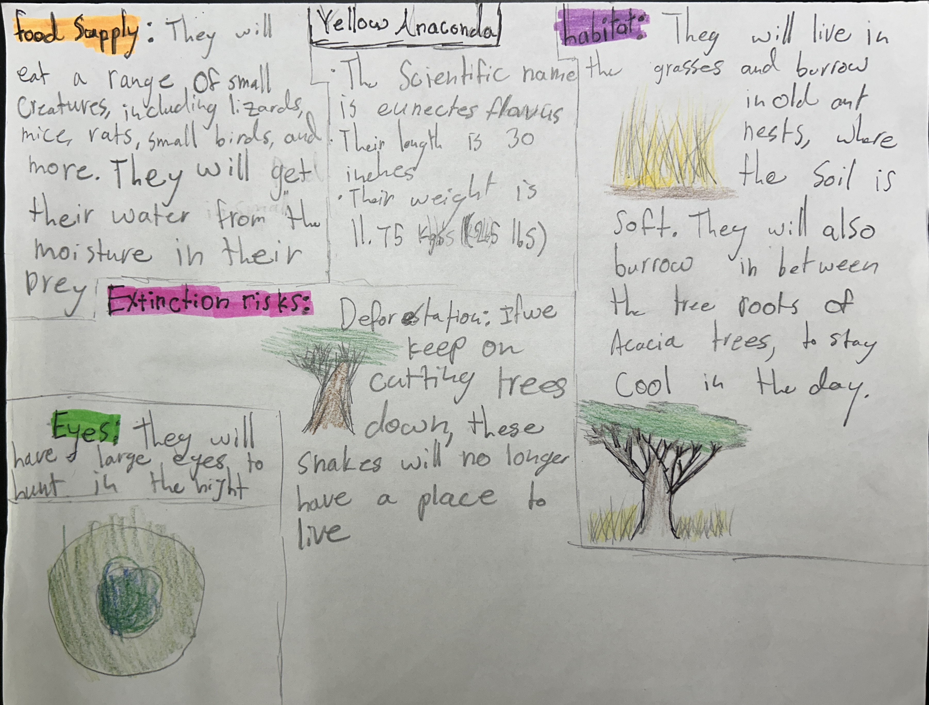 The Yellow Anaconda (Eunectes flavus) will live in the savannas of South America, because climate change will turn their natural habitat into a savanna, and will find food by slowly stalking their prey until the prey lets their guard down; hunting during the night. They will have more babies in their litter, because the mortality rate of the babies will increase as the harsher temperatures ensue. They will go into a period of dormancy by burying themselves in mud in the summer to escape the heat.