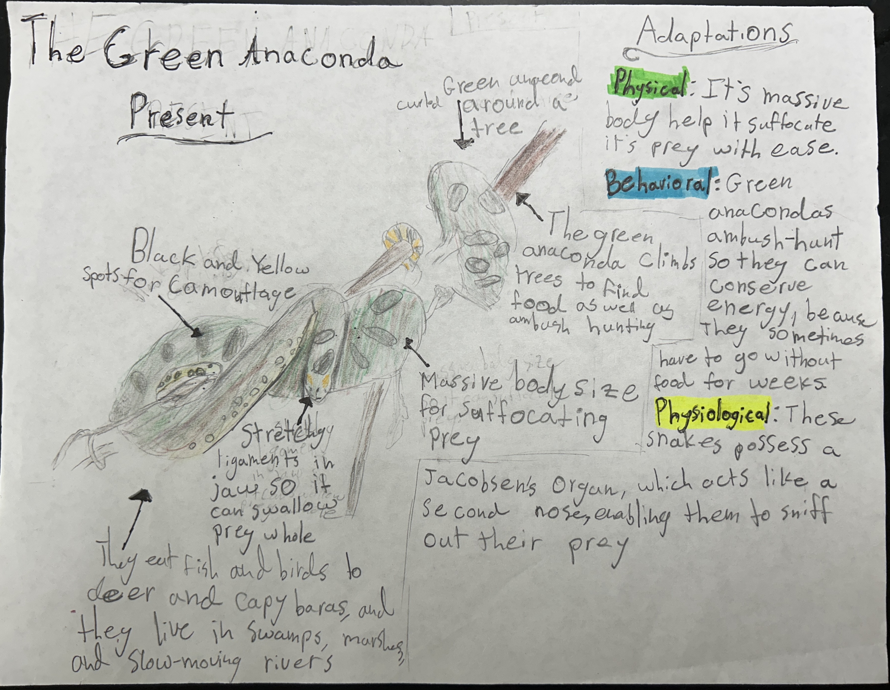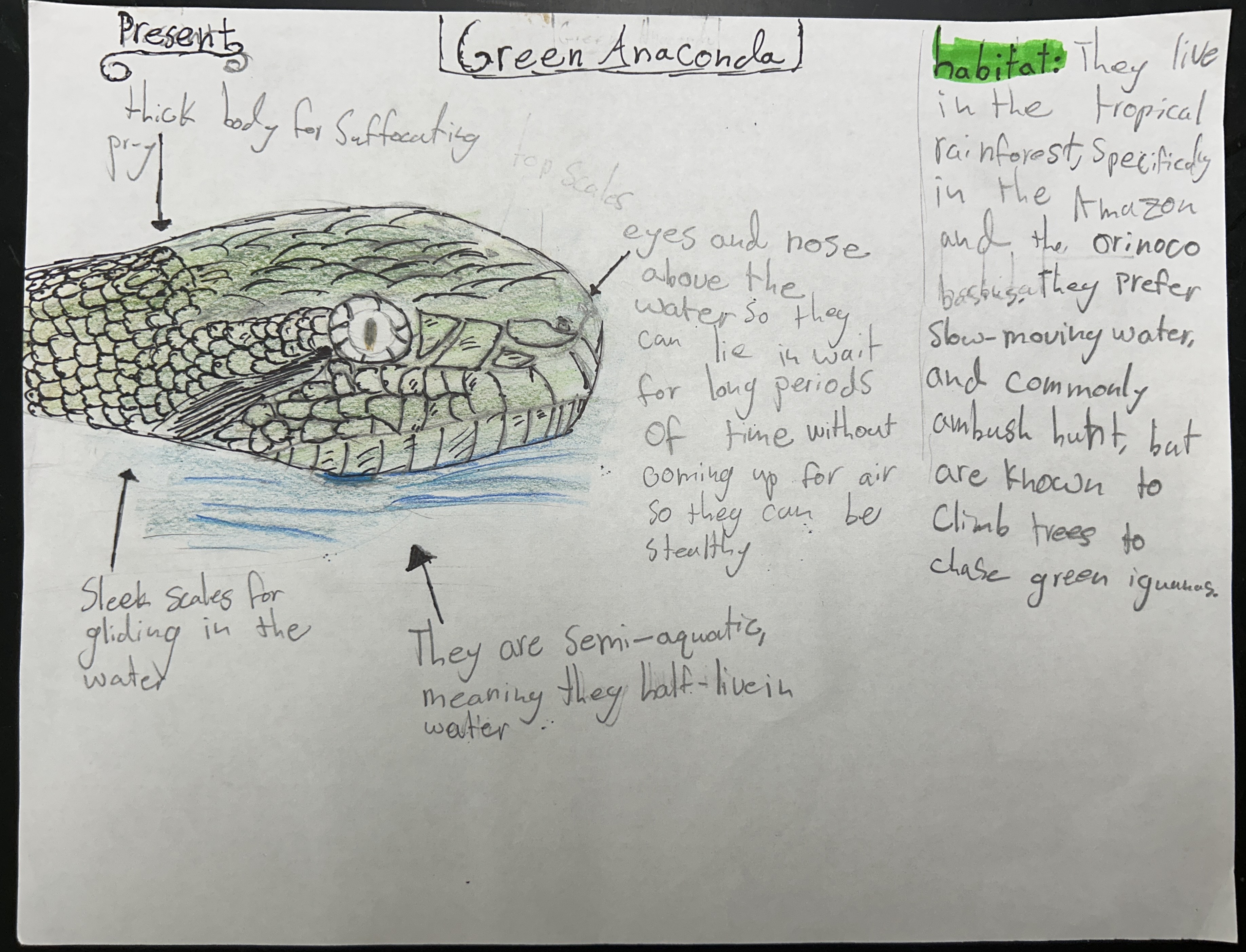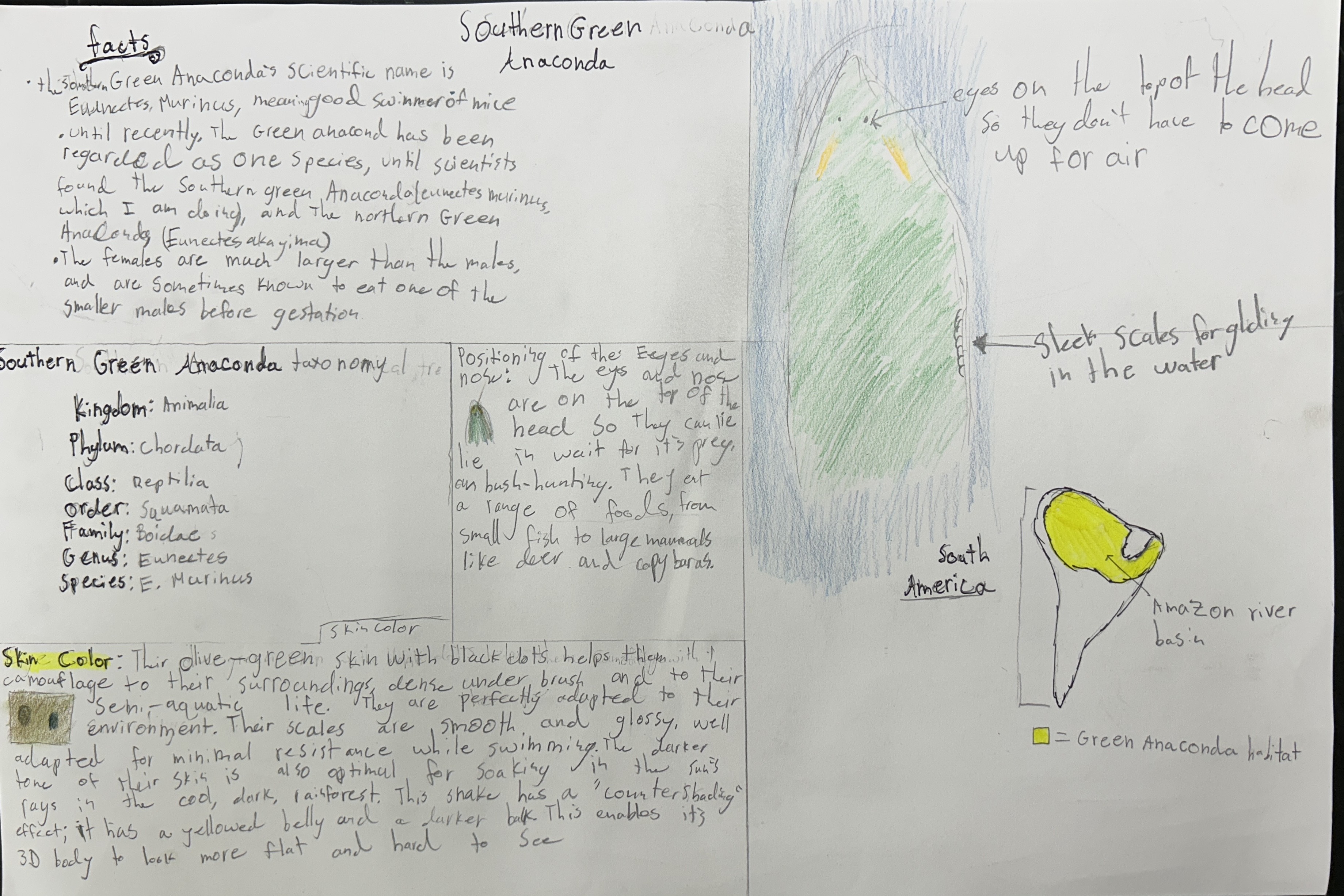 The Green Anaconda is an apex predator that lives in most of South America. They live in tropical rainforests, and prefer shallow slow moving waters to stay in, because the water supports their weight, and like streams and flooded grasslands. Green anacondas are carnivorous, and their prey ranges in size from birds and fish to large animals like deer and capybaras, and are constrictors.