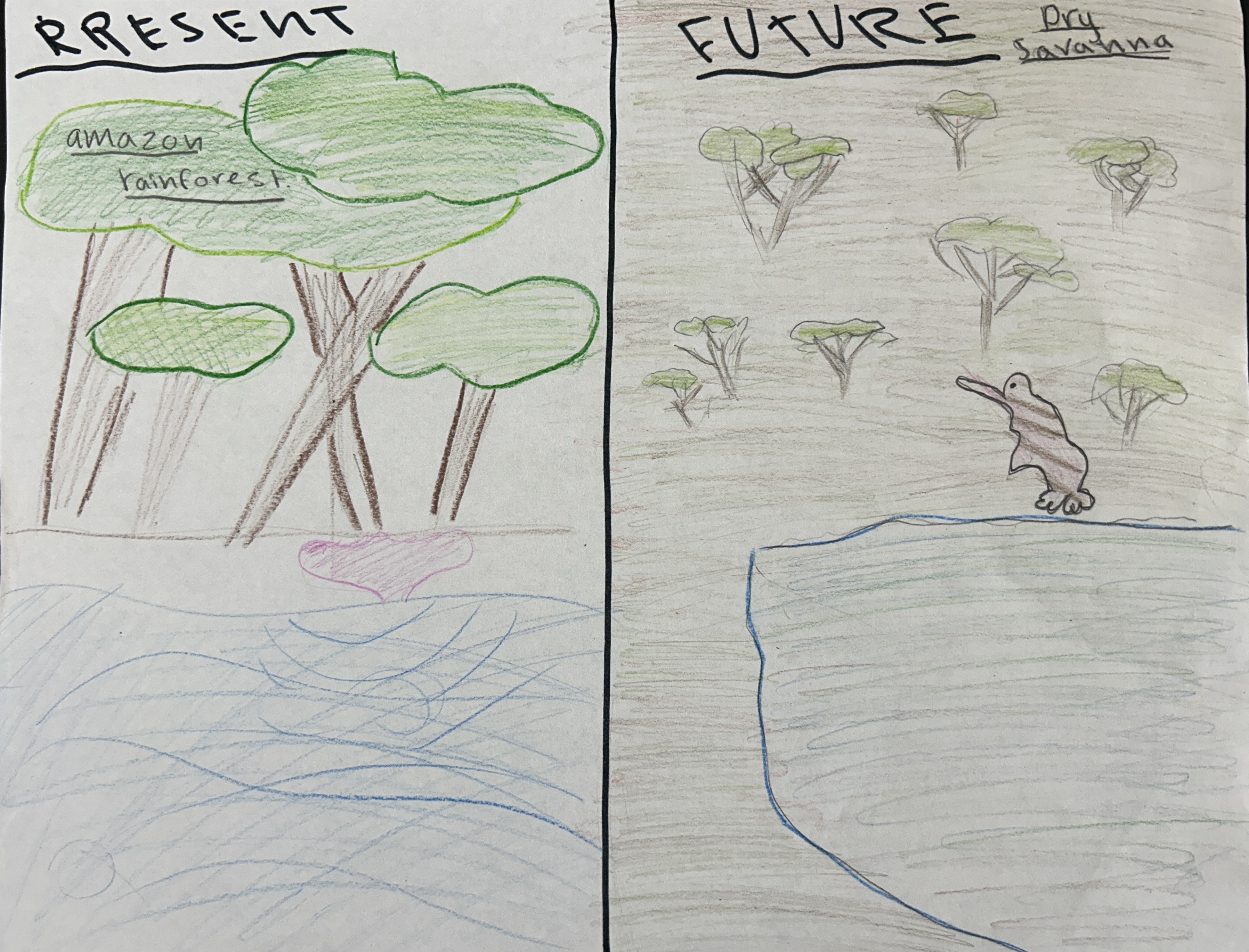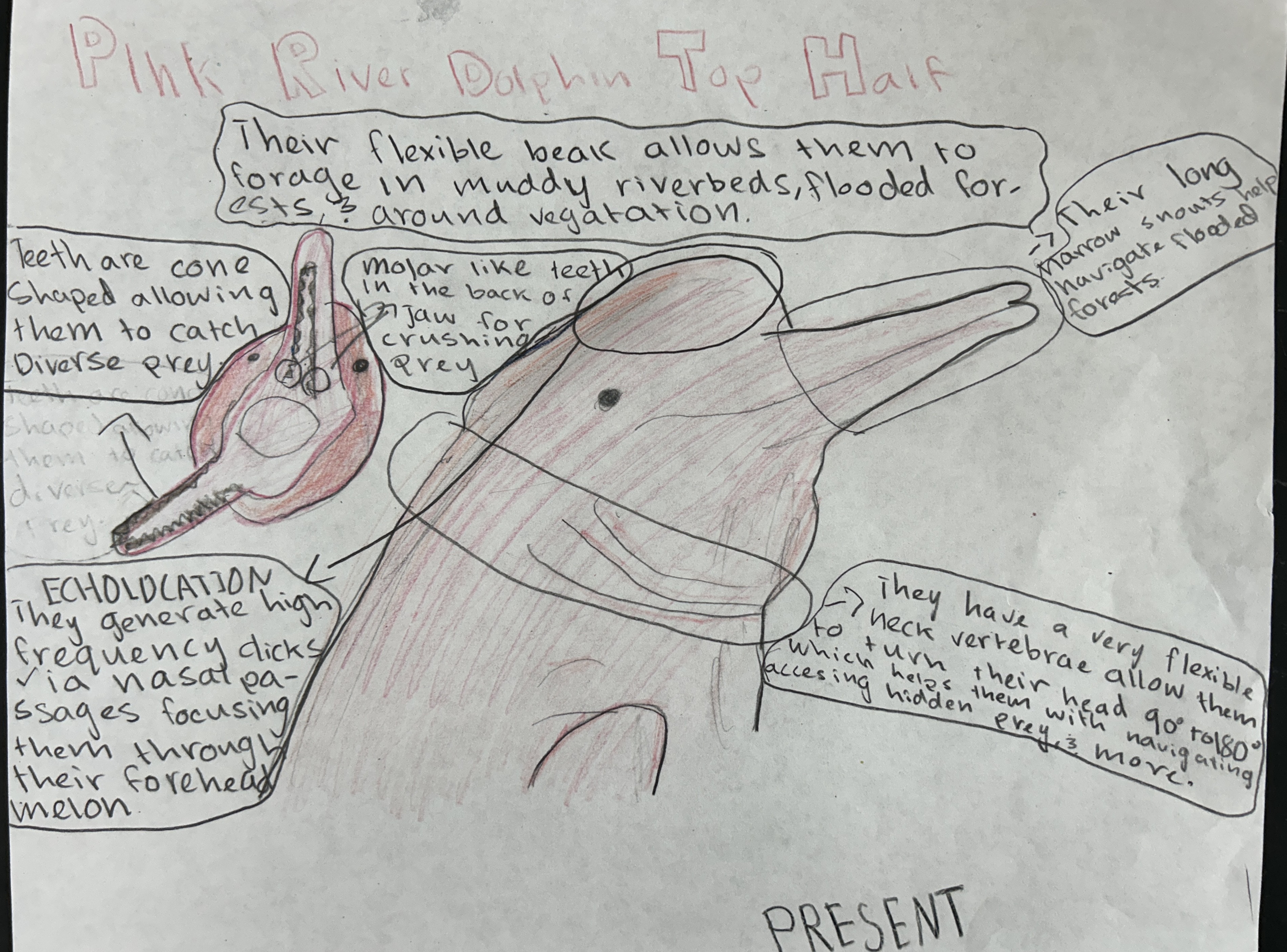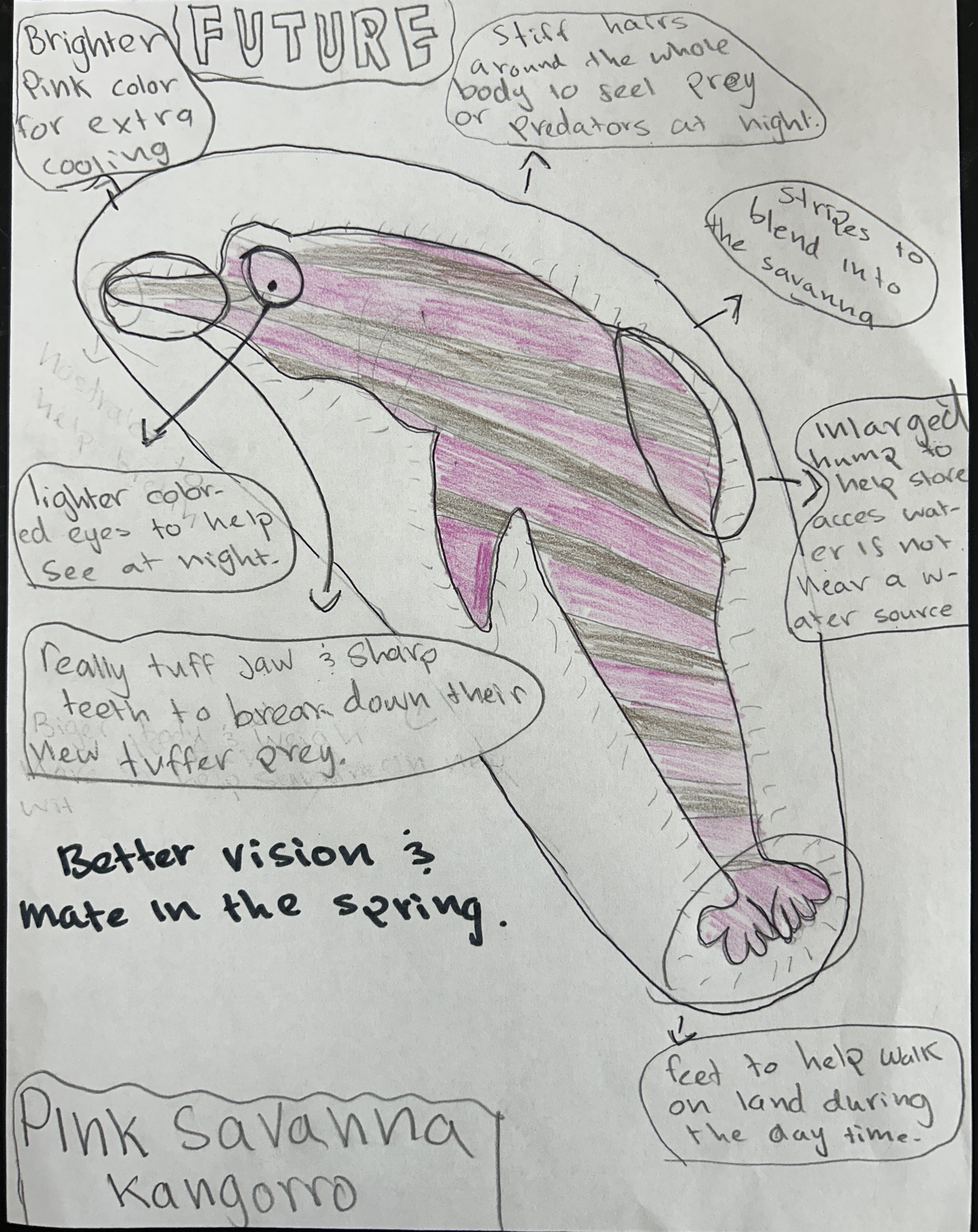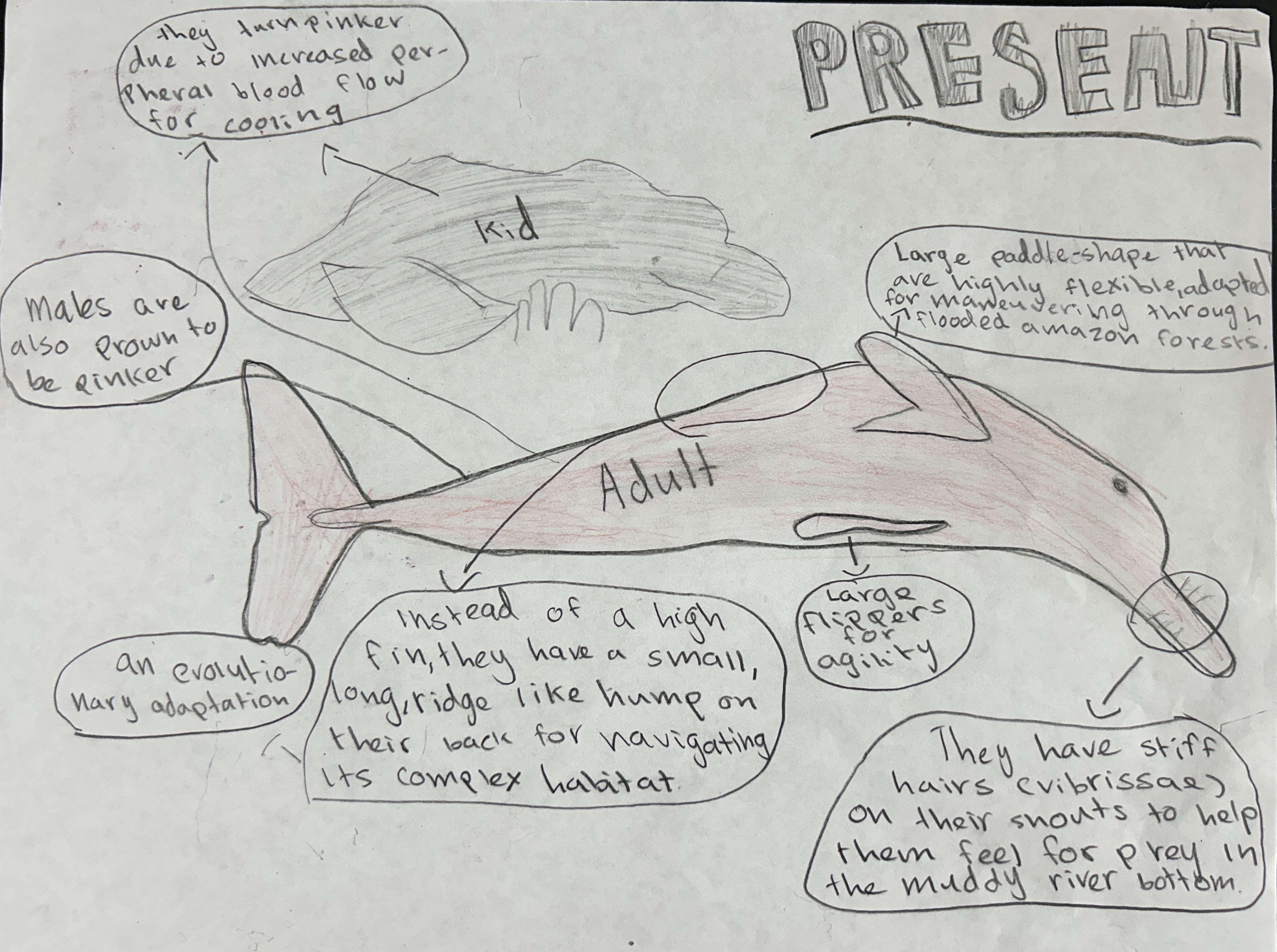 The Pink River Dolphin, or Inia geoffrensis home is the amazon rainforest. But not for long, with climate change, deforestation, and fires, it will change into a dry savanna. With this change the Pink River Dolphin will have to change, starting with habitat. It will have to live near water sources like Sasakwa Dam, where it can hunt in the daytime and hide in the water at night. They will also need new adaptations, for example changing from an all aquatic animal, to an amphibian, they will do this by their tail transforming into feet. They will not only have to change their habitat but also their food sources. These animals will go from an all fish diet to a mix of water animals and on land animals. The Pink River Dolphin after many changes will adapt and turn into a Pink Savanna Two Footer, or the Inia rayée pieds.