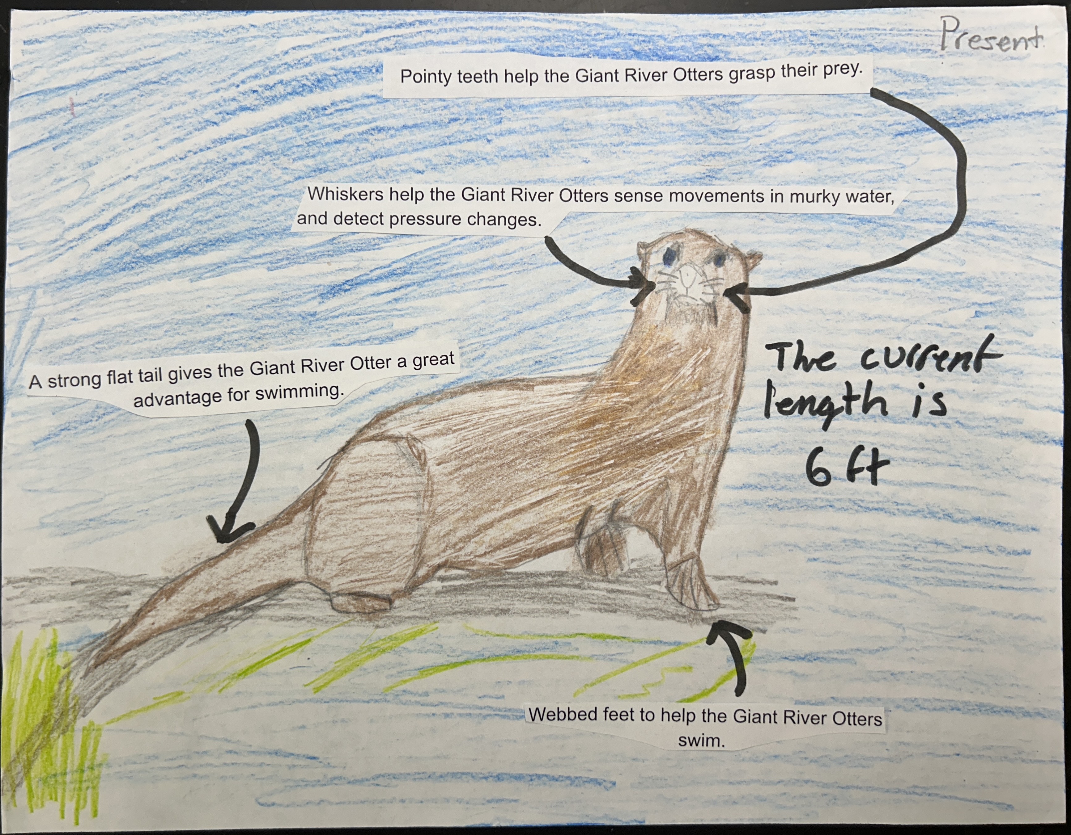 The current Neotropical Otter is brown. The color of the Neotropical otter helps it blend in with the river bank, and with logs in the water. The Otter is now yellow with stripes to blend into the savanna. The whiskers help the otter sense movements in the water. The Neotropical otter lost its whiskers because the otters no longer live in the water. The webbed feet of the otter were lost, and instead the otter got legs and claws to help the otters dig. The otter got larger ears for better hearing.