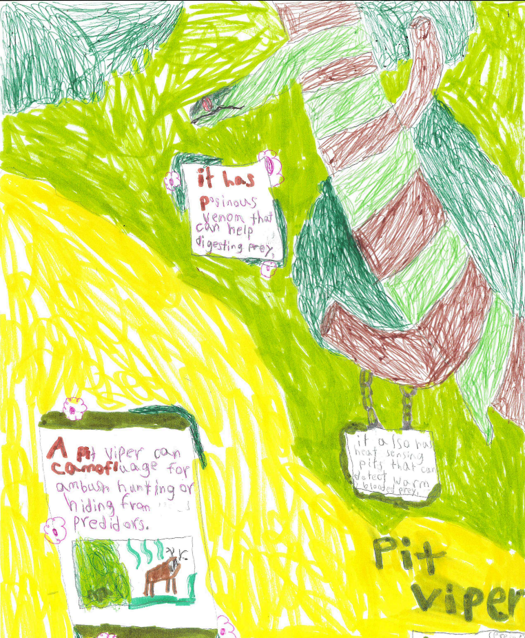 Present: A pit viper can camouflage for ambush hunting or to hide from predators. It also has poisonous venom that can help digesting prey. A pit viper also has heat sensing pits that can detect warm blooded prey.