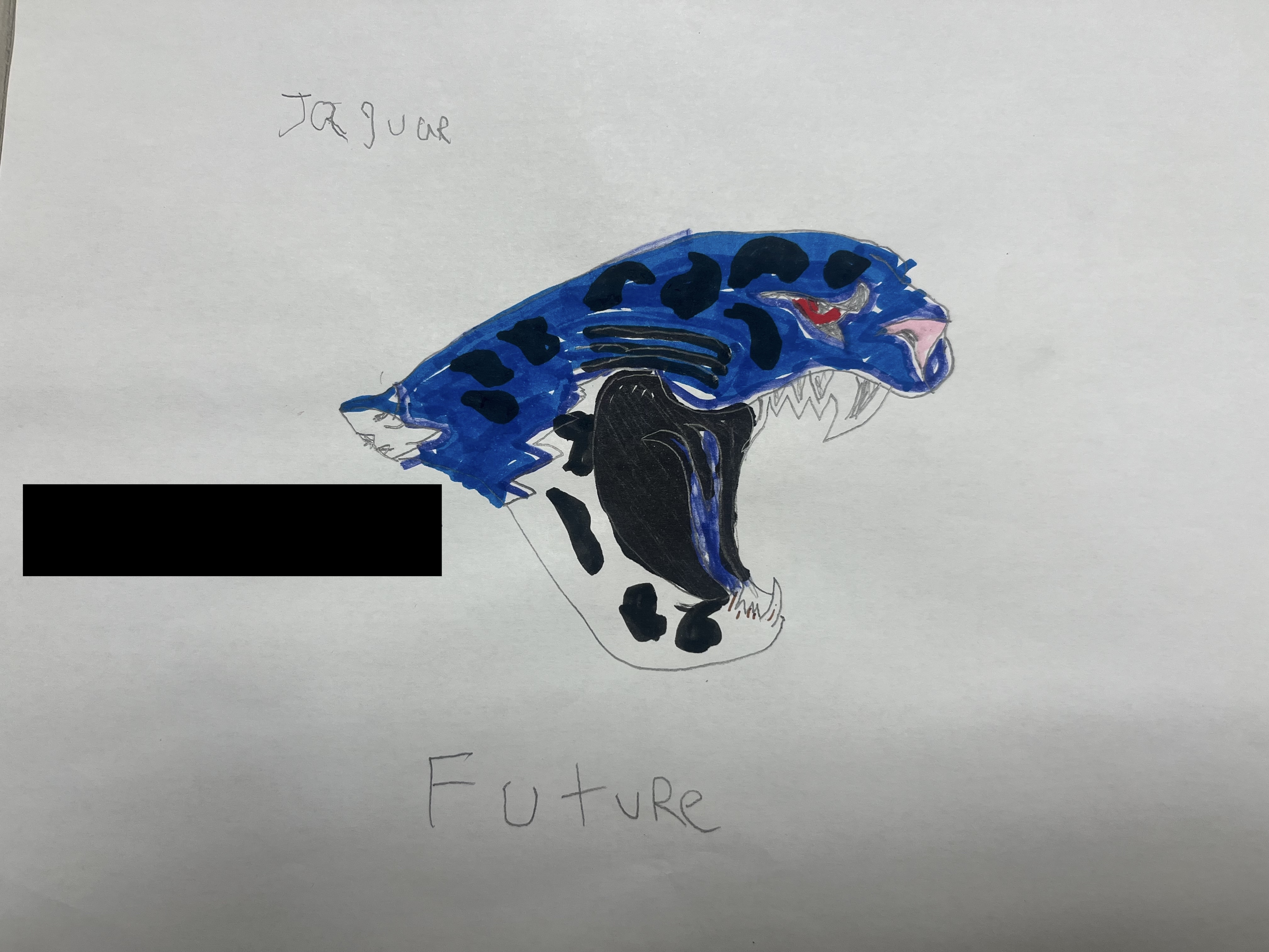 Jaguars right now are yellowish brown. But in the future I think they will be blue because they will need to live in caves to escape the heat. The cold will make their skin blue. They will eat bats and big bugs they will also eat small/medium sized rodents. Right now jaguars eat capybaras ,peccaries, turtles, snakes, birds, and fish. Right now their teeth are white but in the future I think their teeth will be black because of all the bats and bugs they eat.