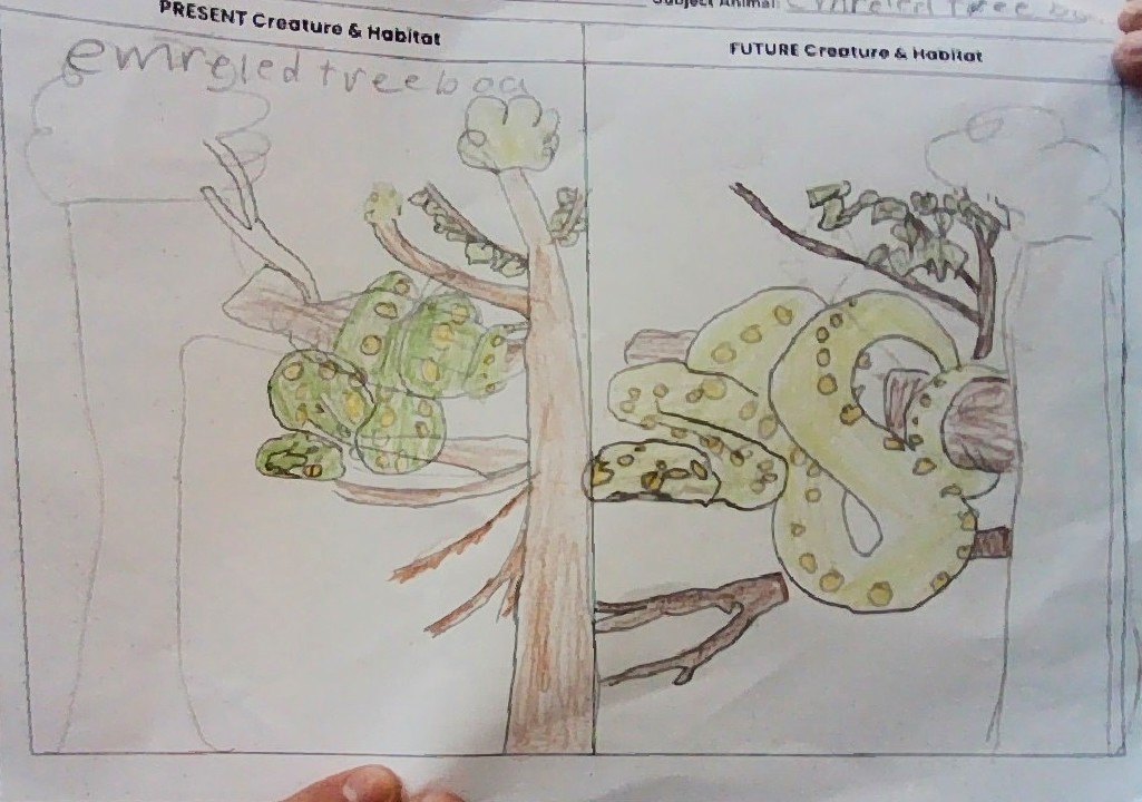 The animal I am writing about is the emerald tree boa. It lives in the rainforest environment. Recently, there has been an environmental shift such as climate change.