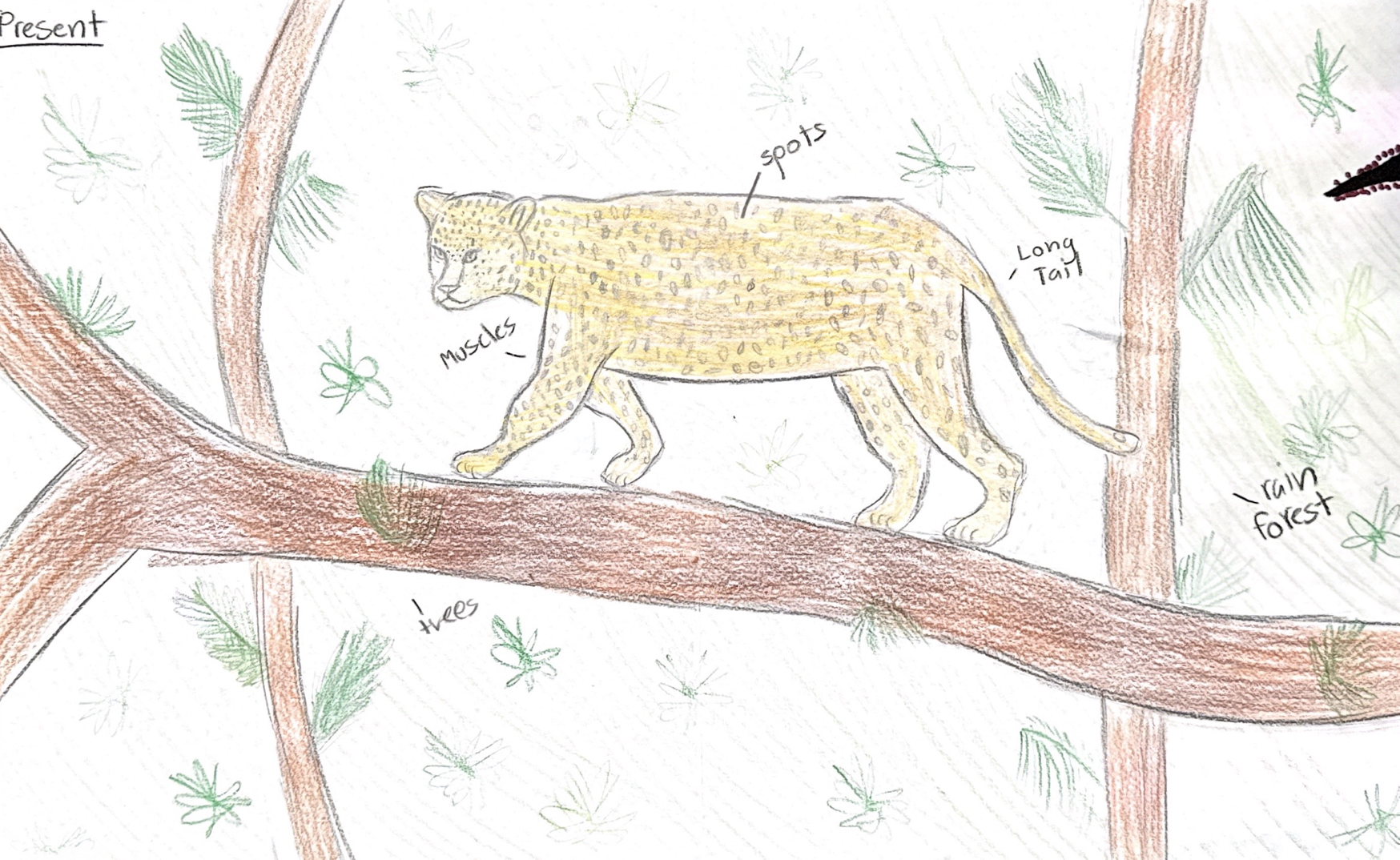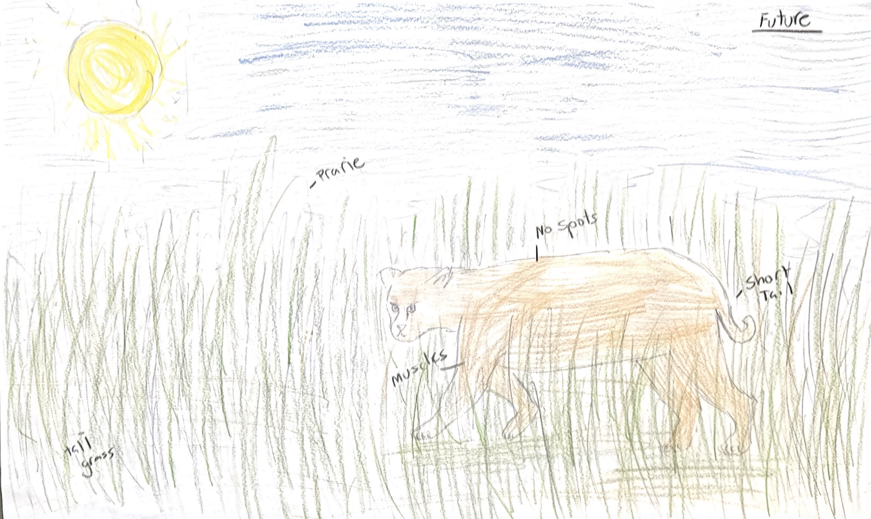 In the present the Jaguar lives in a rain forest environment, but in 50 years due to deforestation the rain forests will probably become prairies and fields. The Jaguar has a spotted design on it's fur to help it camouflage in the leaves and forest floor, but in the future it will lose its spots and turn a beige color to camouflage in the tall grass. It also has a long tail to balance in the trees when jumping and hunting, but in the future it wont need it since there are no tree. So it will be shorter to blend in more. They will keep their muscular body, legs, and jaw to help it hunt and run.