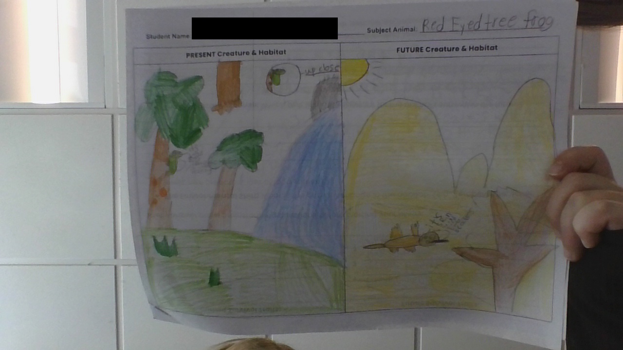 The animal I am writing about is the Red eyed tree frog . It lives in the rainforest environment. Recently, there has been an environmental shift such as a warmer climate.