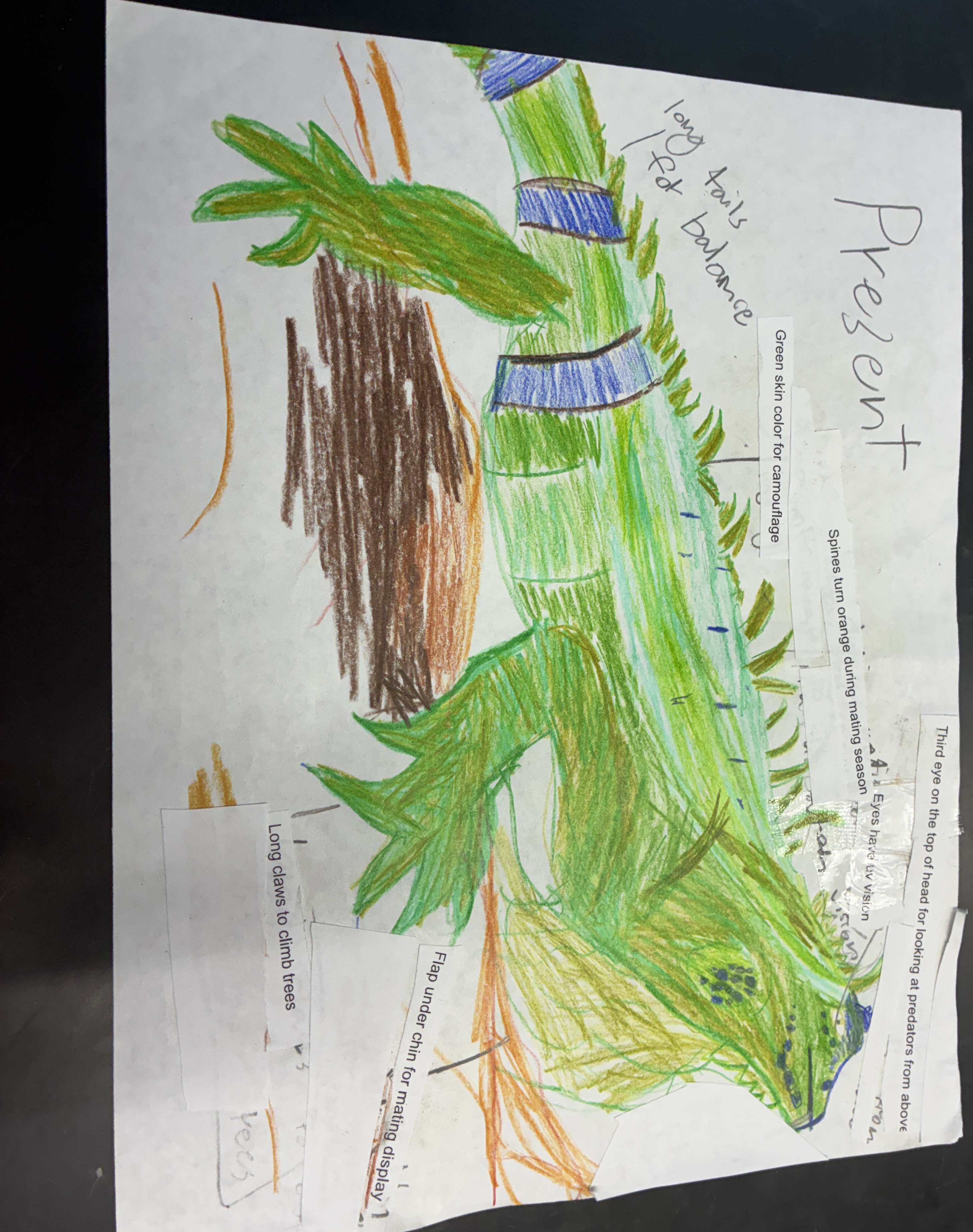 Storing water in its dewlap through fats, Instead of communicating through head bopping, they will use quick tongue movements in order to stay hidden, I think since the savanna will have less herbs for the iguanas so they will now hunt in the water for fish and such, they will need webbed feat in the back, so they can swim faster.