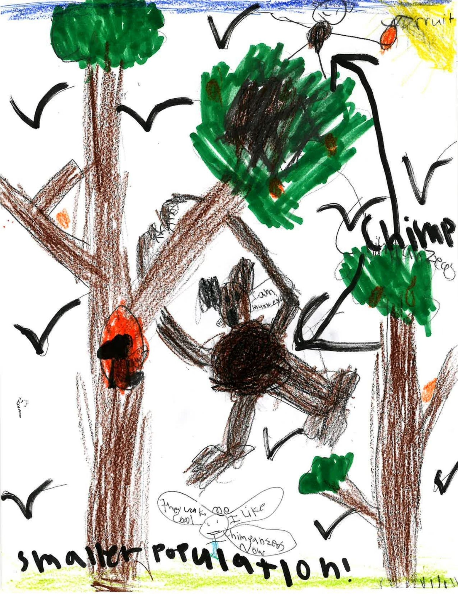 In 15,000 years chimps will be smarter. Humans are going to chop all the trees in the forest. So chimps go to the ocean where more trees will grow. They would build their homes high up to stay dry. Nice people would build big platforms for the apes. They would go in the water and have webbed feet and long nails too. They would eat fish and fruits. They make fishing rods to fish. This is what I think chimps are going to be like in 15,000 years!!