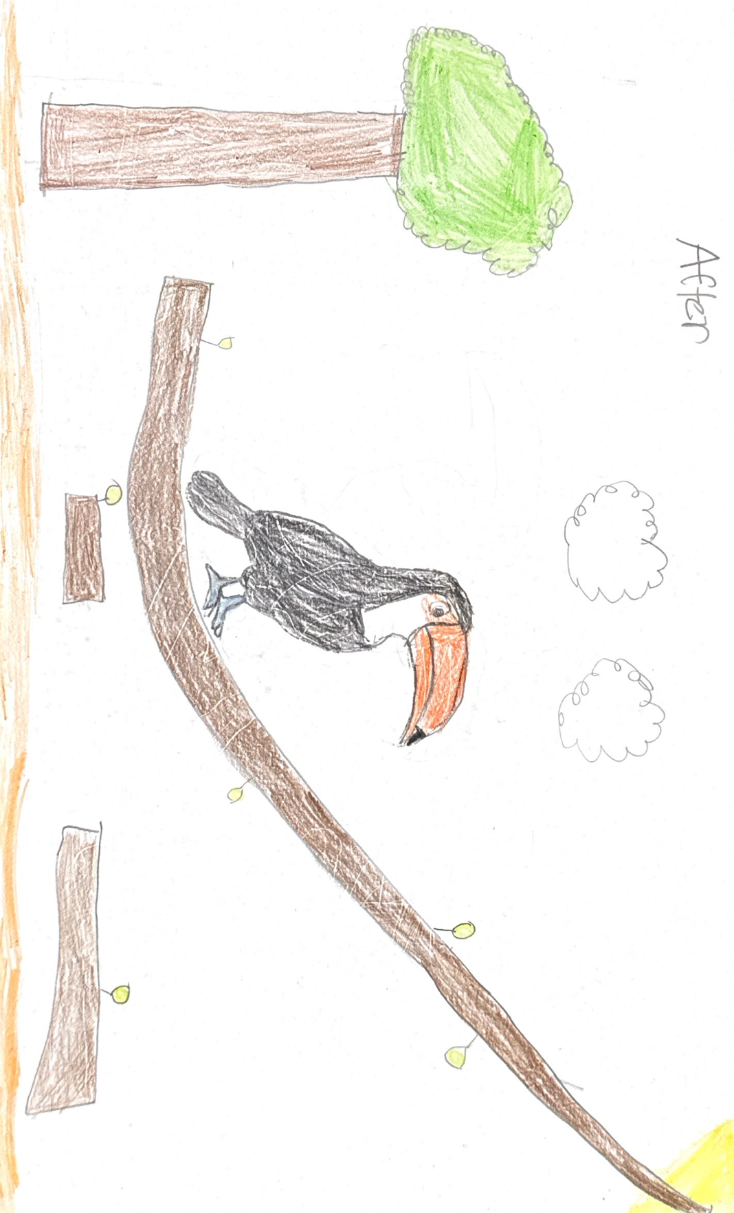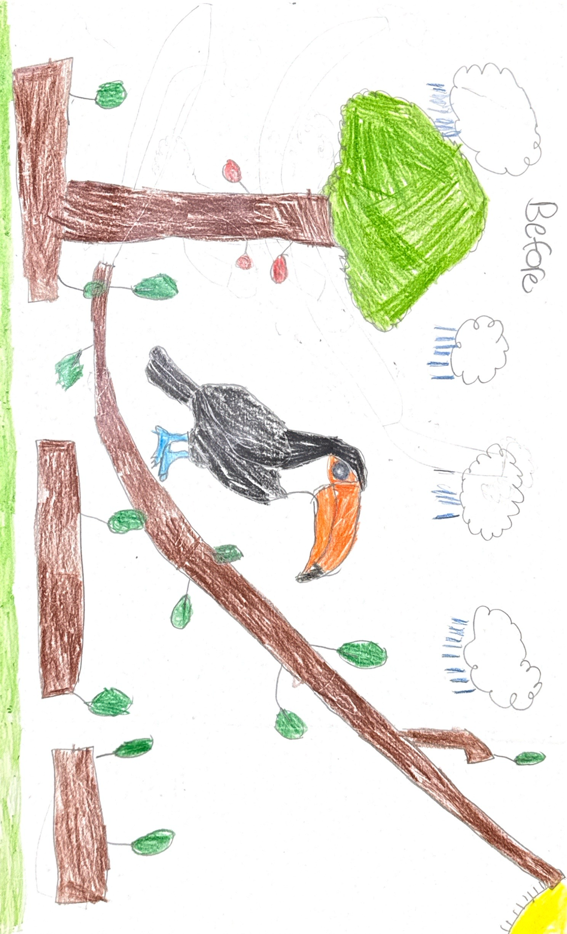 Many years later, with climate change and global warming, the toucan has lost its color and most of its nutrients are either gone or have changed. Water was not easily available and most of its shelters were destroyed, because humans have chopped down the toucan environment to build buildings. Also, the toucan needed to breathe fresh air and with fewer trees, the air quality became dirty and toxic. The toucan's way of living also changed due to forced migration to a different place, because of how bad life was for animals in the rainforest.
