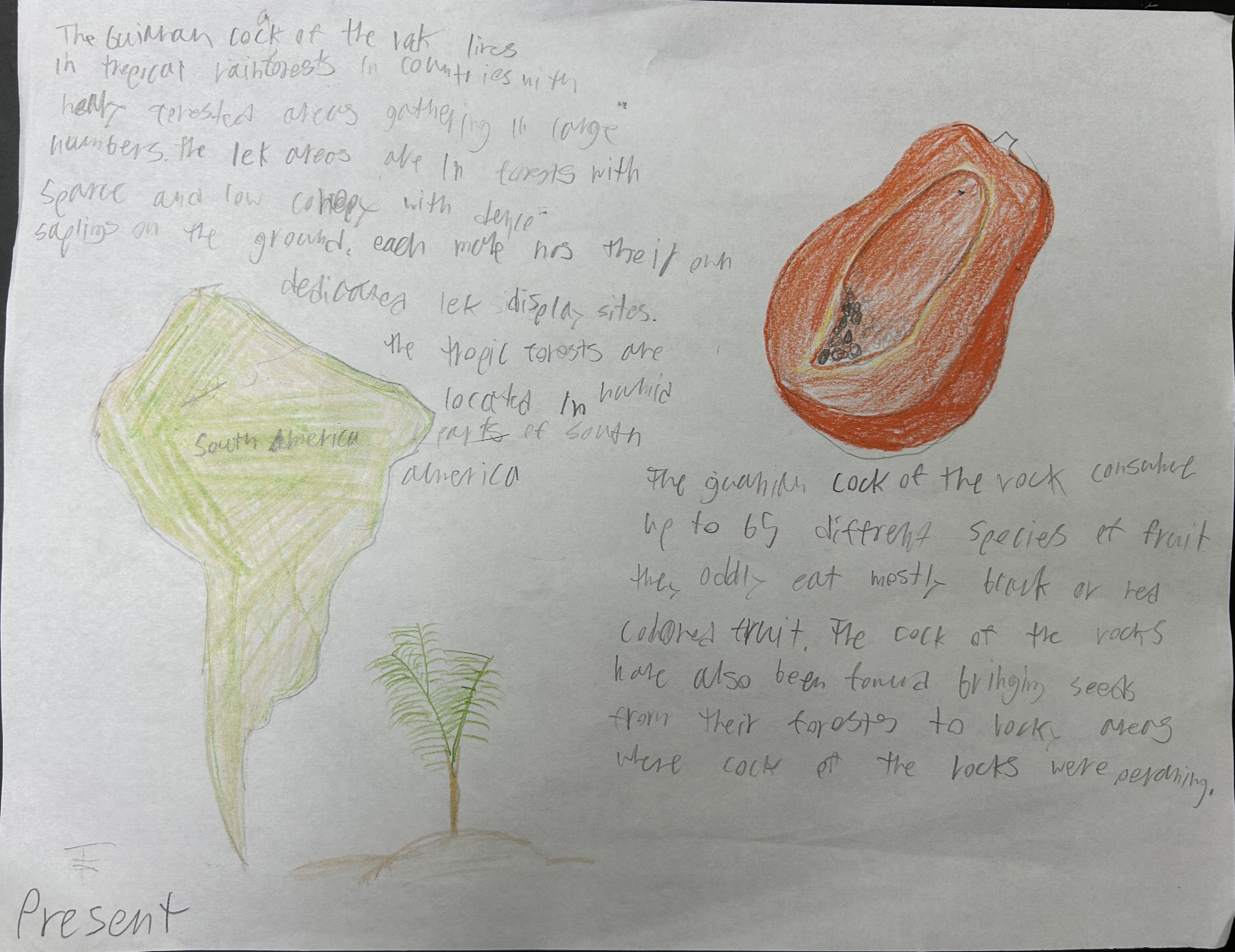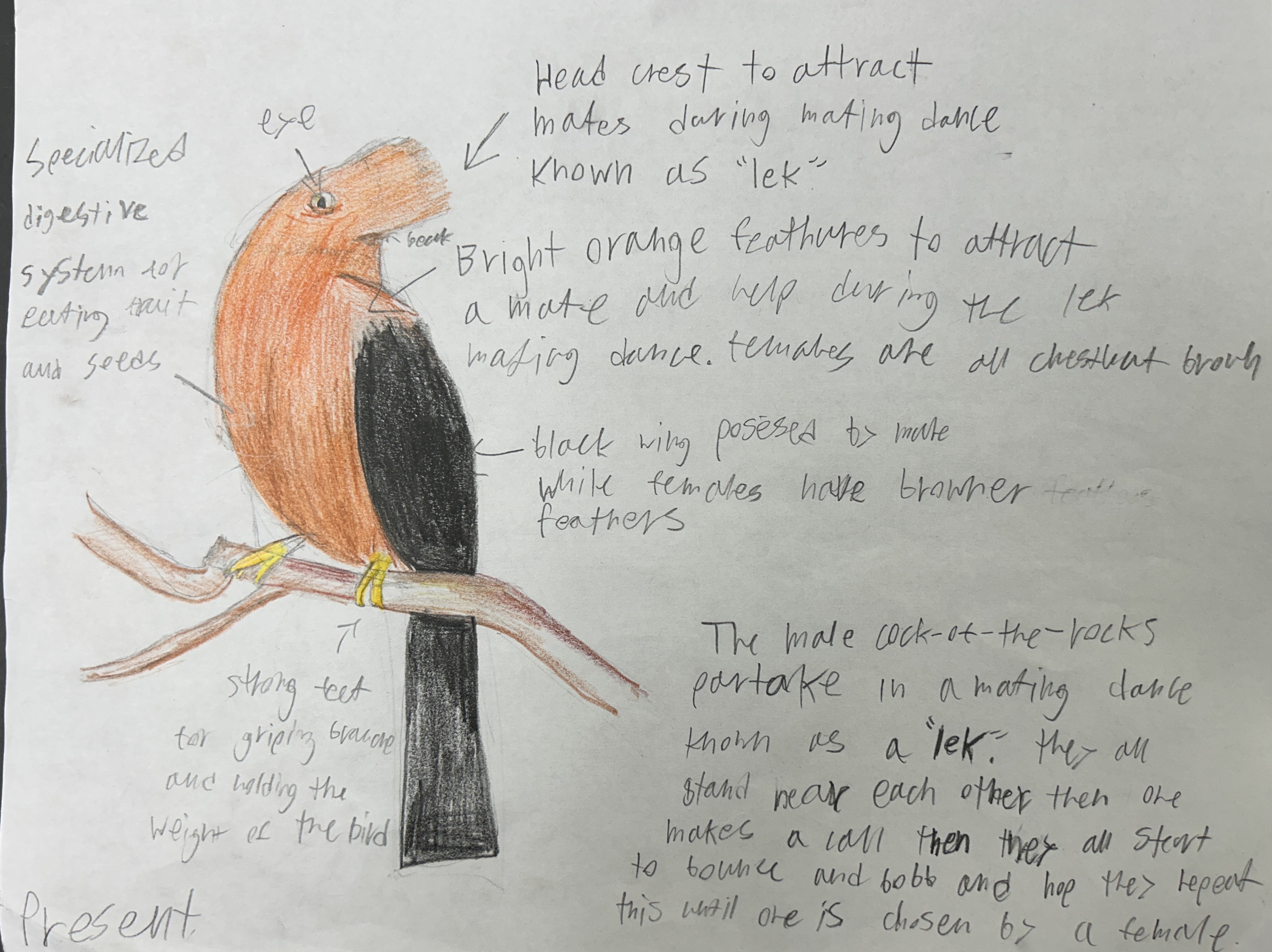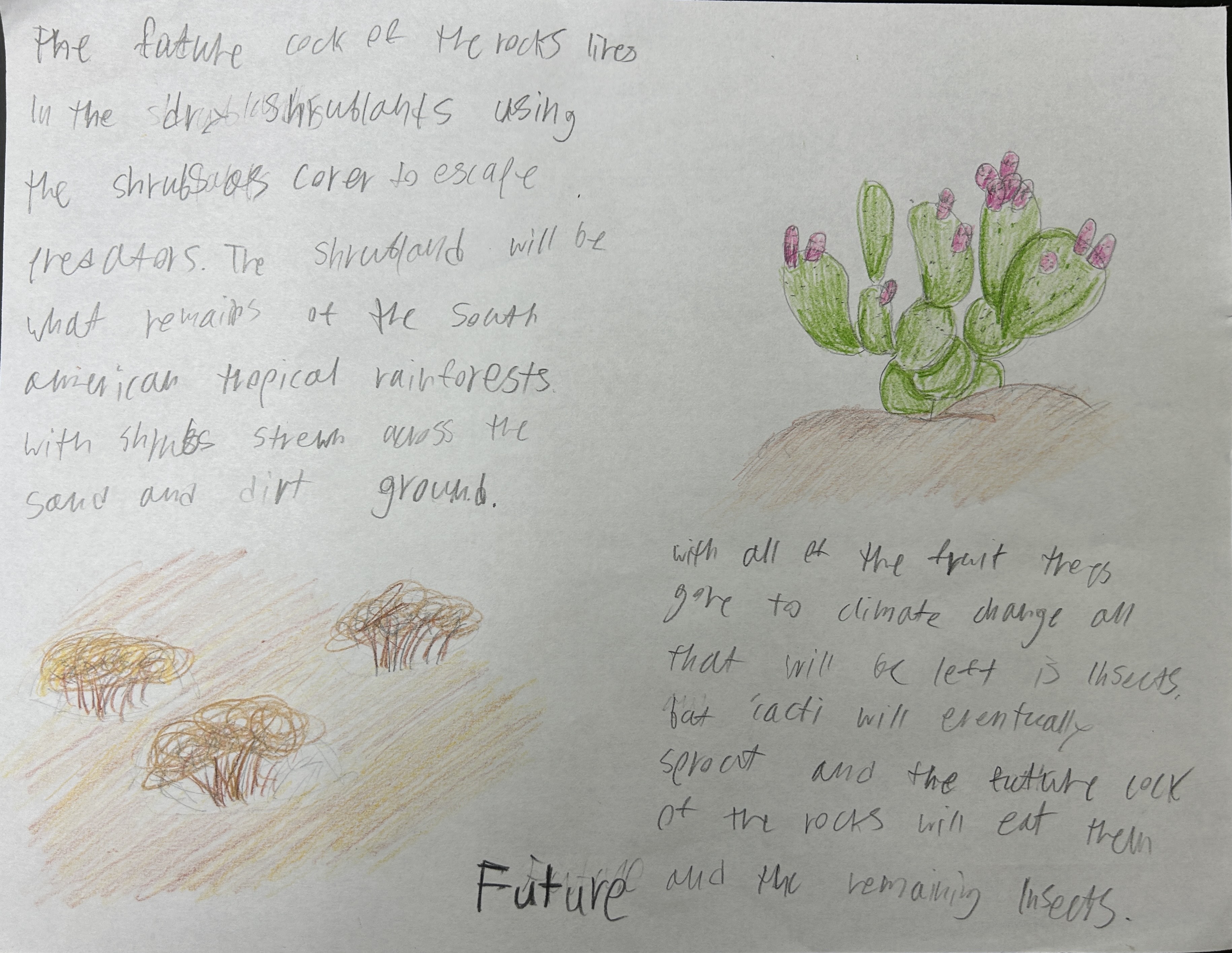 The present Guanian Cock-of-the-rocks lives in humid tropical rainforests of South America near rocky mountain areas. I believe the Tropical Rainforest will change to a dry shrublands because of the climate change heating it up and getting rid of all the humidity causing it to dry out, with all the large trees and plants dying to lack of water only the shrubs will survive leaving to them drying out but not dying, creating the shrublands. The present cock of the rocks has a powerful digestive system to consume more that 60 species of fruit, the future Cock-of-the-rocks
