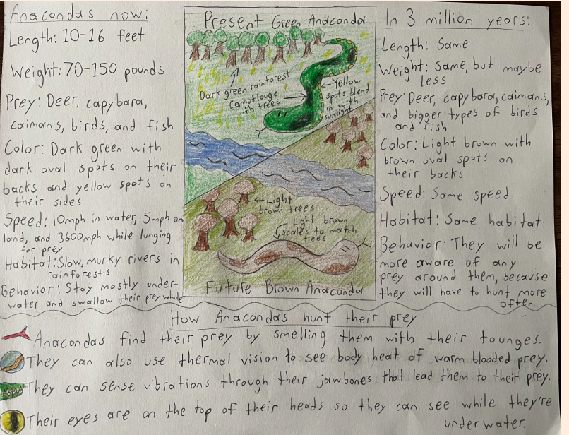 Prey: Currently, green anacondas eat something big every few weeks, but their prey is shrinking, mostly because of climate change, so in about three million years, most of their prey is going to be too small to give them enough energy for a whole week. This will force anacondas to hunt more often.