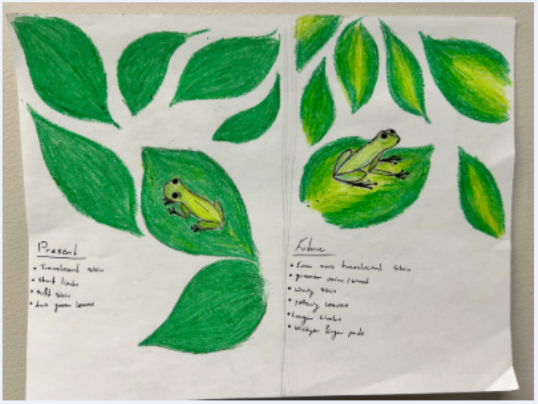 Currently glass frogs live in rain forests located in central and south america and are classified as critically endangered. They eat a wide range of insects and are mostly known for their translucent skin. Their skin helps them camouflage and blend into their surroundings by letting light and color pass through, becoming even more see through while they sleep. The adaptations I made were greenish colored veins, waxier skin, longer limbs, and more sticky finger pads. Having greenish or more clear veins will help them blend into the leaves even more, so when they sleep not only their skin will be translucent. Other adaptations like waxier skin will help conserve moisture because in the future the environment is also drying as shown in the yellower leaves. Lastly, longer limbs and stickier finger pads will help them escape and withstand any extreme weather like high winds.