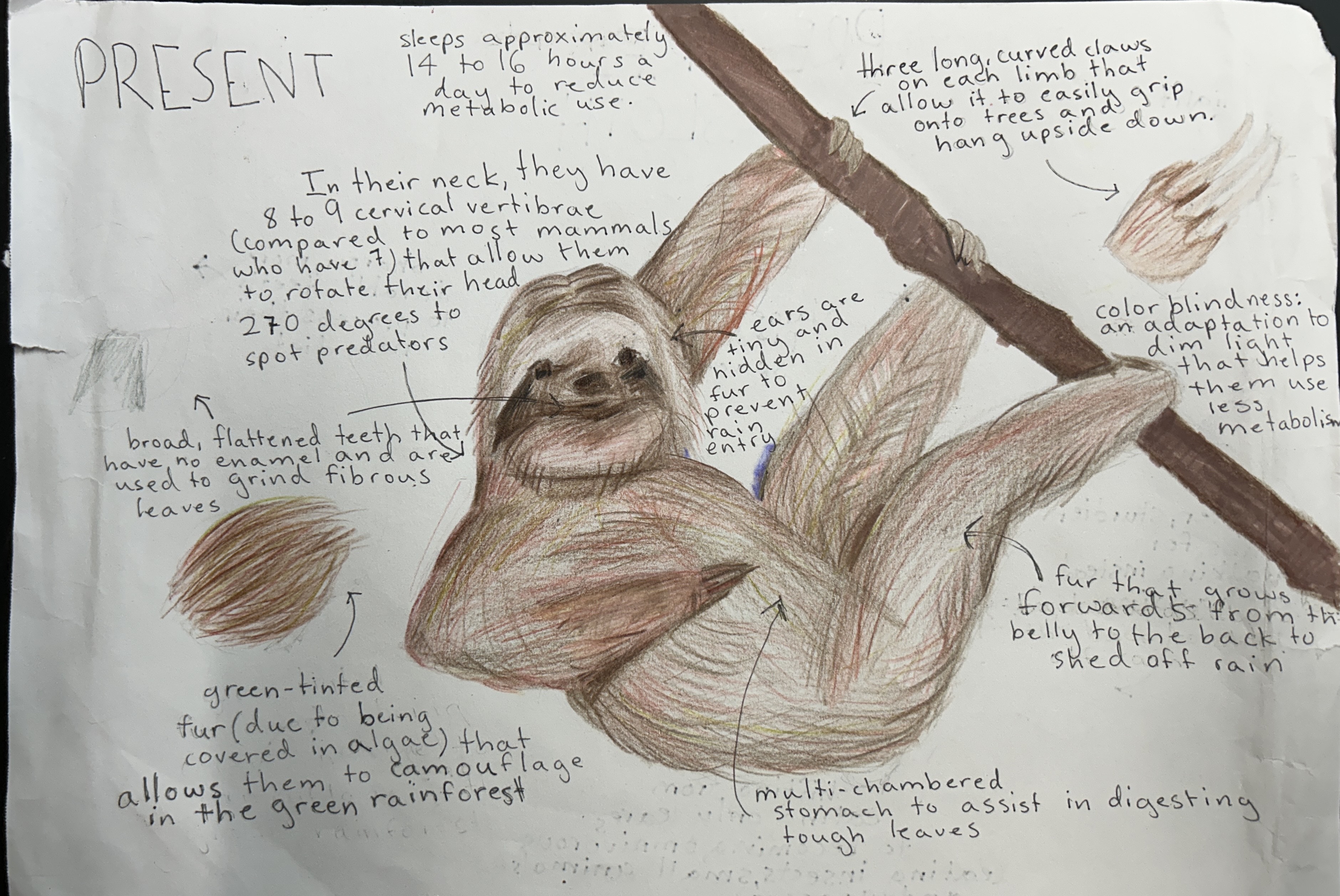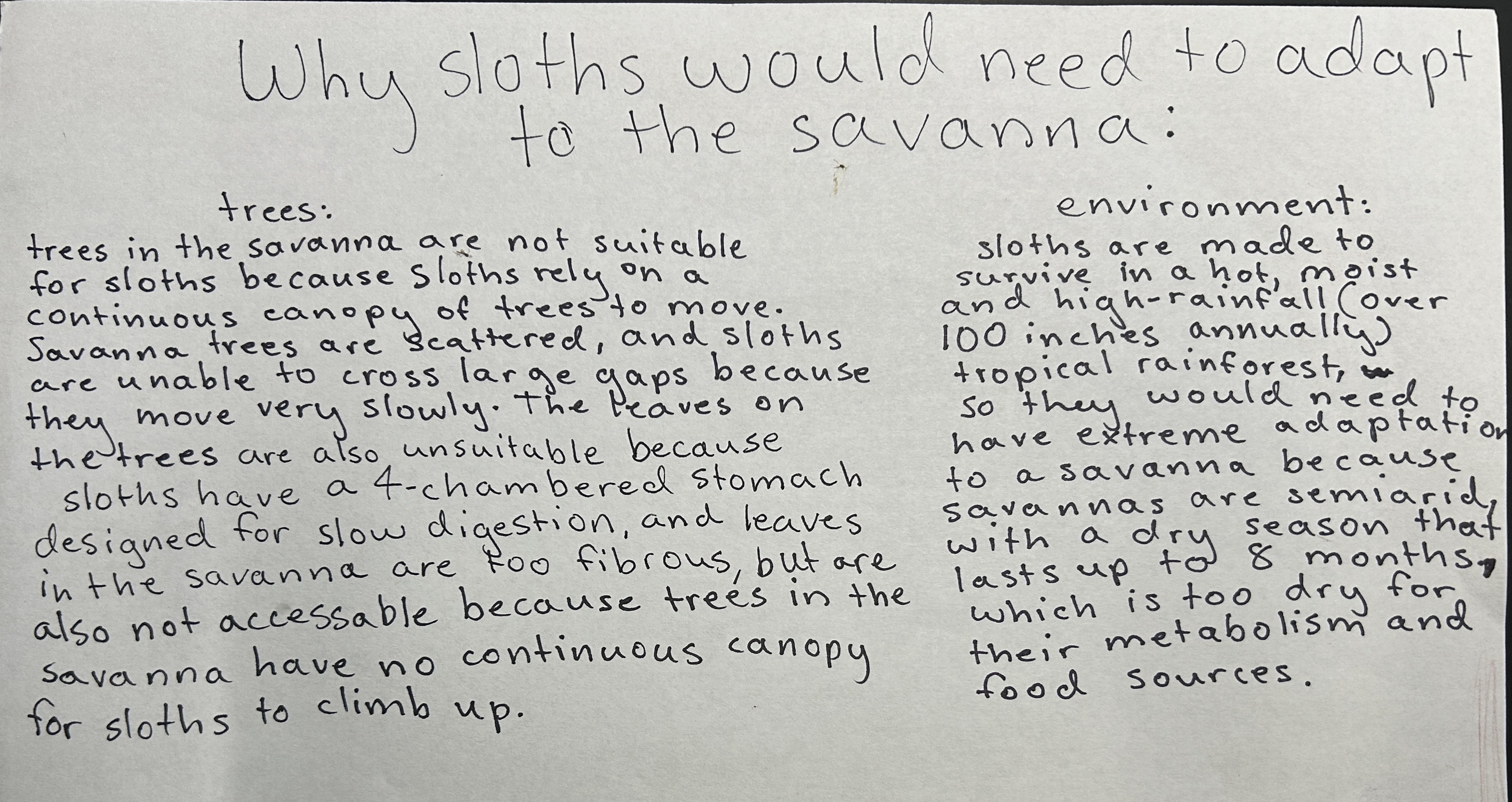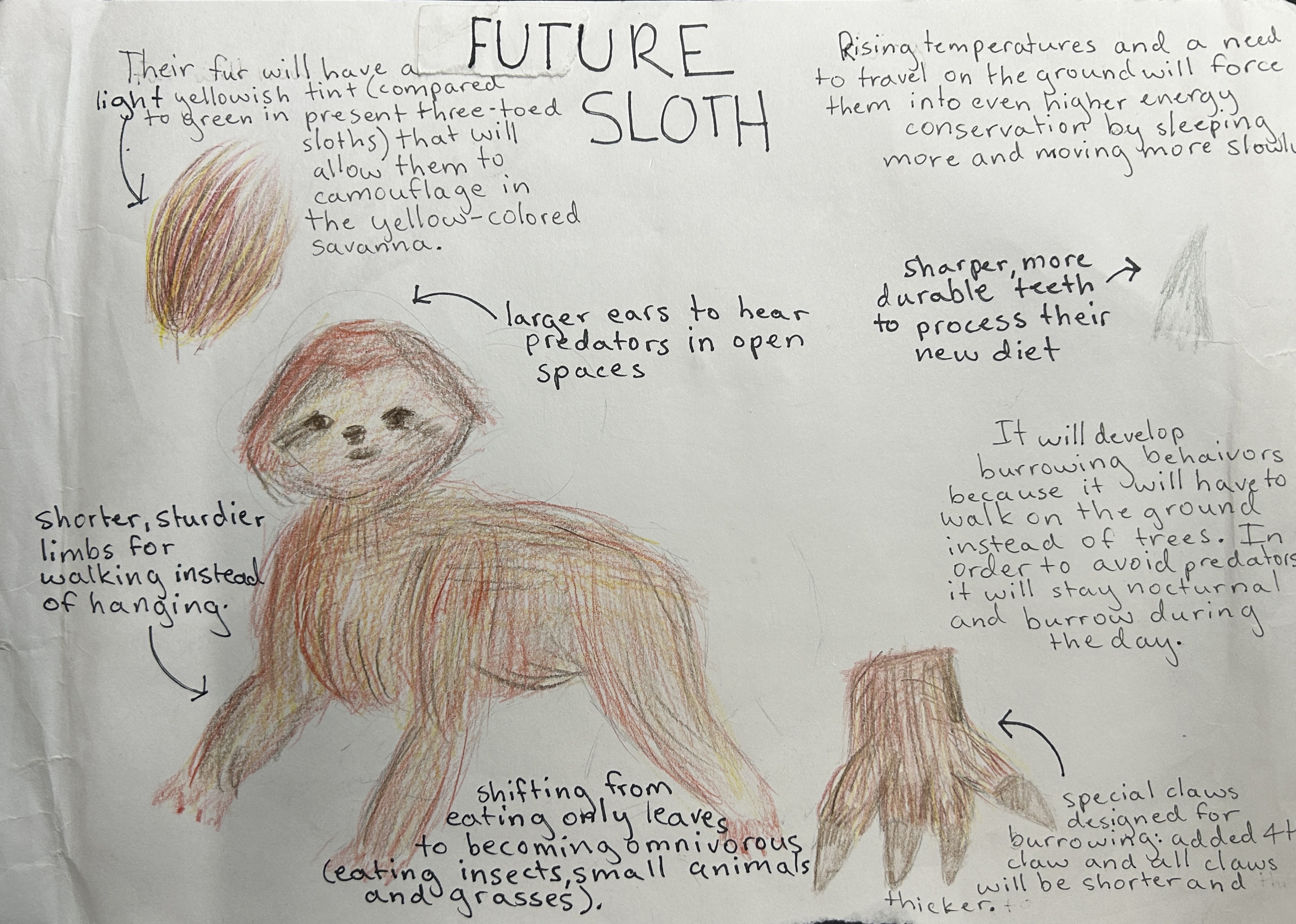 However, in about a hundred years, the rainforest is predicted to change into a savanna, a yellow-colored, subtropical grassland biome known for its continuous carpet of grasses, intense dry seasons, scattered trees, and woody shrubs. The brown-throated sloth is not suited for a savanna-like environment, so over a very long time, drastic changes would need to be made: a new diet, yellow-tinted fur to blend in with the colors of the savanna, burrowing behaviors, even higher energy conservation and more.