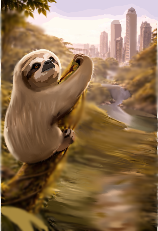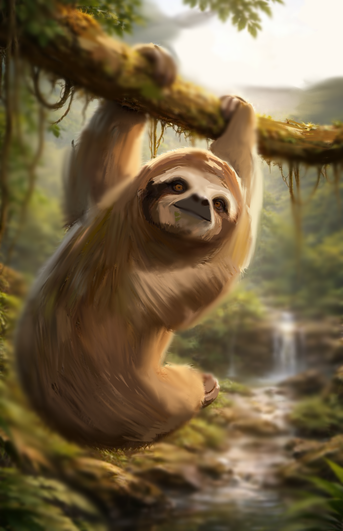 Today’s sloth lives high in the tropical rainforests of Central and South America. It has long arms and thick brown fur, often covered in green algae for camouflage. Sloths rarely come to the ground and depend on large, connected forests for safety and food. They sleep for about 10 hours a day.