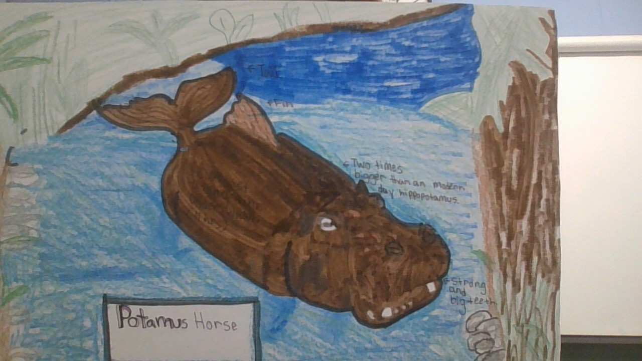 The “Potamus Horse” lives in rivers of rainforest and can last three and a half hours under water, that's more than a whale can last under water. The Potamus Horse uses its nostrils to catch air after every three hours. The Potamus Horse is an adapted Hippotamus due to environmental changes the Potamus Horse has fins and a tail for swimming and razor sharp teeth and is two times bigger than a modern day Hippotamus.