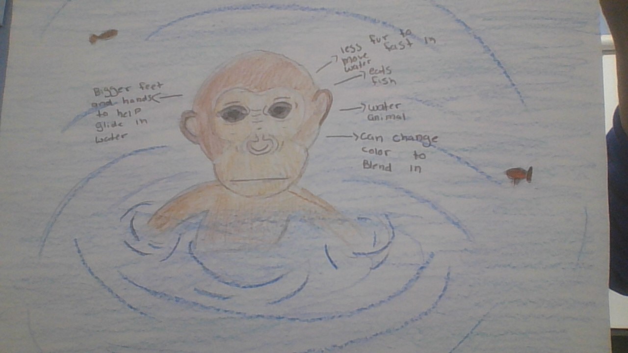 My water monkie swims in the water and eats fish, changes color to blend in with its habitat, and also has less fur to move in the water. It is considered a water animal.