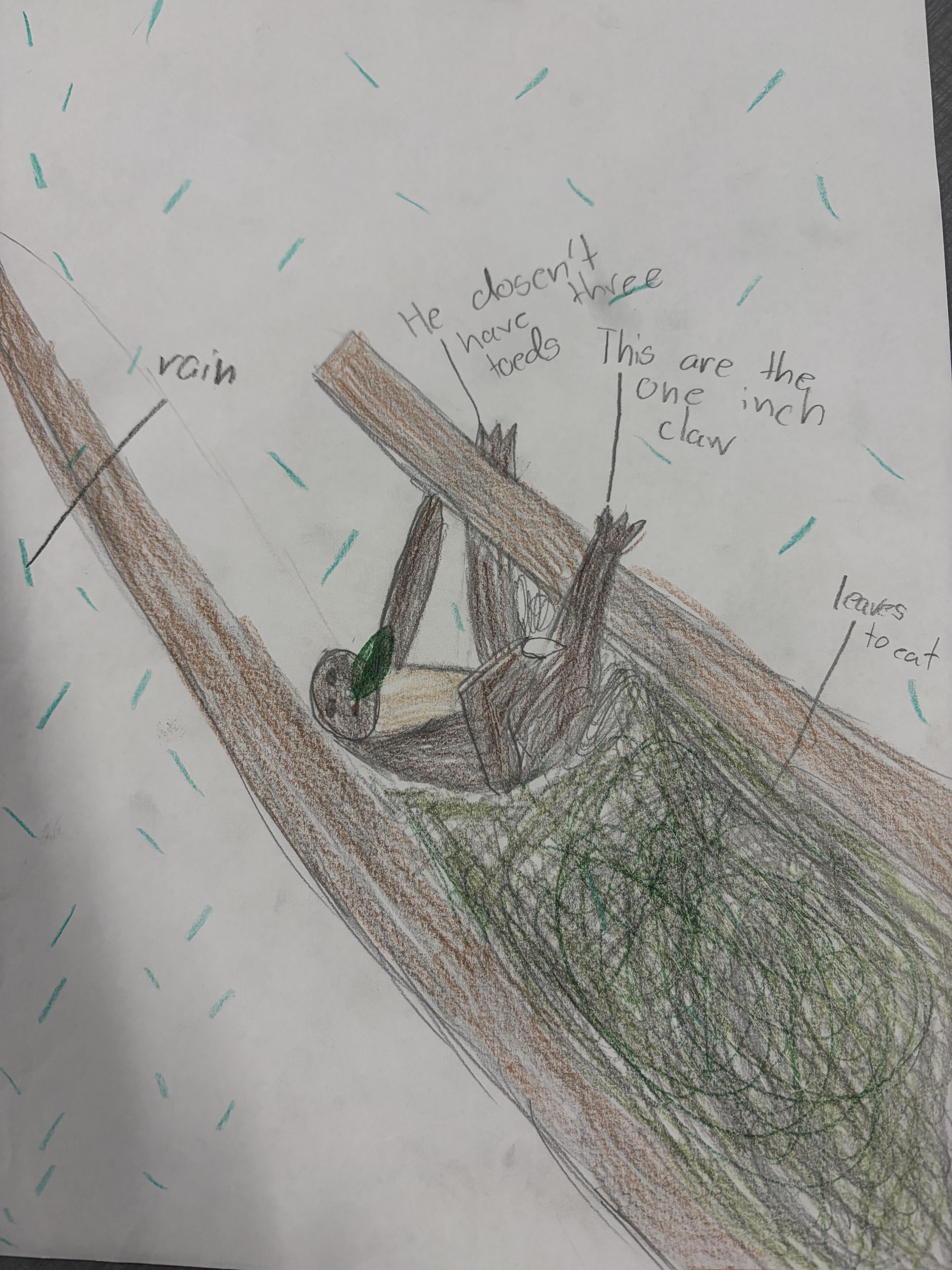 The three-toed sloth lives in the amazon rainforest. It loves to sit in the trees. Its favorite foods are leaves, twigs and fruit. The three-toed sloth moves so slowly that its fur takes on a green tinge from the algae that grows on it. The sloth’s thick fur helps it to hide from predators.