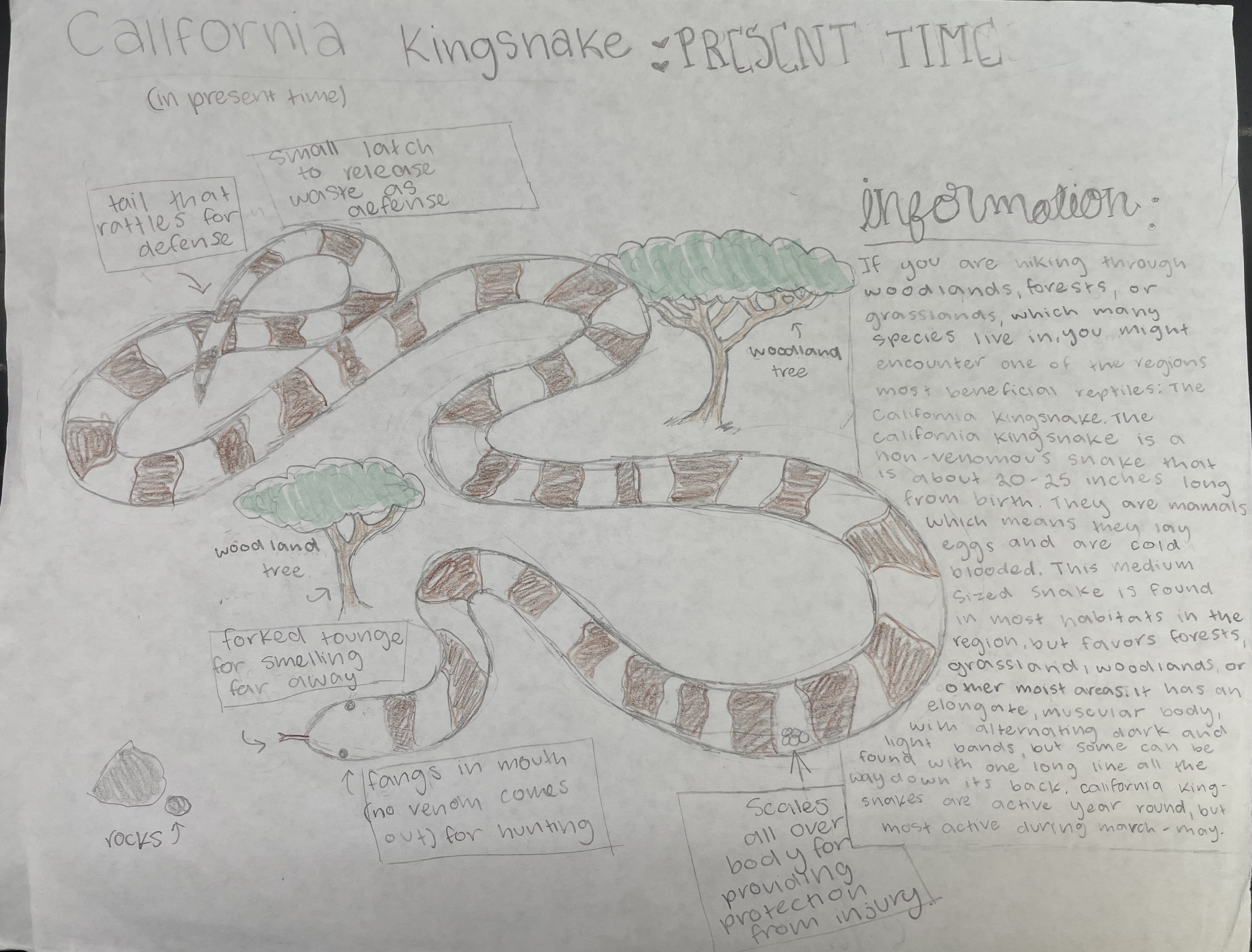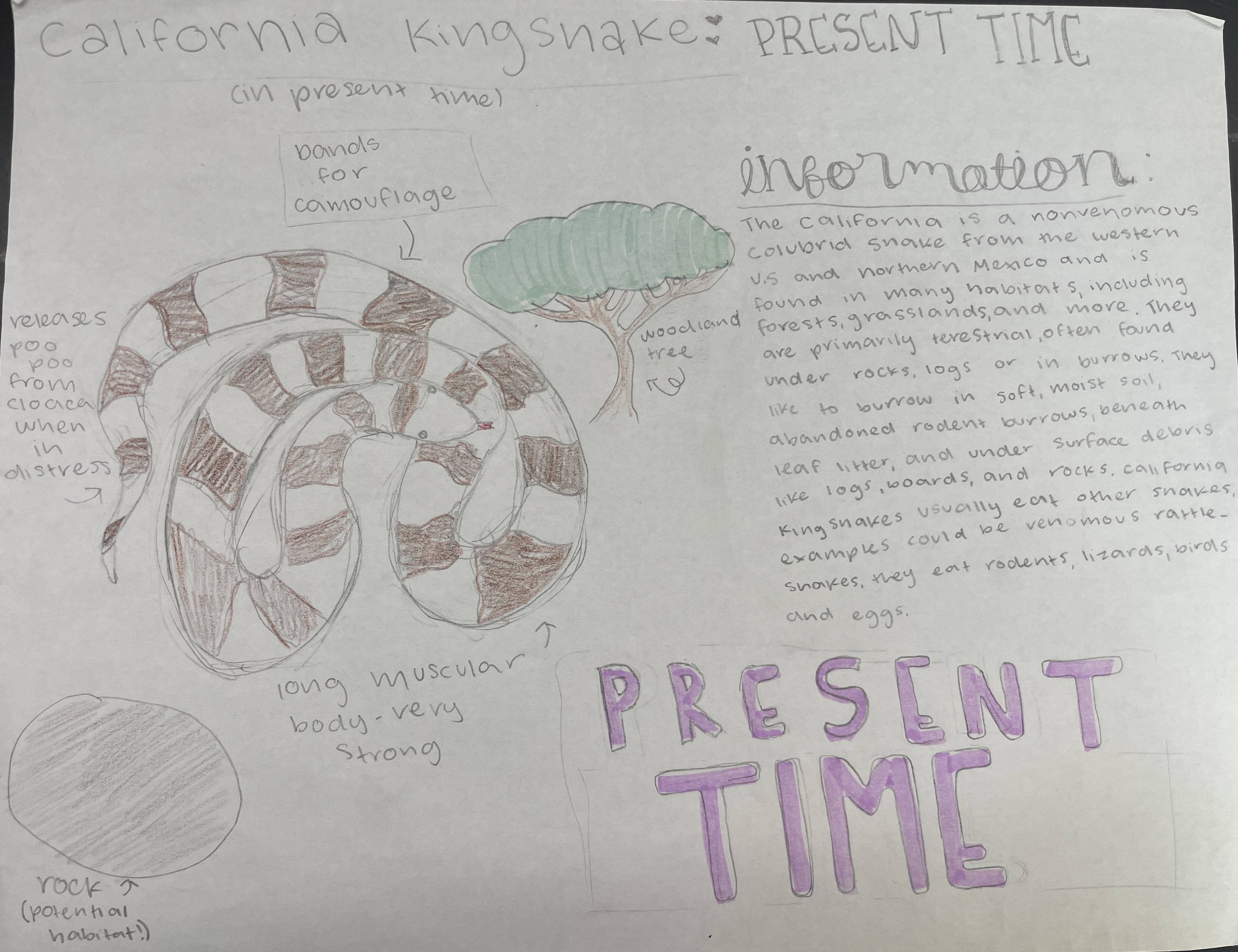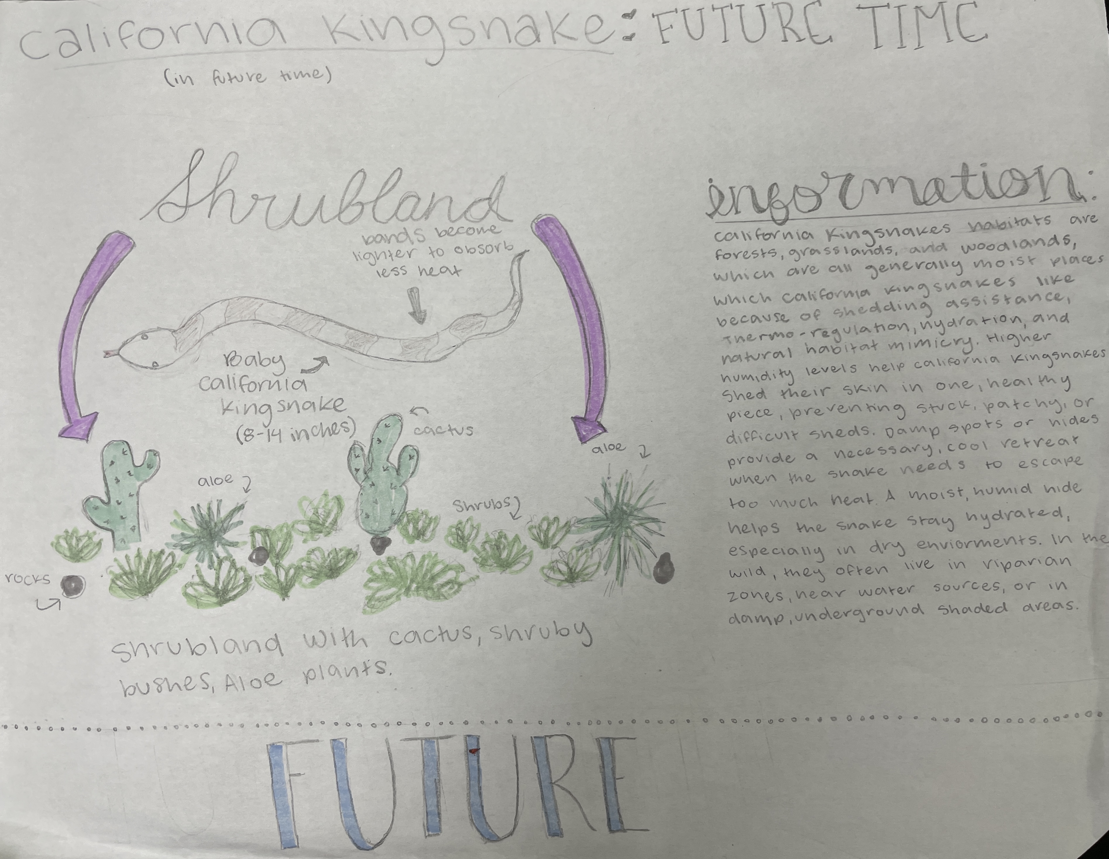 The California kingsnake is a non-venomous snake known for its smooth, shiny scales and black-and-white or brown-and-cream banded pattern, which helps it hide from predators. Growing to a medium length of 3- 4 feet, it can easily move through burrows and underbrush to hunt rodents, lizards, and other snakes. In the future, these snakes may live primarily in shrublands, using dense bushes for shelter and protection from heat. They might develop reflective or lighter- colored scales to stay cool and become more active at night to avoid extreme daytime temperatures. Structural changes like longer tails and bigger eyes could help them move and see better in bushy environments. Behavioral and physiological adaptations, such as burrowing, hunting at night, slowing metabolism, and conserving water, would allow them to survive in hotter, drier habitats. These traits and adaptations show how the kingsnake may evolve to thrive in a changing environment.