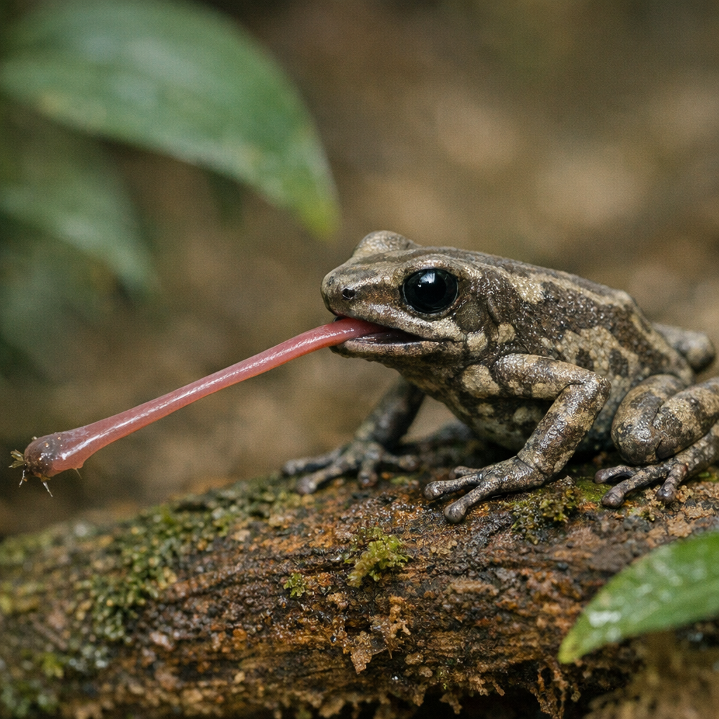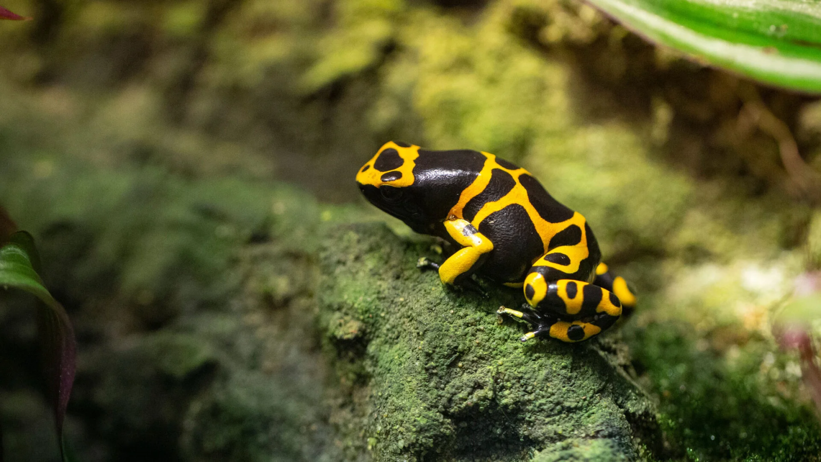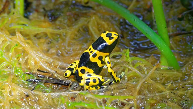 Their bright colors are a warning to predators, a clever trick called aposematic coloration. Unlike many frogs, poison dart frogs don't have webbed toes, so they aren't good swimmers and spend their time hopping around the forest floor. Their diet mostly consists of termites and ants giving them the nutrients they need to survive. They catch animals by using their long stick tongue which is ⅓ of their body and their excellent eyesight. A poison dart frog is very social and often stays in pairs or small groups.