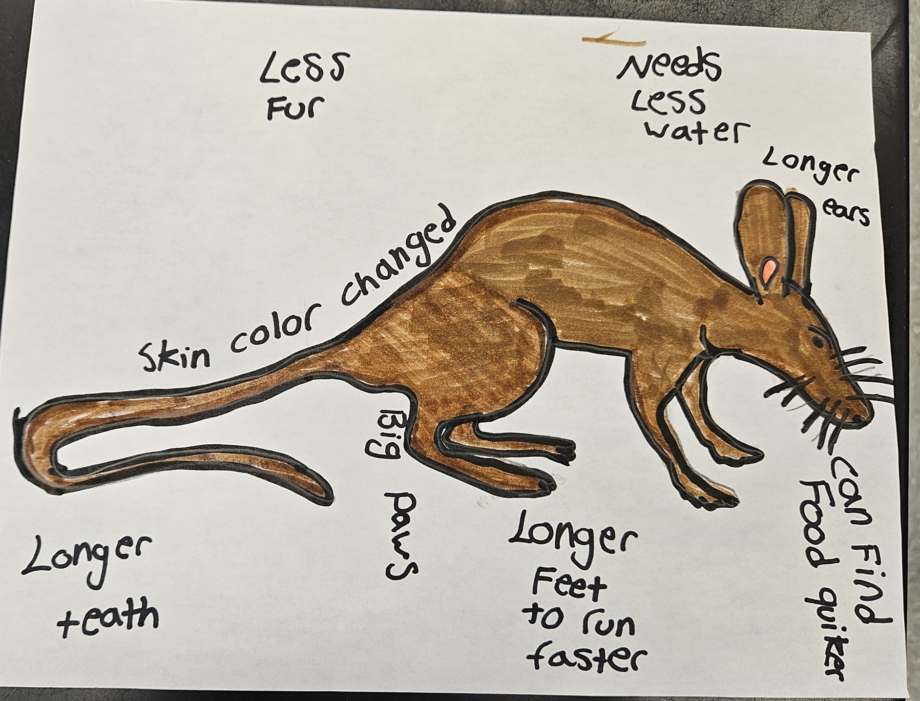 In the future I think it will have less fur, change skin colors and adapt to need less water. I think it would look like a hair–less cat that is short and small. It would also have bigger paws and need to change its diet. Since the rain forest is getting smaller it would need to find food quicker so it has to be faster. If it changes its diet it would need sharper and longer teeth.