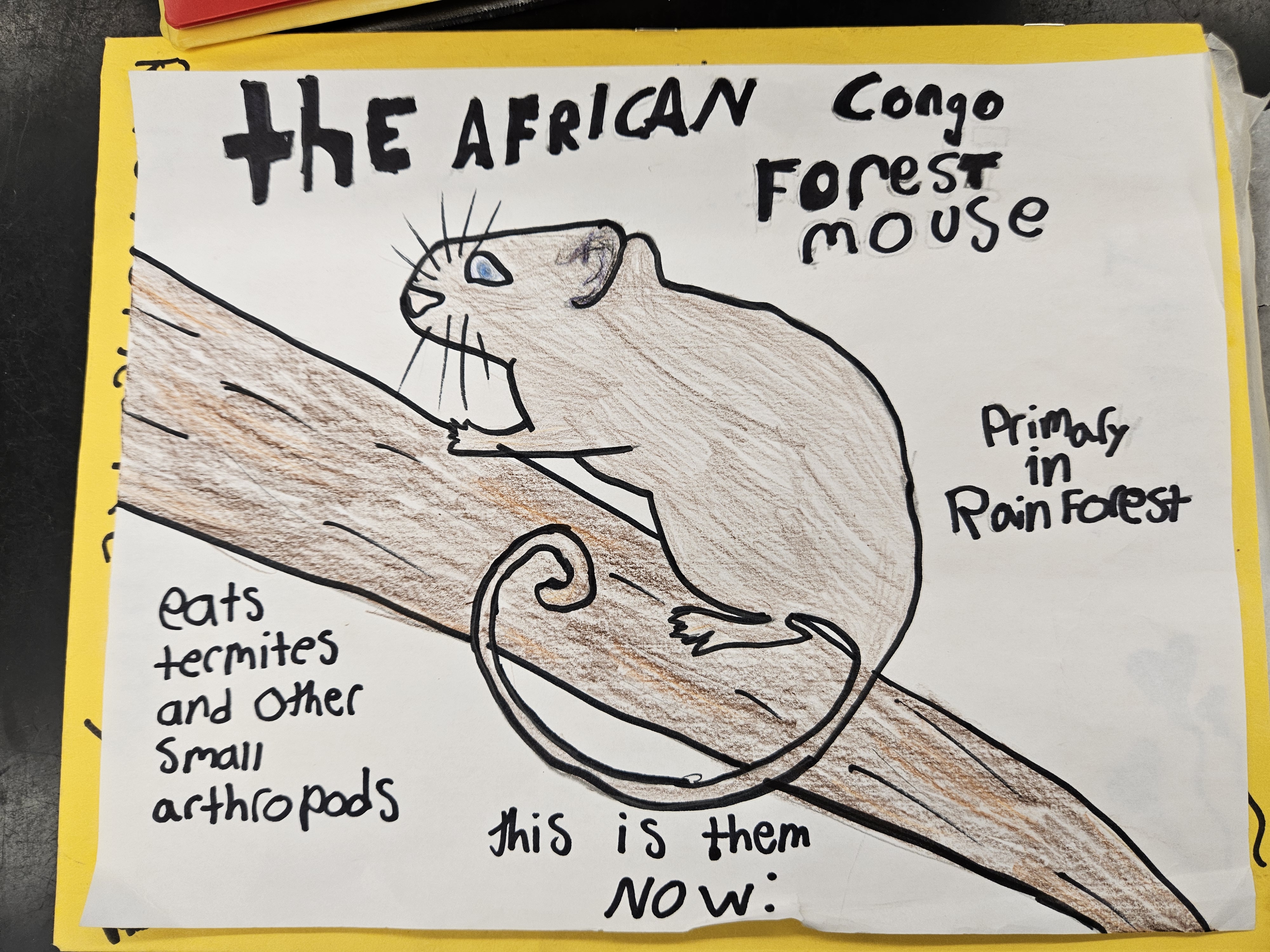 The African congo forest mouse primarily lives in the rainforest, they eat termites and other small arthrobites. It has a long tail for balancing and maneuvering through climbing habitats.