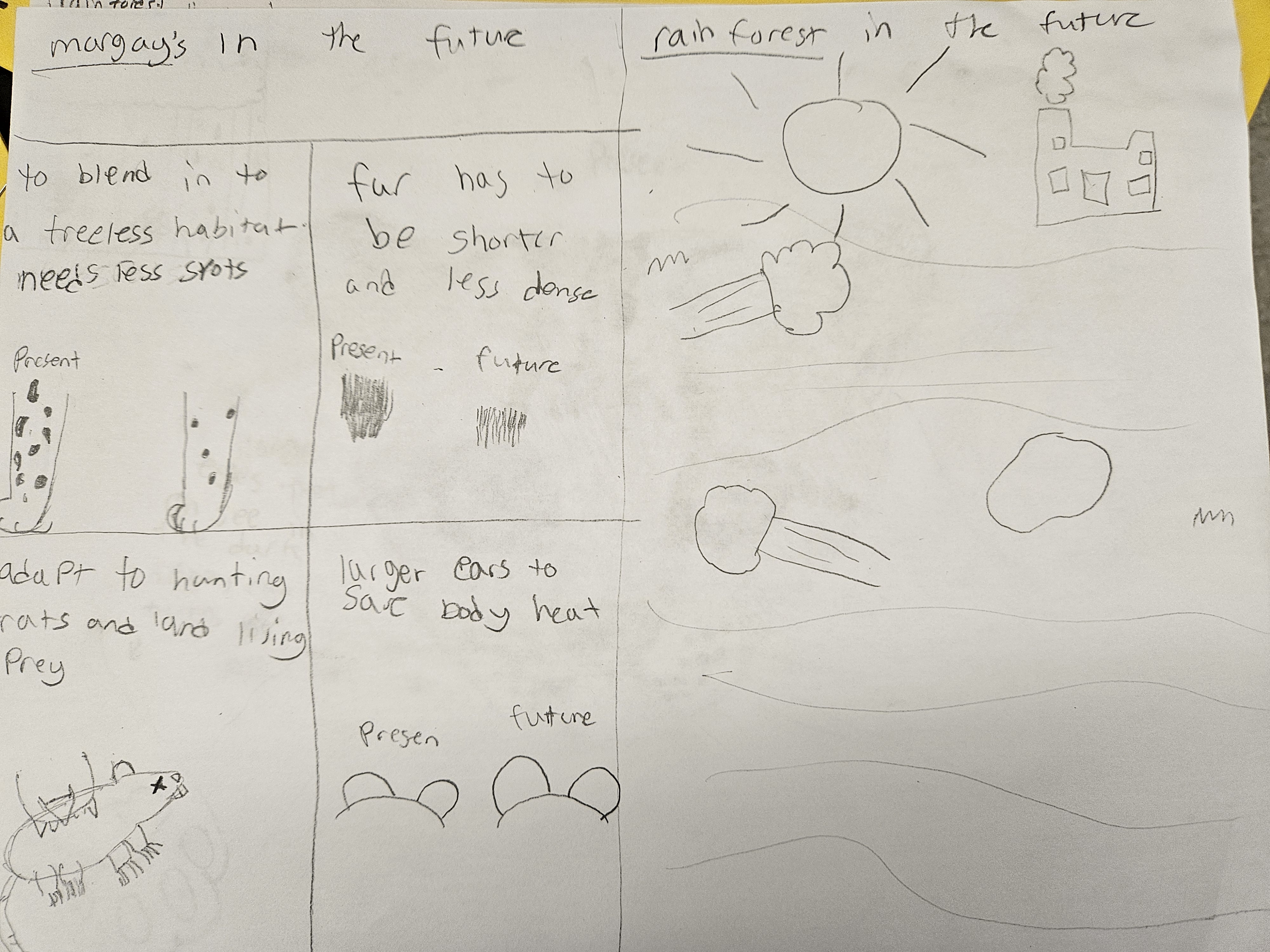 I think that due to deforestation margays will have to adapt to living mostly on the ground, and hunting more rats and birds than monkeys. They will have to grow shorter and less dense fur to stay cool, and learn how to swim and hunt marine animals. They will also have to try to avoid highways, and roads which are ruining their habitat.