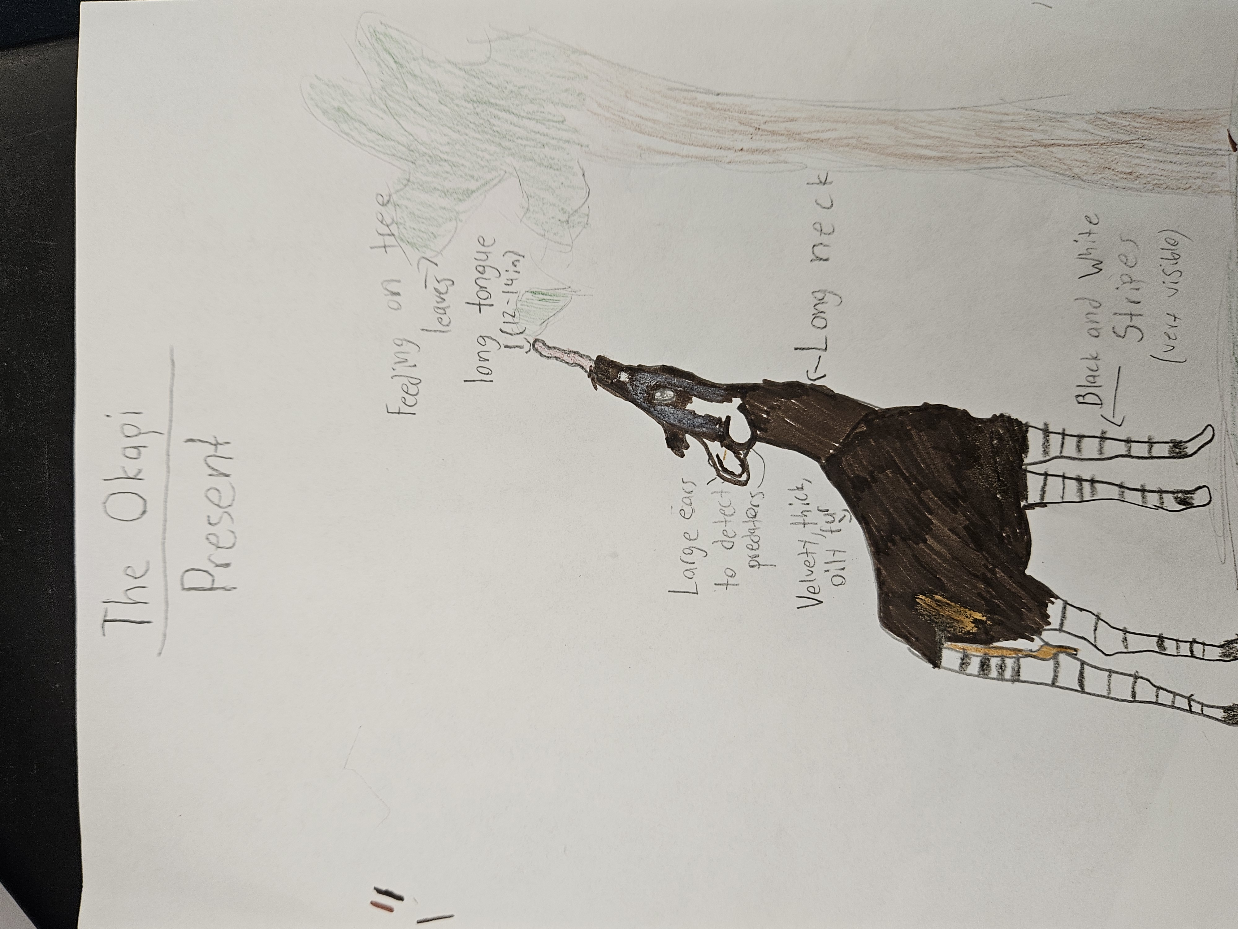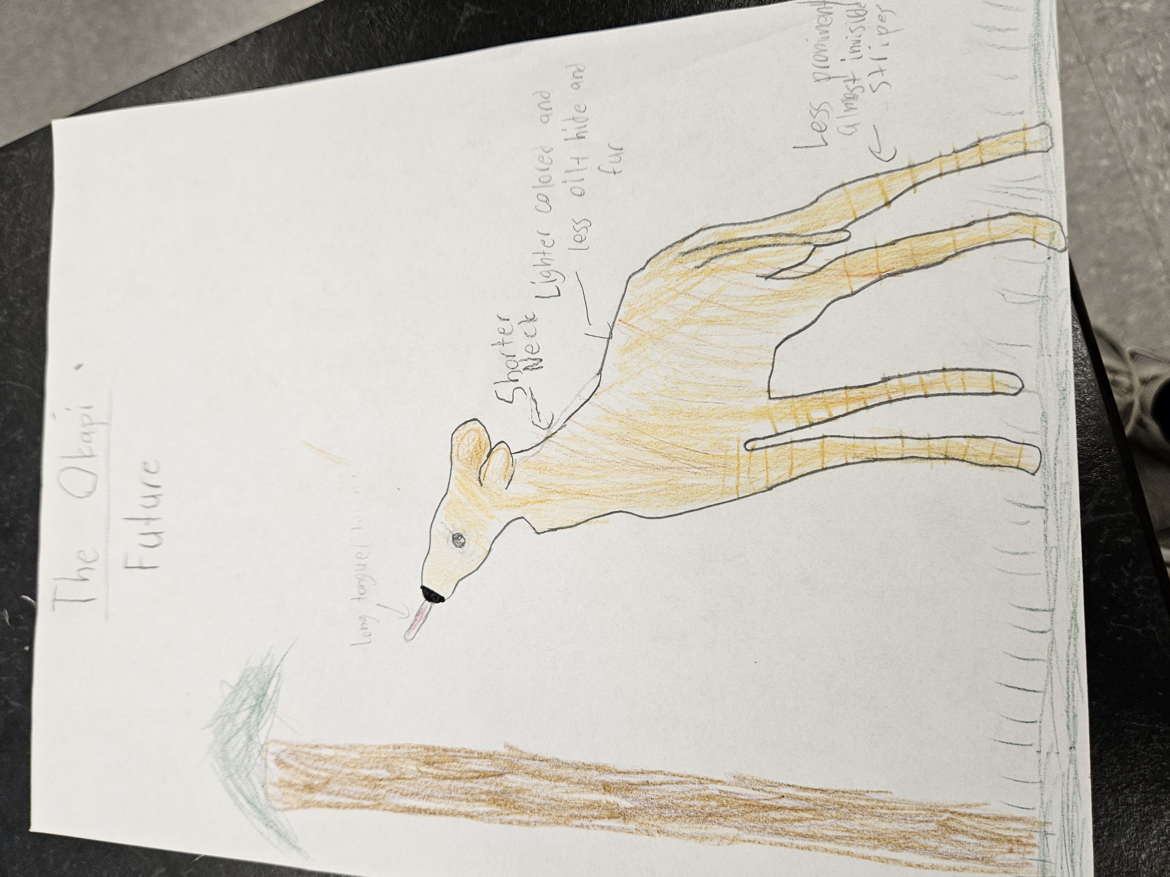In the future, I speculate the okapi could change in many ways. Due to degradation, the okapi’s habitat could become a savannah. This could cause the okapi to develop a shorter neck, a smaller size, less prominent stripes, and a lighter colored coat. These changes would happen due to the new environment not having the foods they’re used to consuming. The okapi could be forced to adapt to eating other things like grass which is why they will no longer need their long neck. Unfortunately, if the okapi doesn't adapt fast enough, it will most likely become extinct as it is already on the brink of extinction.