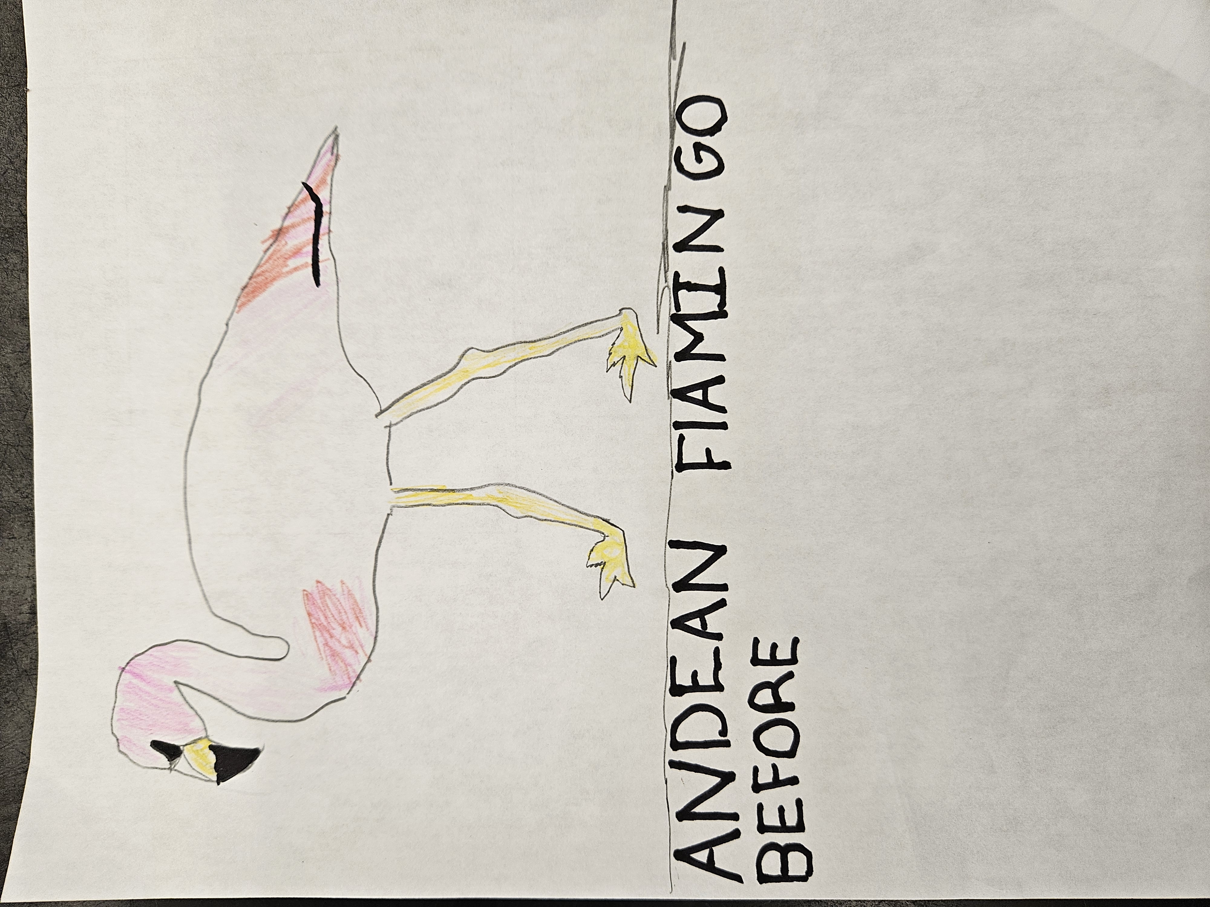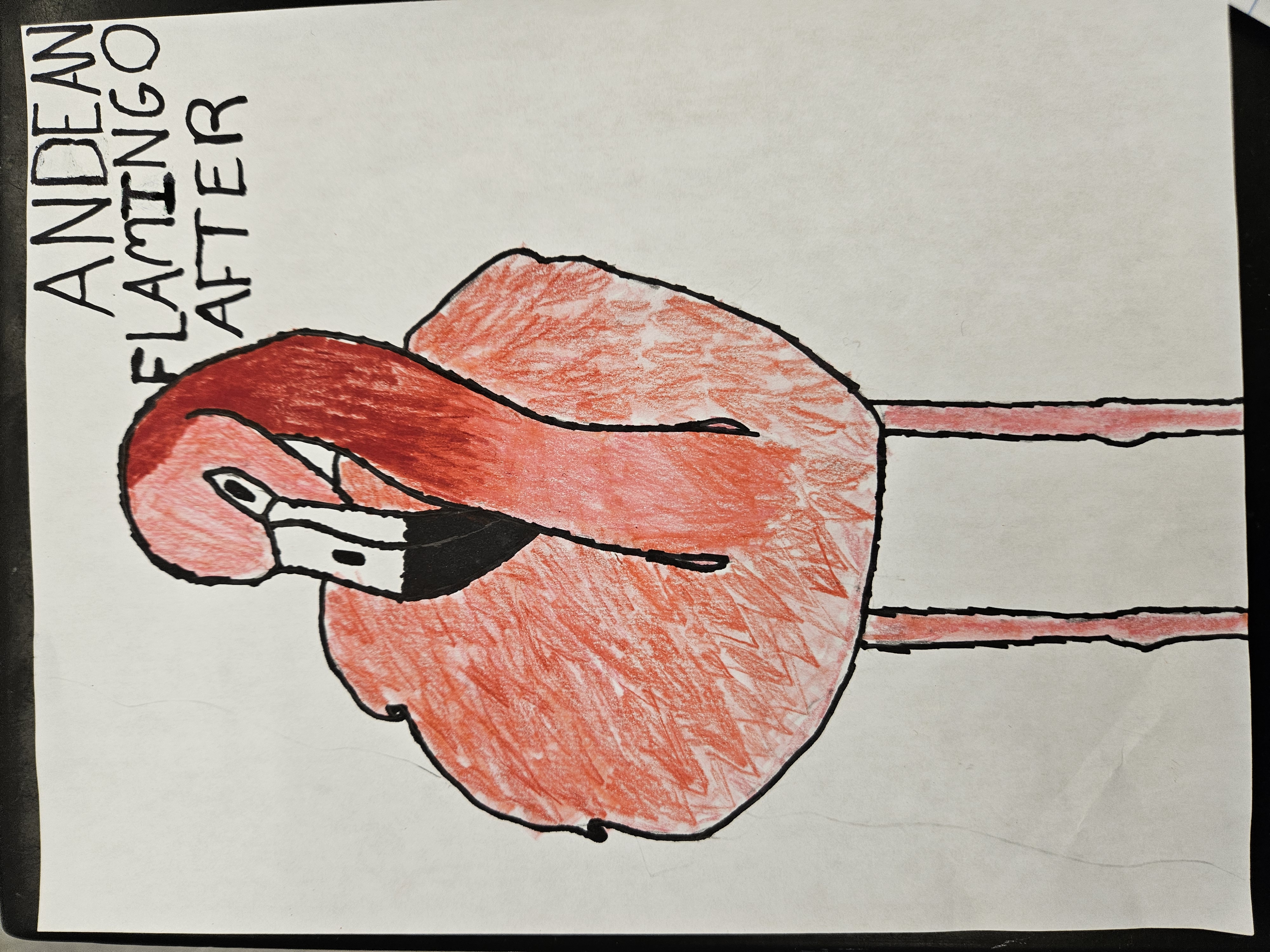 After climate change, human population, and pollution I think the Andean flamingo will change. I think they will get darker in color to blend in and will start breeding during winter due to hotter weathers. Although most adaptations will not change, I think some will.