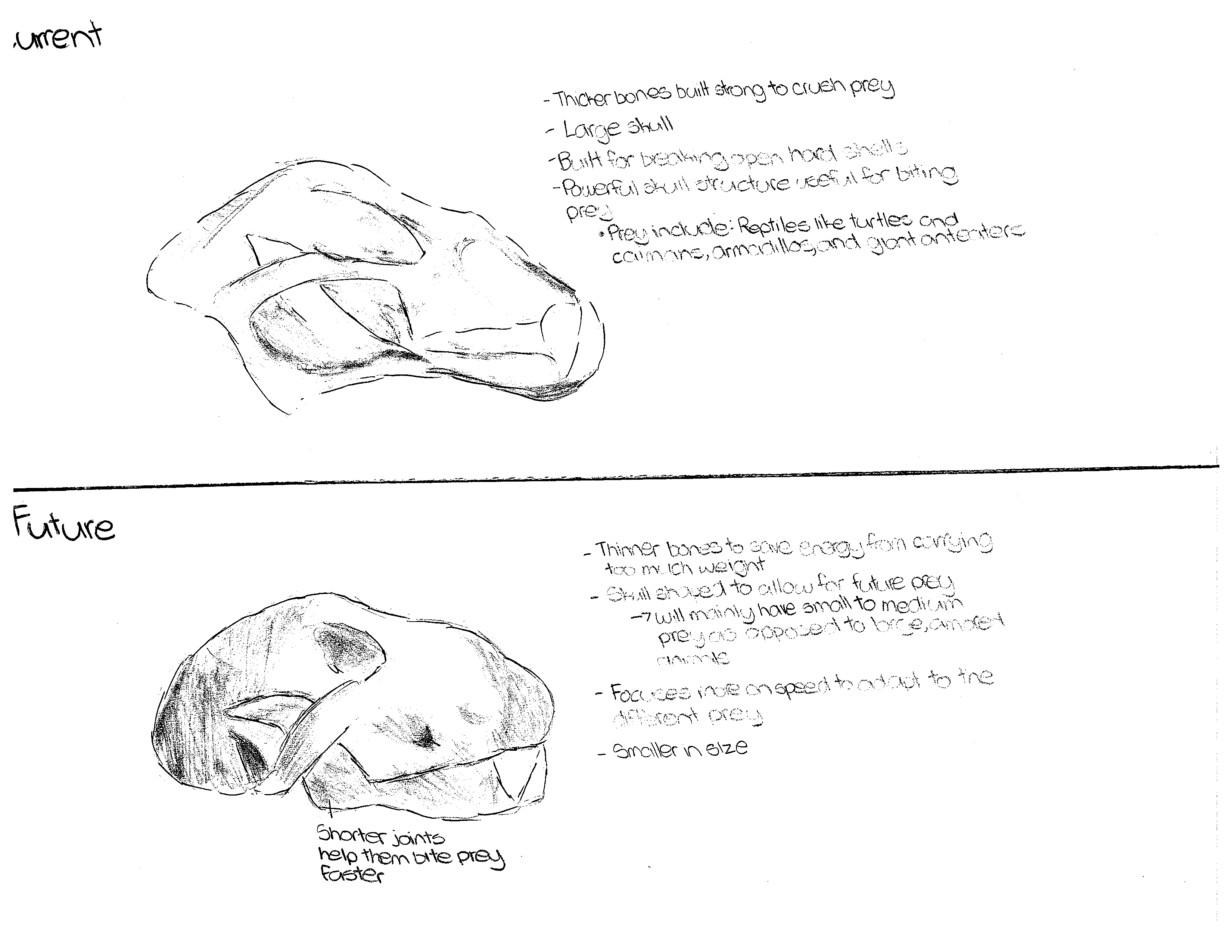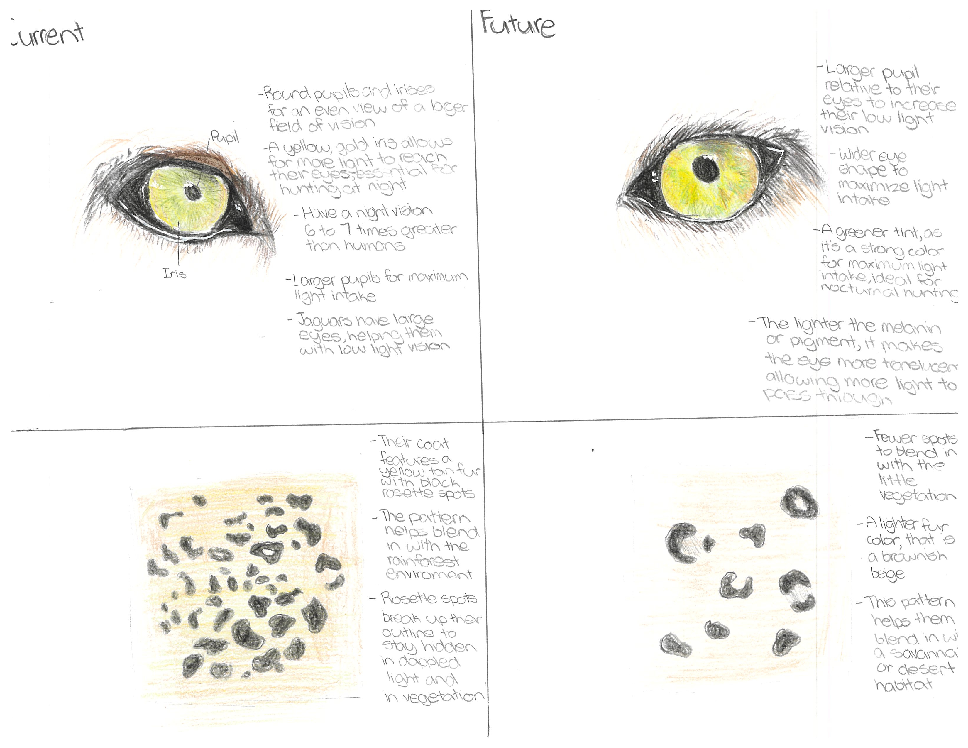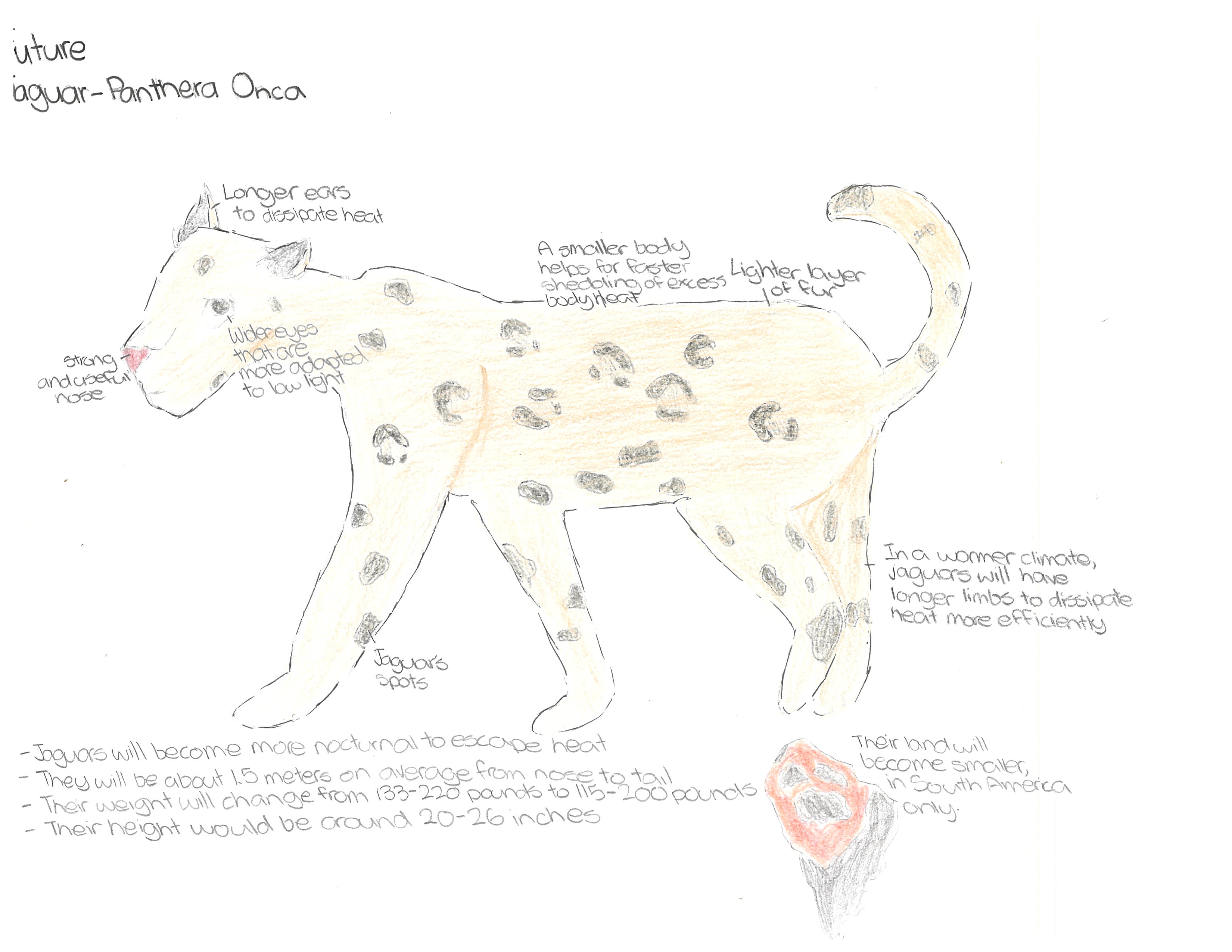 The jaguar (Panthera Onca), lives in rainforests in the Americas, like Brazil and Peru. With rising temperatures, jaguars will develop longer limbs and ears, with a smaller body to dissipate heat more efficiently. In a warmer climate, jaguars will hunt at night to avoid heat. They will also have wider eyes that adapt better to minimum light. Their eyes will feature a larger pupil, with green irises. Jaguars will have a lighter layer of sandy beige fur, with fewer spots to blend in with less vegetation. Prey changes from large, armored animals to fast, smaller animals as a result of their current prey declining from habitat loss and degradation. Smaller animals and livestock will become more popular in their ecosystems. Therefore, their skulls will become smaller, with shorter joints to adapt to their new prey. To save energy, the jaguar's skull will become lighter, to avoid carrying a heavy head.