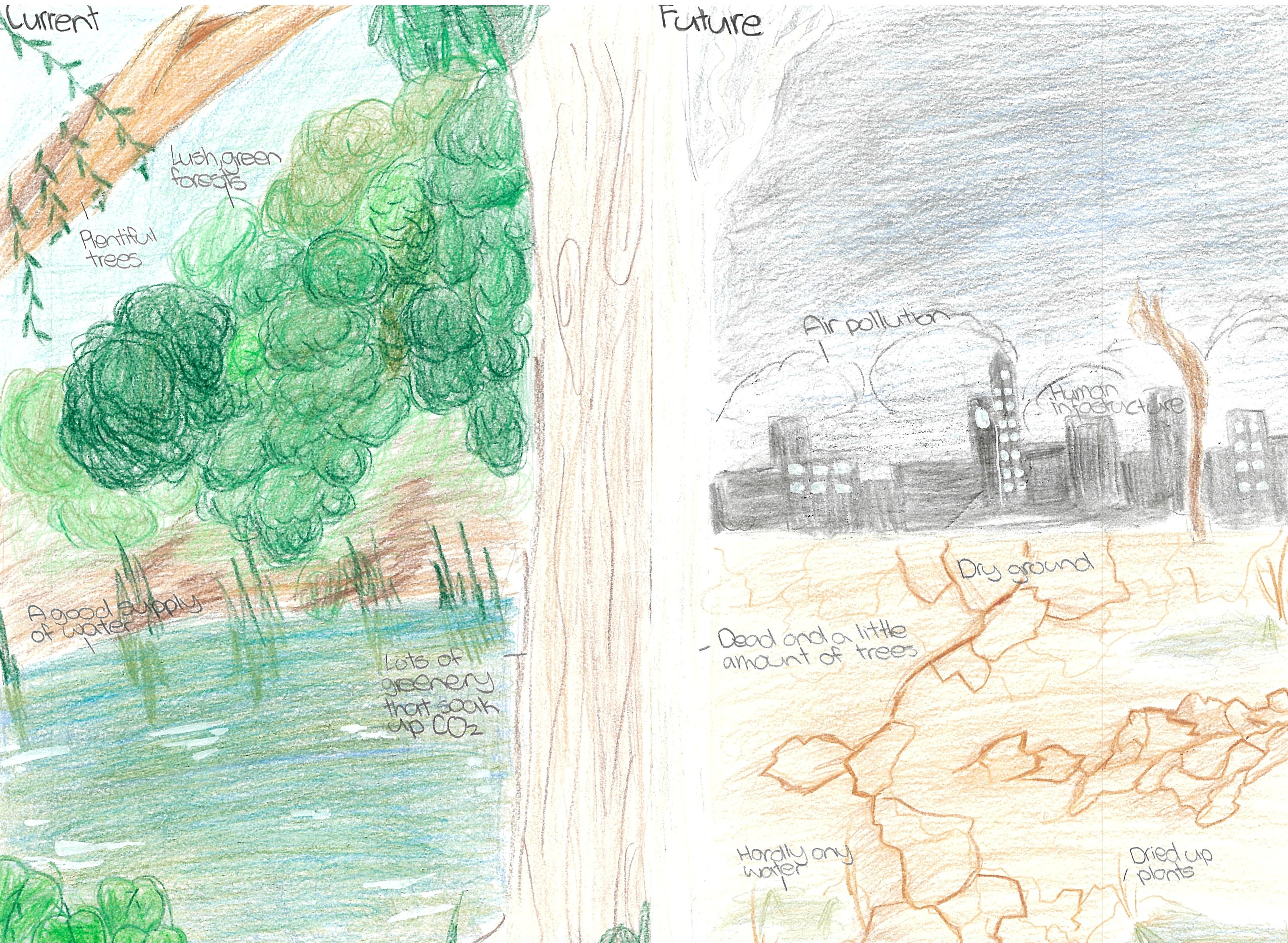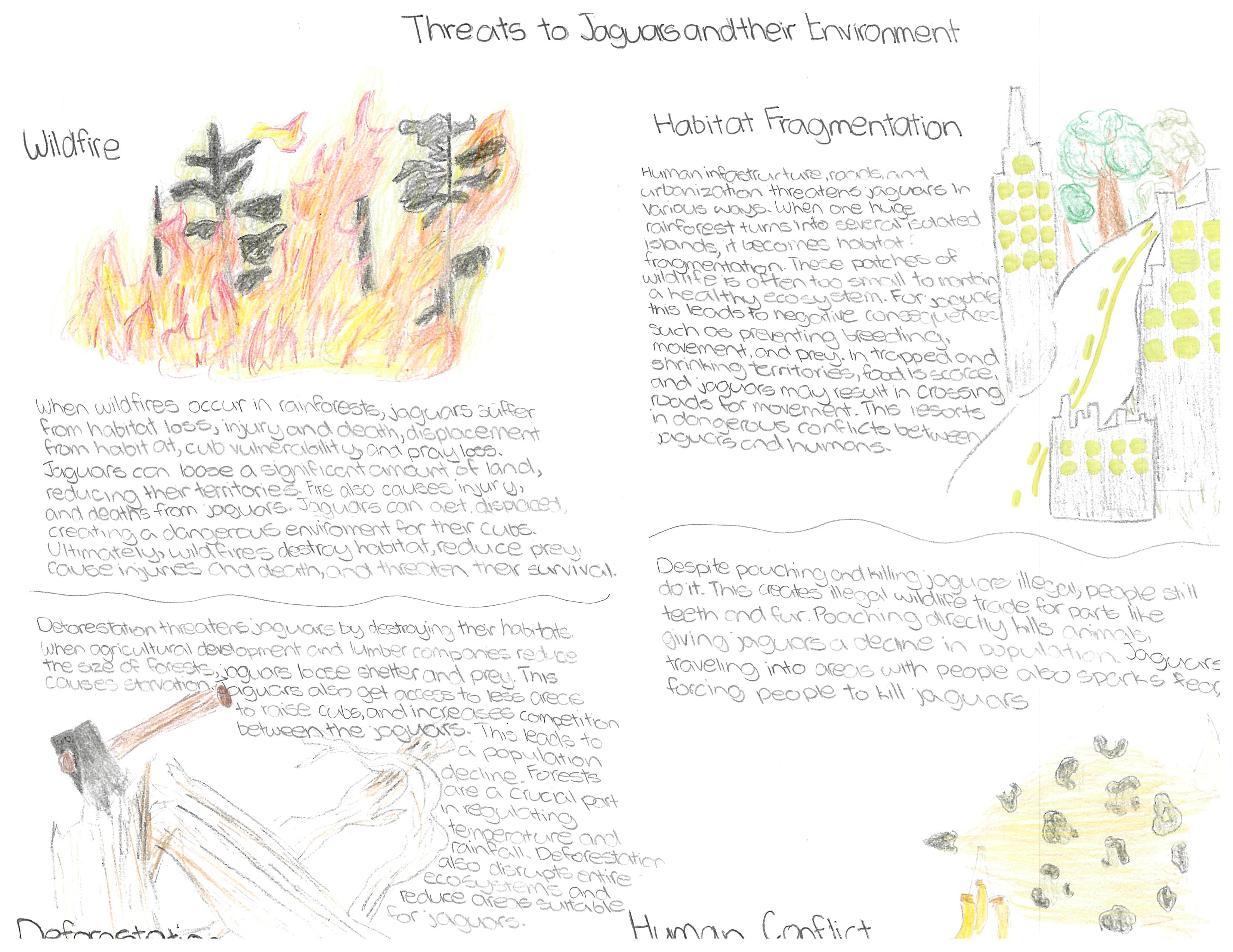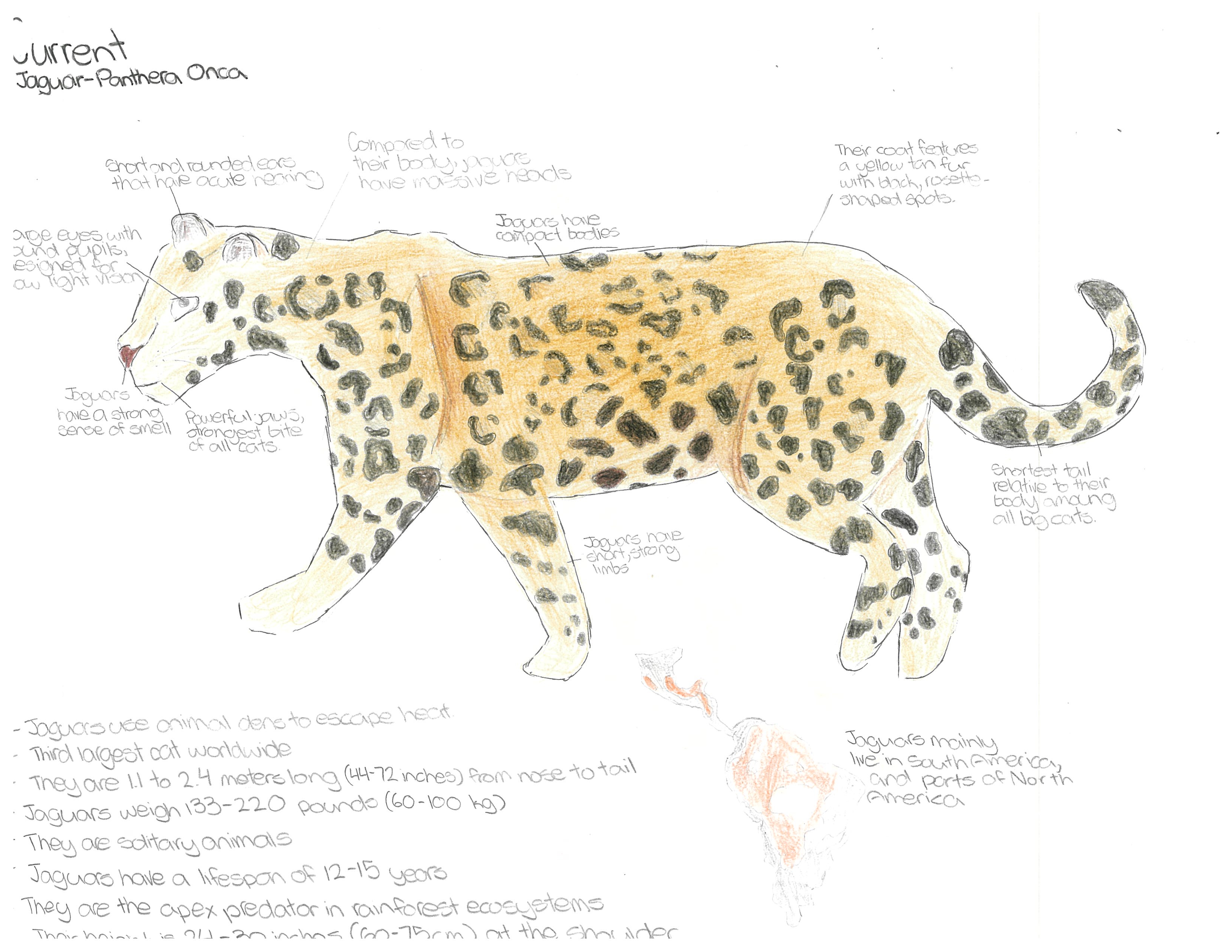 The jaguar (Panthera Onca), lives in rainforests in the Americas, like Brazil and Peru. With rising temperatures, jaguars will develop longer limbs and ears, with a smaller body to dissipate heat more efficiently. In a warmer climate, jaguars will hunt at night to avoid heat. They will also have wider eyes that adapt better to minimum light. Their eyes will feature a larger pupil, with green irises. Jaguars will have a lighter layer of sandy beige fur, with fewer spots to blend in with less vegetation. Prey changes from large, armored animals to fast, smaller animals as a result of their current prey declining from habitat loss and degradation. Smaller animals and livestock will become more popular in their ecosystems. Therefore, their skulls will become smaller, with shorter joints to adapt to their new prey. To save energy, the jaguar's skull will become lighter, to avoid carrying a heavy head.